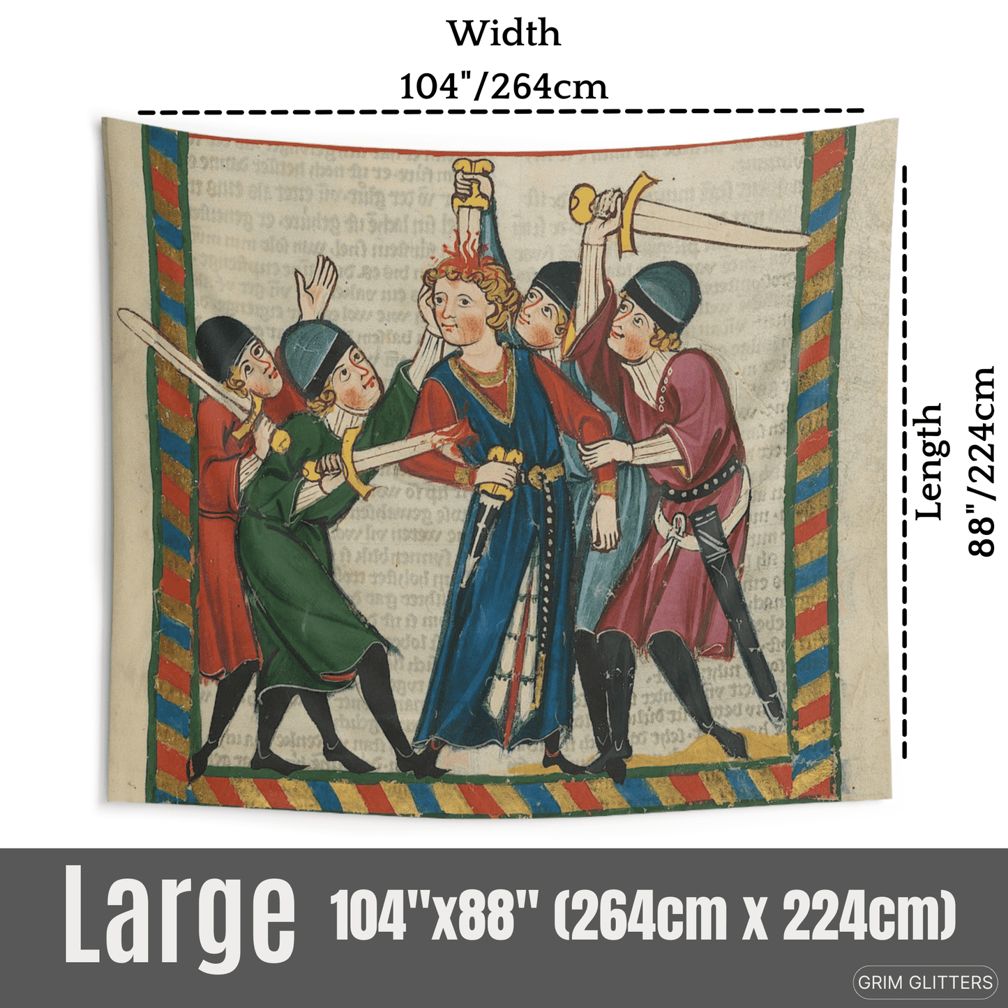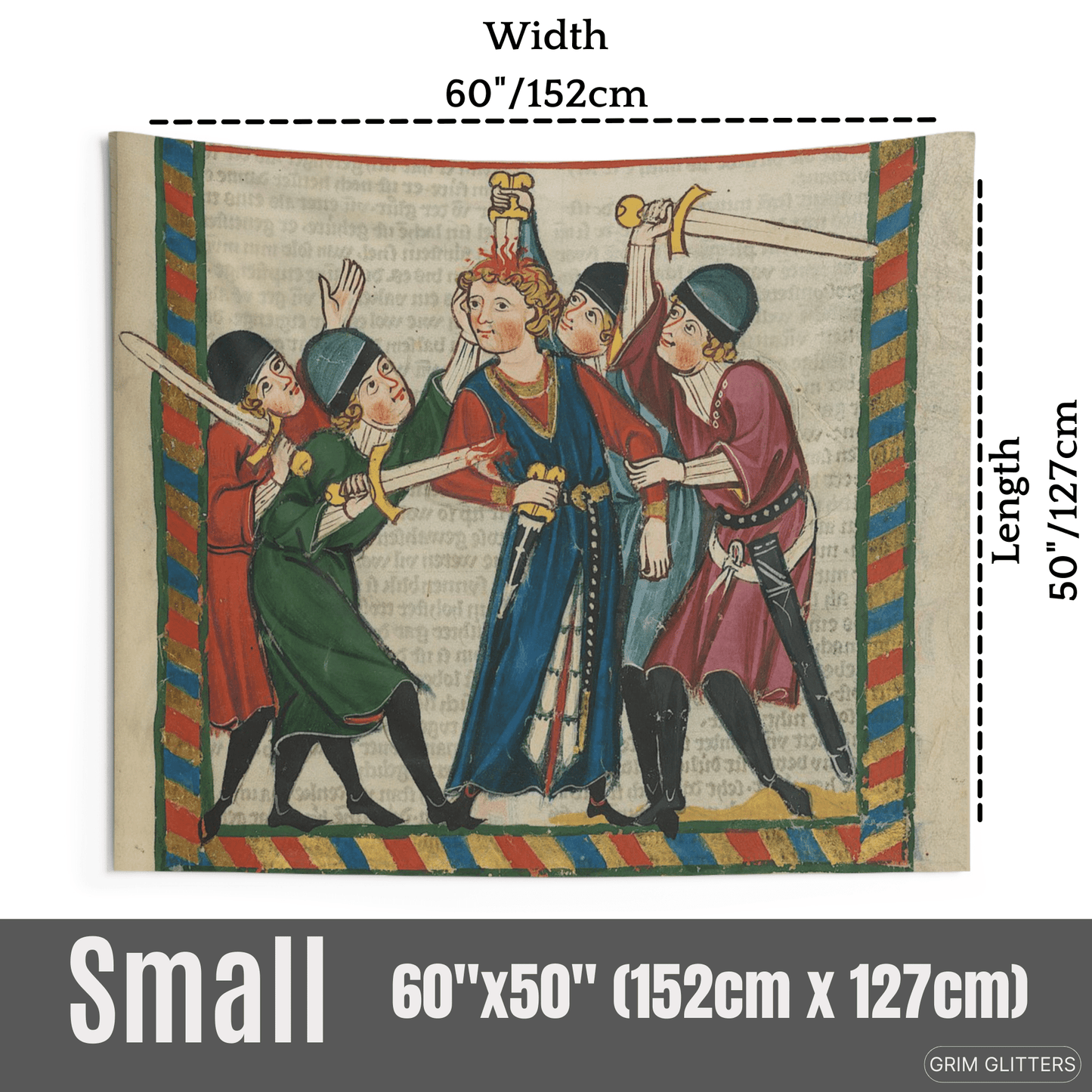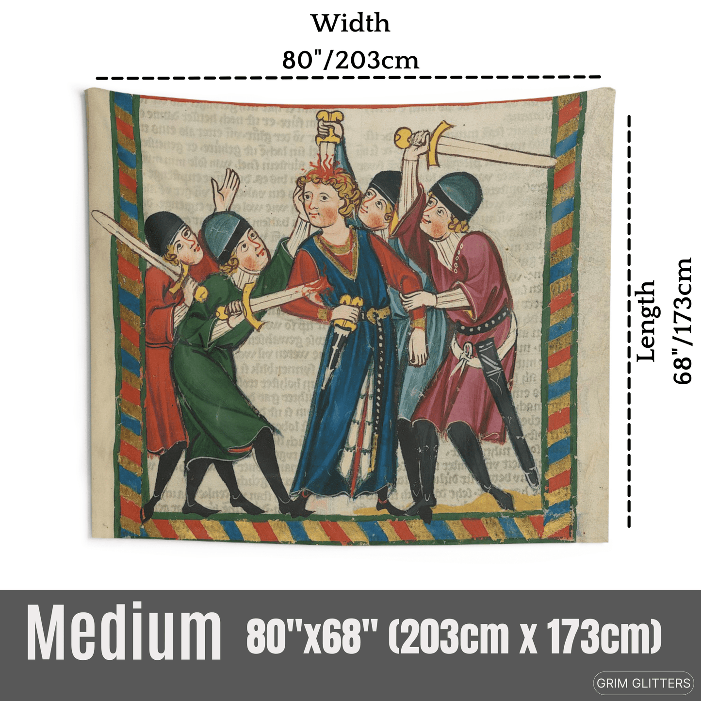 Enrich your space with this evocative tapestry that brings the stark realities of the Middle Ages into your home. The depiction of Herr Reinmar von Brennenberg adds an element of historical drama and artistry to your decor.
