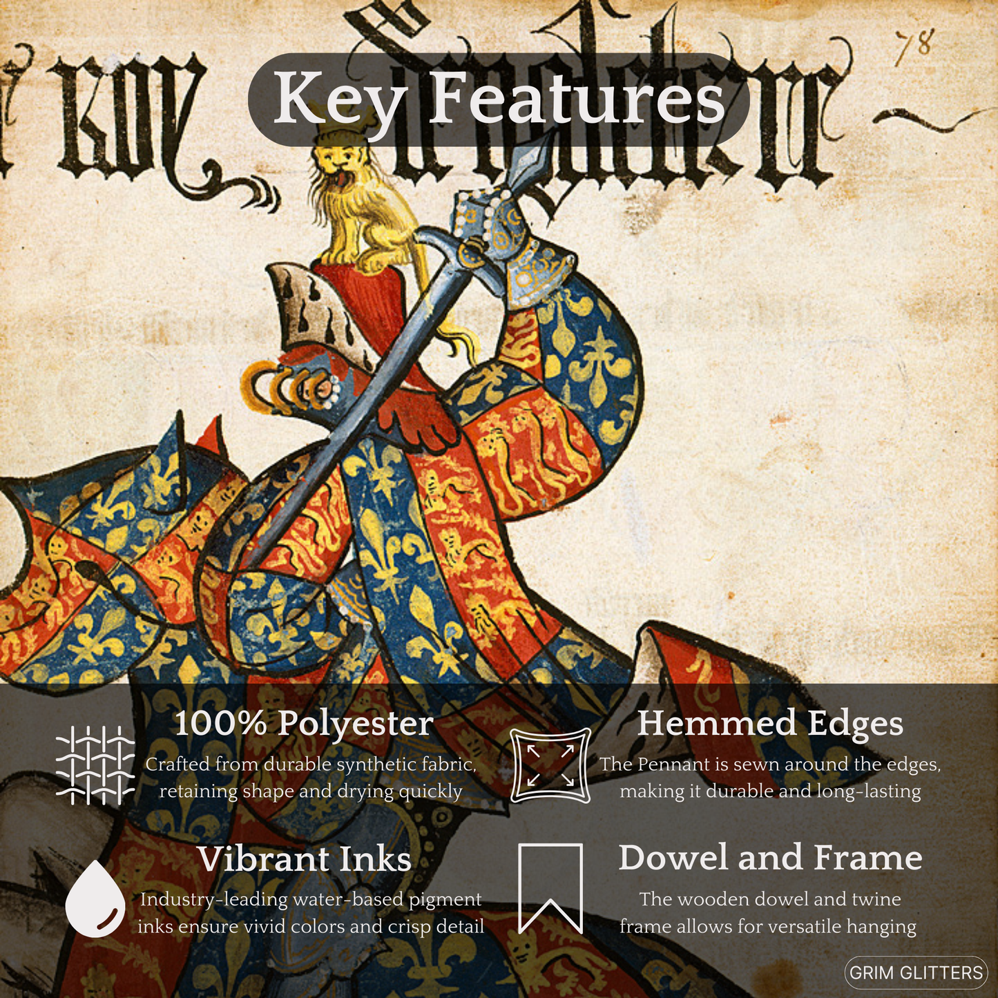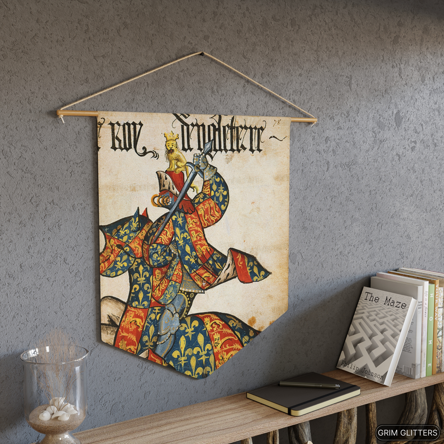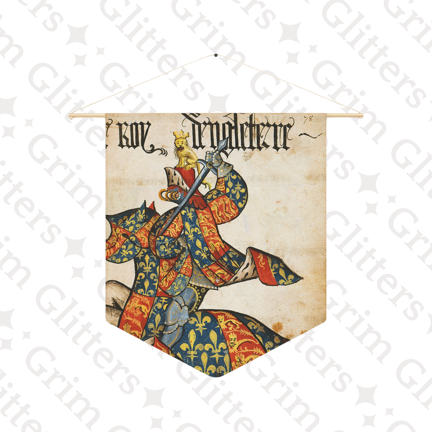 Celebrate the regal legacy of the King of England with this stunning pennant banner, inspired by the Great Equestrian Armorial of the Golden Fleece. Featuring a majestic design of lions and fleurs-de-lis in bold red and blue hues, this banner encapsulates the power and grandeur of English royalty. Perfect for medieval enthusiasts, history lovers, and admirers of noble heraldry.