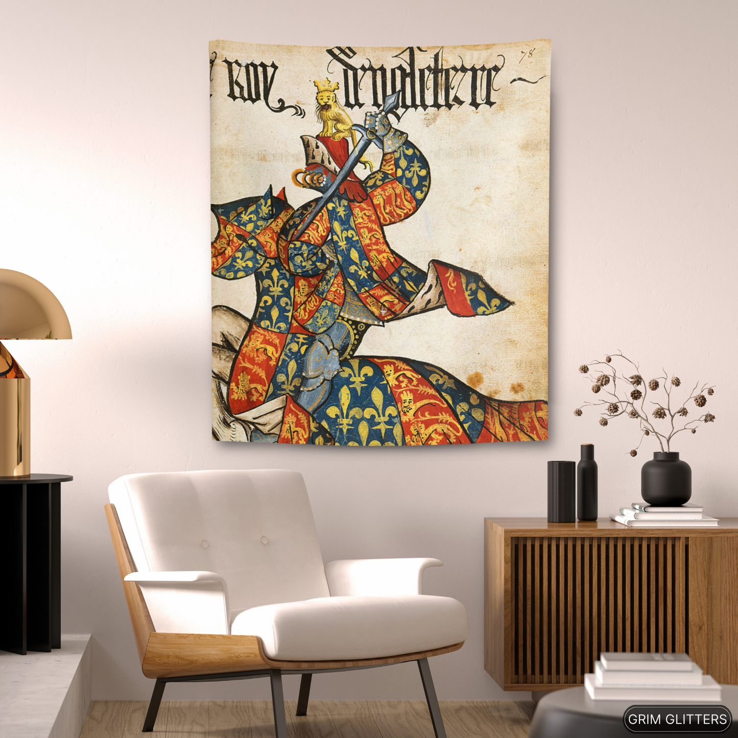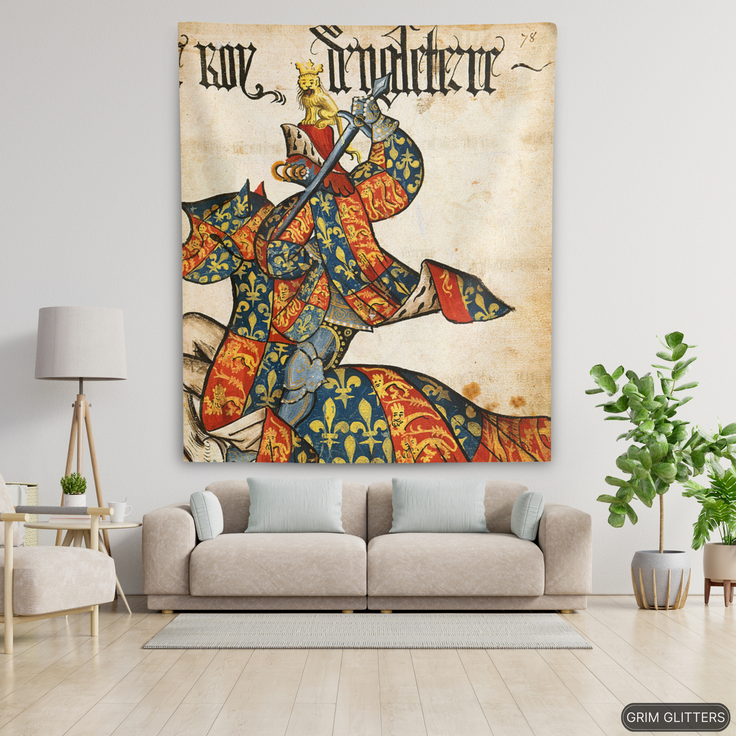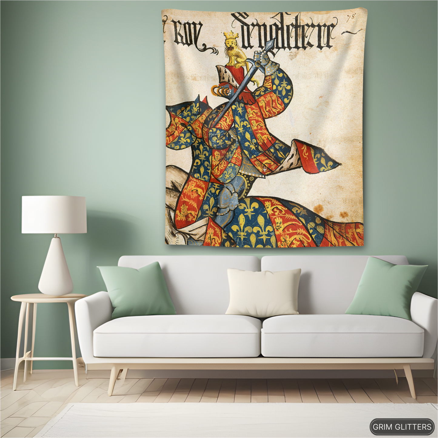 This tapestry pays tribute to medieval kingship, chivalric tournaments, and the authority of the English crown. Whether displayed in a study, library, or grand hall, it adds timeless majesty and historical depth to your decor.