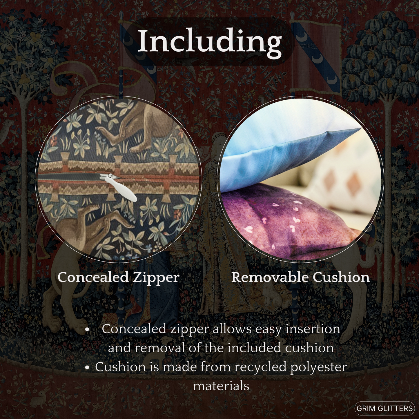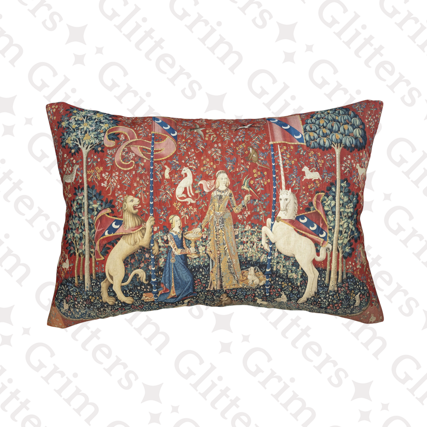 Enhance your home with the historical and mystical charm of our Lady and the Unicorn (Taste) Lumbar Pillow. Perfect for gifting or as a cherished addition to your own collection, this enchanting throw pillow adds a touch of medieval elegance and artistic beauty to any space.
