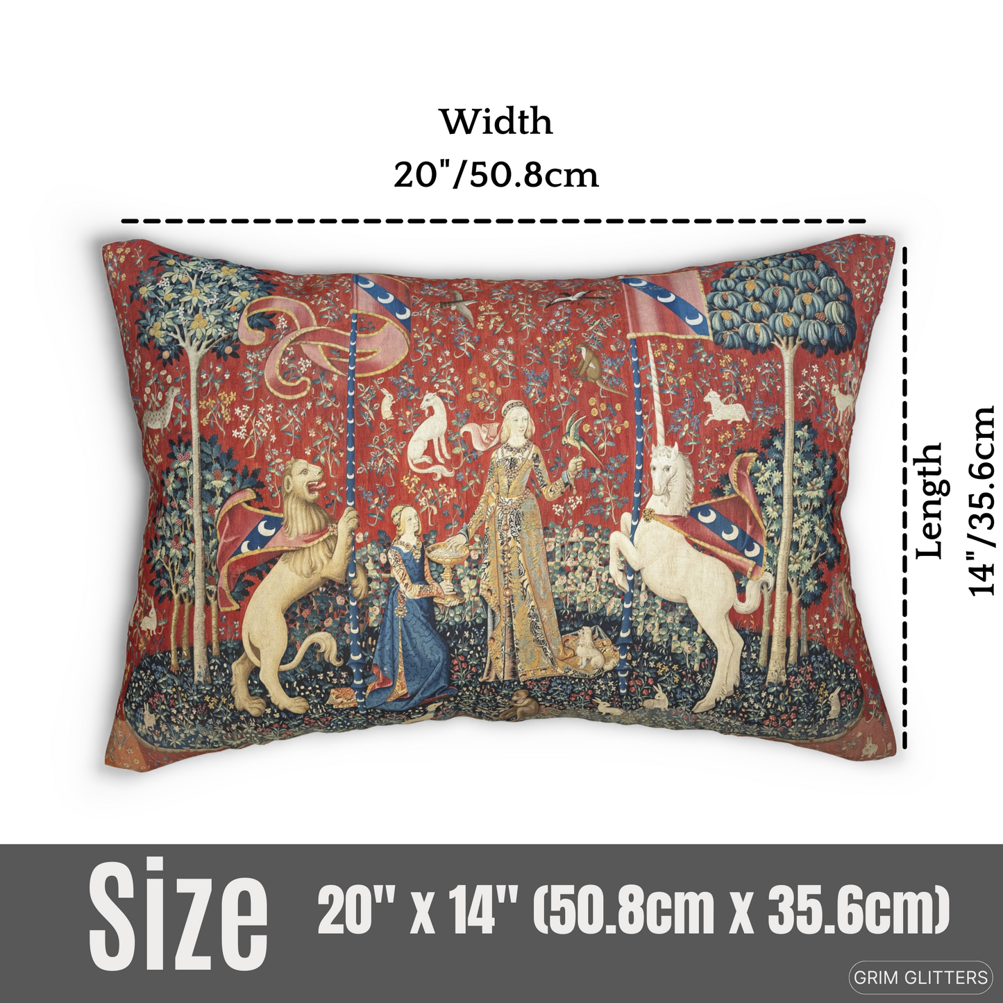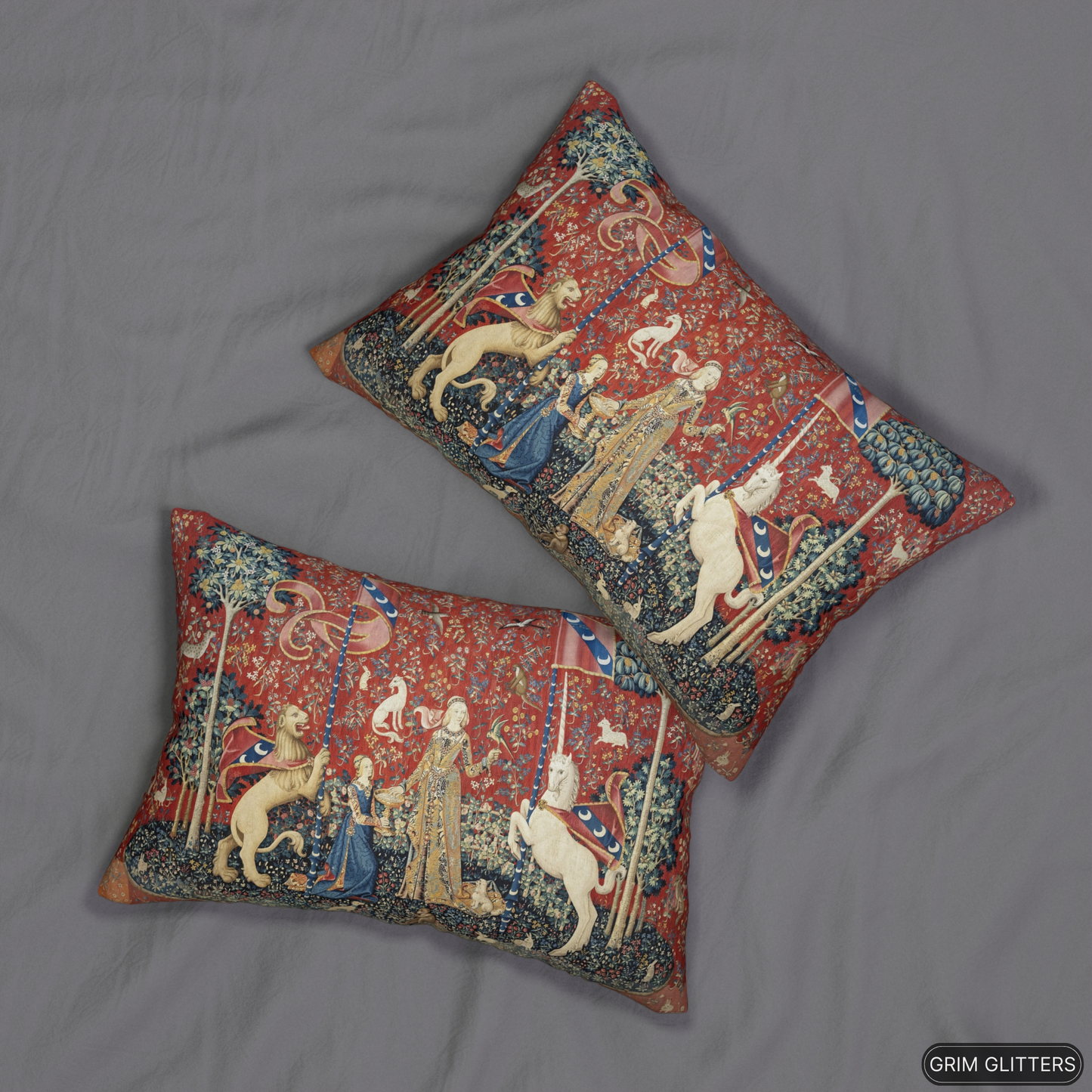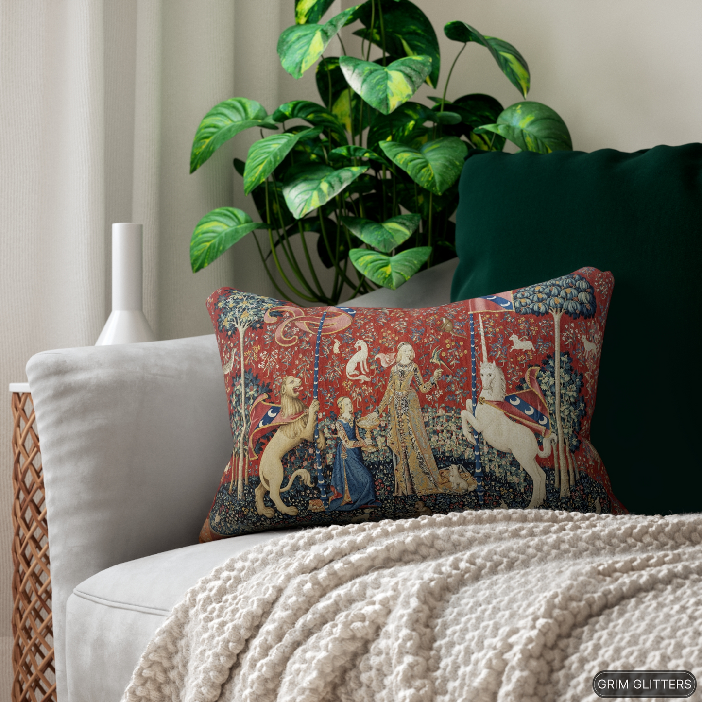 Elevate your home decor with the enchanting beauty of medieval art through our Lady and the Unicorn (Taste) Lumbar Pillow. Inspired by the iconic Unicorn Tapestry, this captivating pillow brings a touch of historical charm and mystical allure to any room.