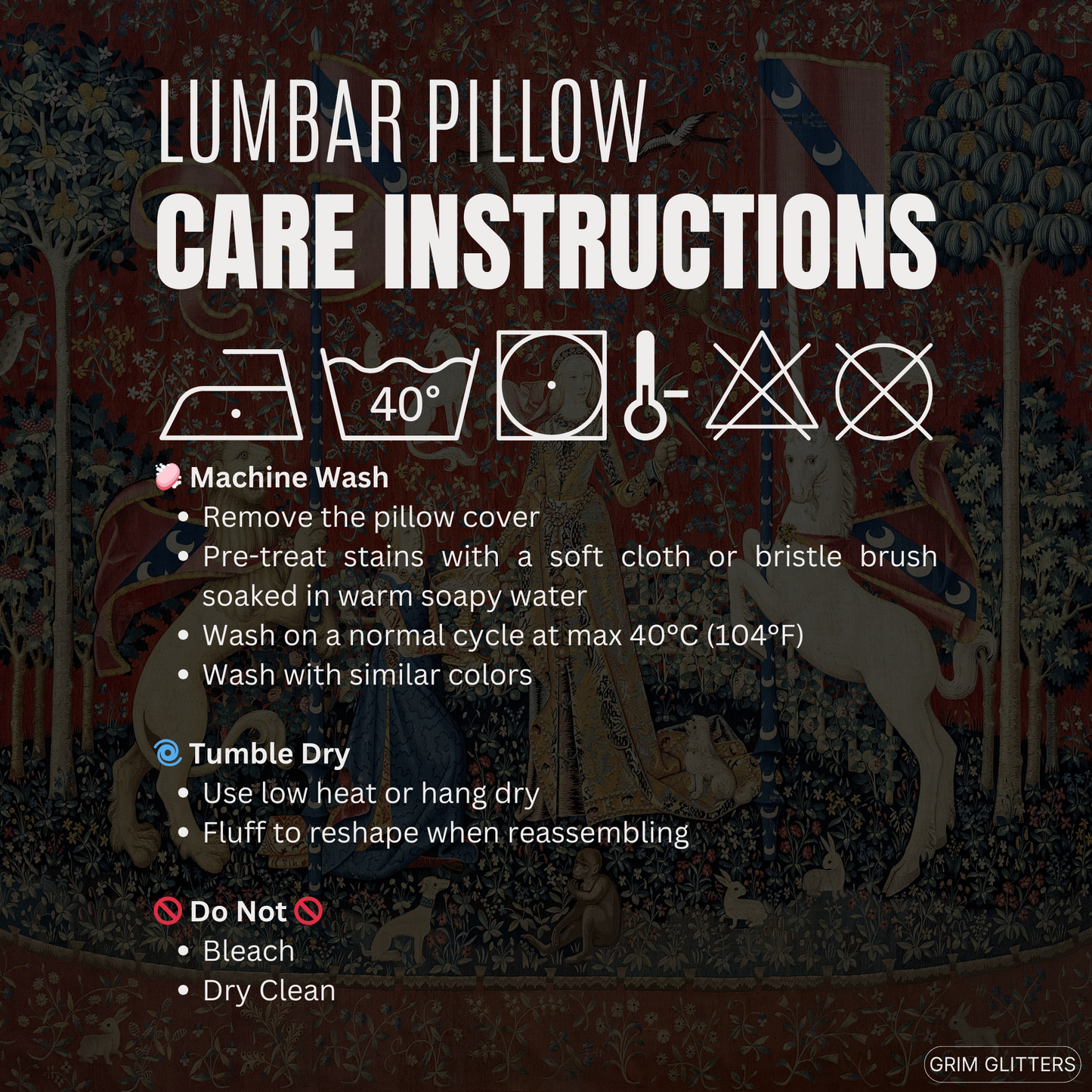 Maintaining the beauty of your Lady and the Unicorn pillow is simple. Remove the cover and pre-treat any stains with a soft cloth or bristle brush soaked in warm soapy water. Machine wash on a normal cycle at a maximum of 40°C (104°F). Do not bleach, tumble dry on low, and avoid dry-cleaning. Iron, steam, or dry on low heat only. Fluff the insert to reshape when reassembling.
