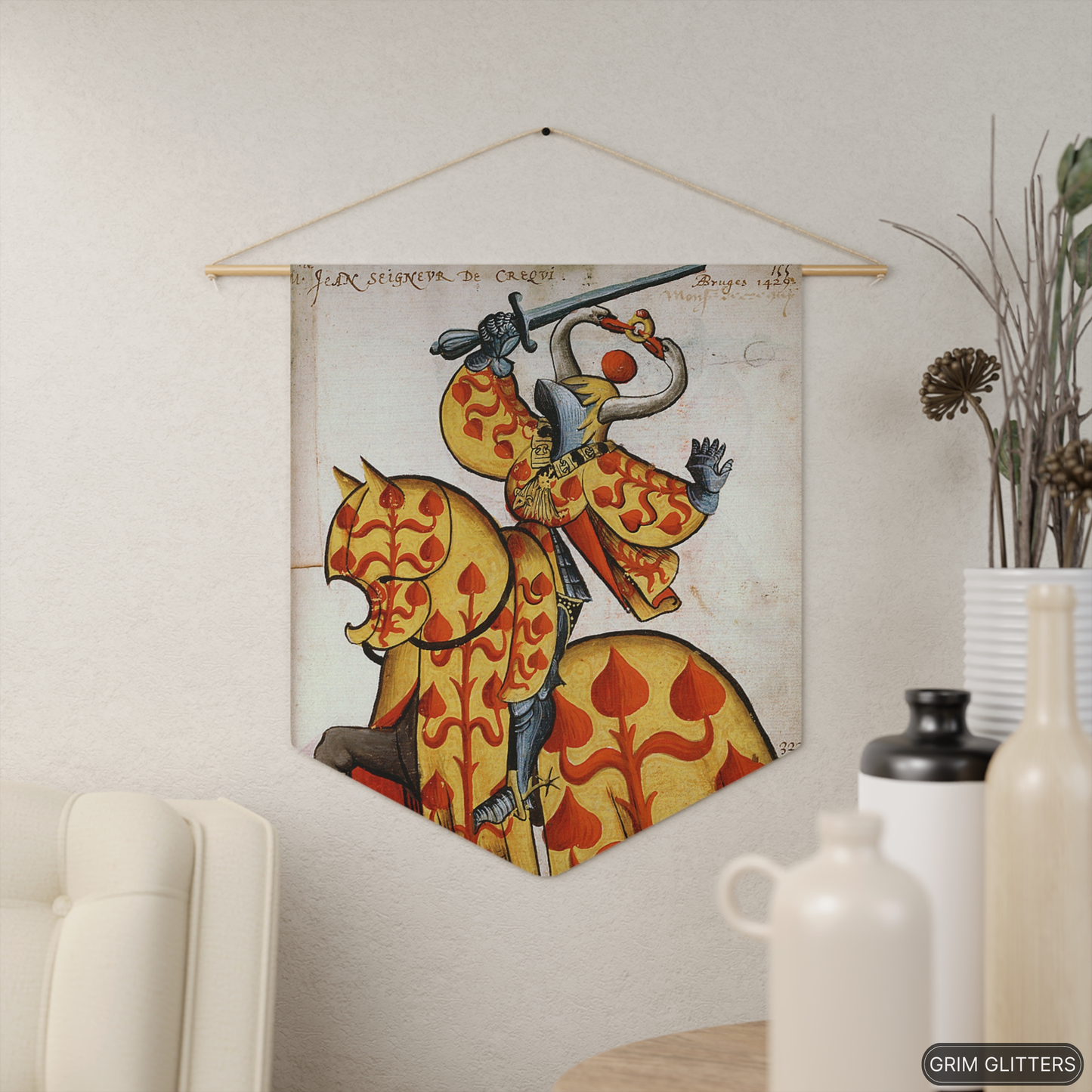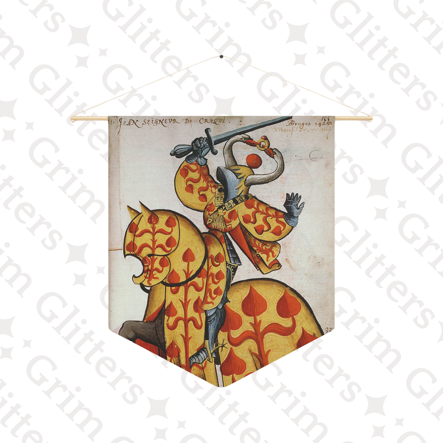 Honor the legacy of Jean de Créquy, Lord of Crequi, with this vibrant pennant banner inspired by the Great Equestrian Armorial of the Golden Fleece. This design features Jean in bold yellow and red heraldic robes adorned with elegant fleur-de-lis-like patterns, symbolizing nobility and prestige. Atop his helm is a striking crest with two swan heads holding a ring, a symbol of unity, grace, and strength.