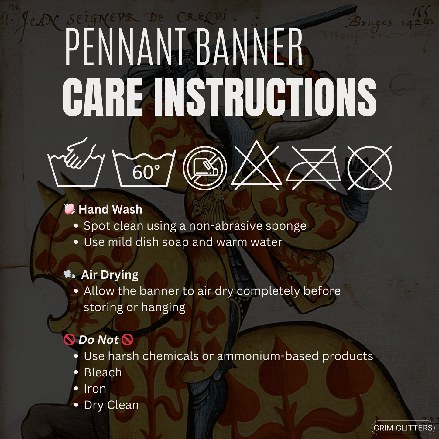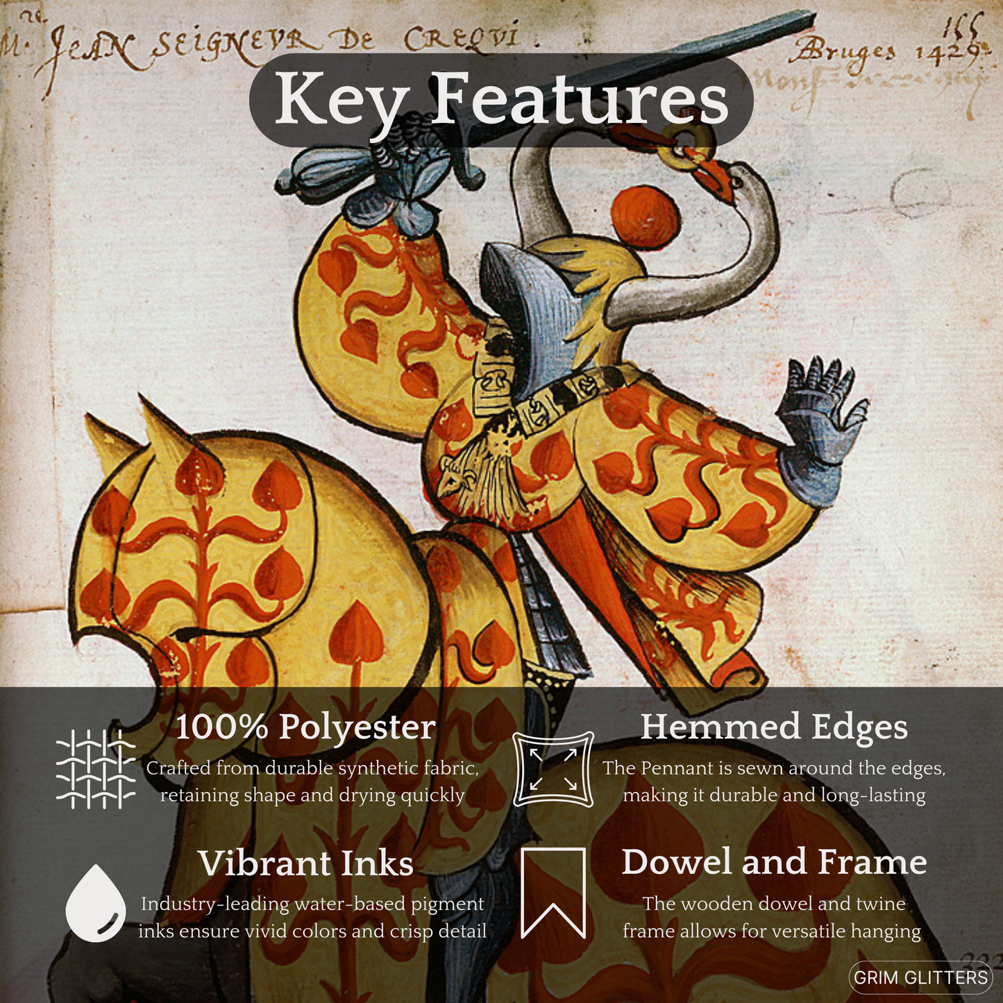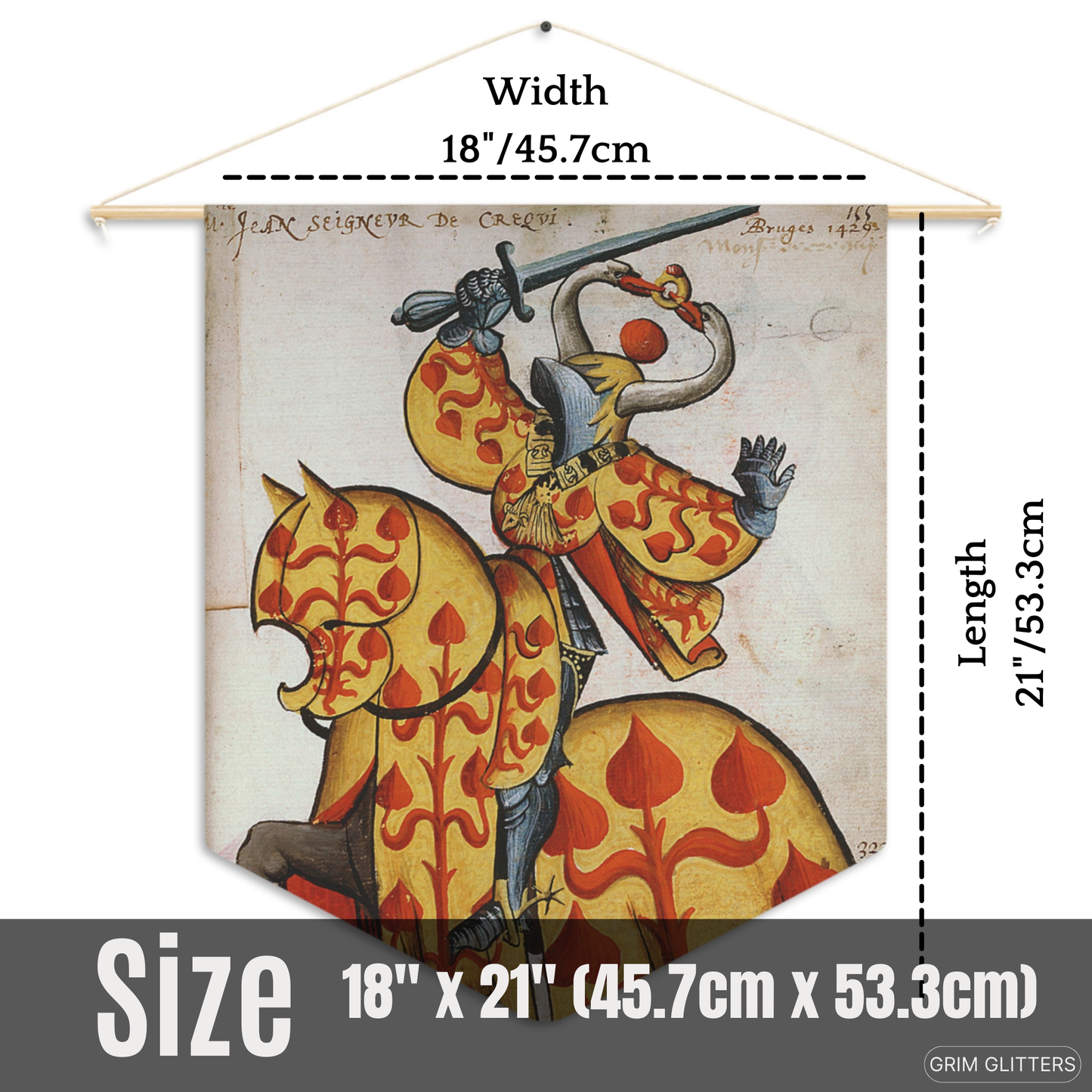 Printed on durable polyester twill fabric, this 18" × 21" (45.7cm × 53.3cm) pennant is hemmed for a polished and professional appearance, combining medieval artistry with modern durability. 🔗 Ready to Hang Includes a wooden dowel and twine for quick and effortless display in your home, office, or event decor.