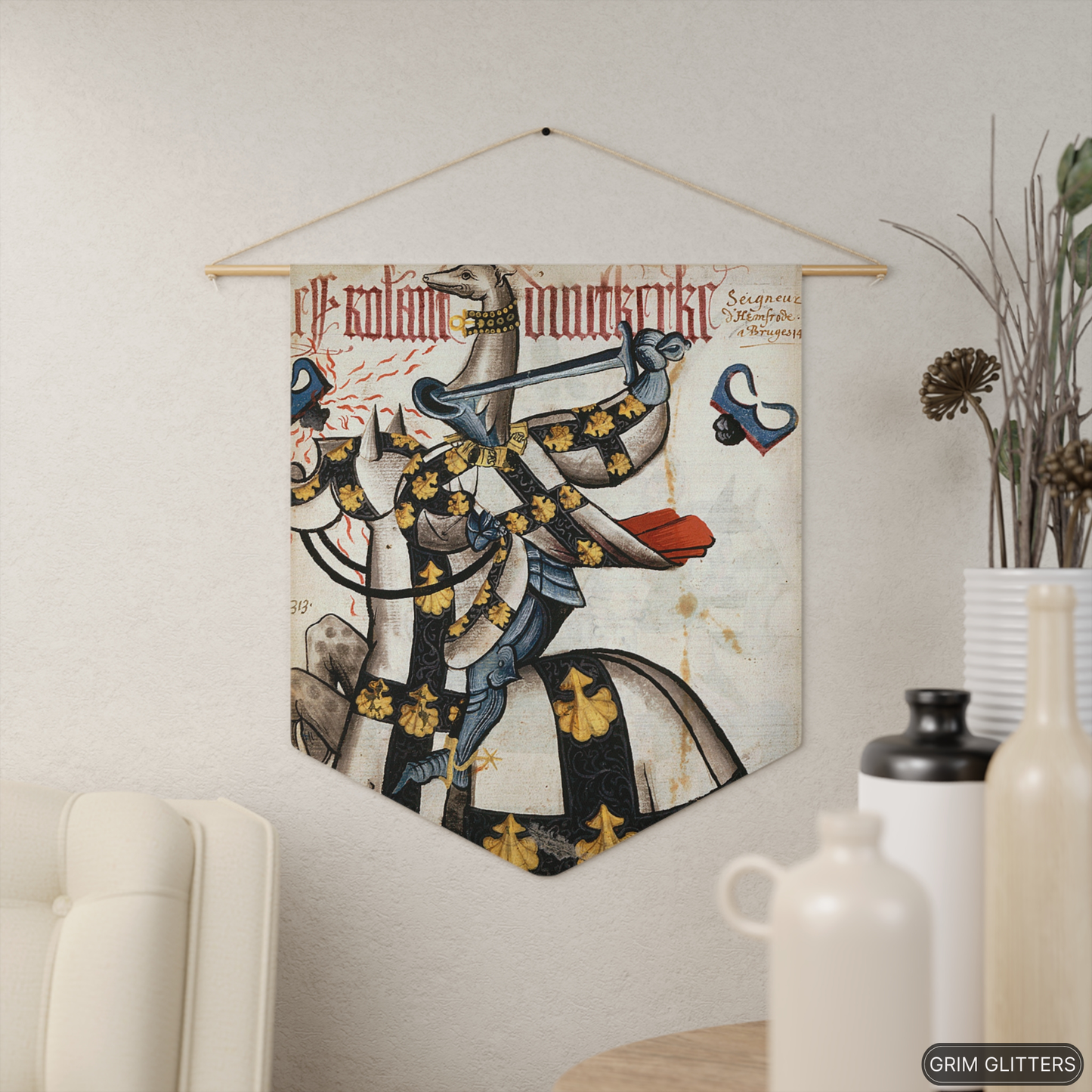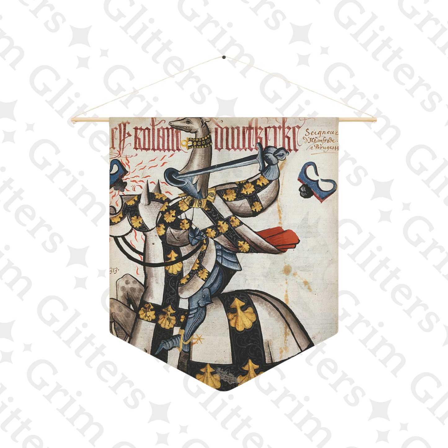 Celebrate the noble legacy of Roland of Uutkerke, Lord of Heestert, with this striking pennant banner. Featuring bold black and gold heraldry on a white field, it showcases the fleur-de-lis motif and intricate patterns symbolic of prestige and loyalty. Topped with a stately greyhound-head helm, this banner captures the splendor of medieval tournament regalia.