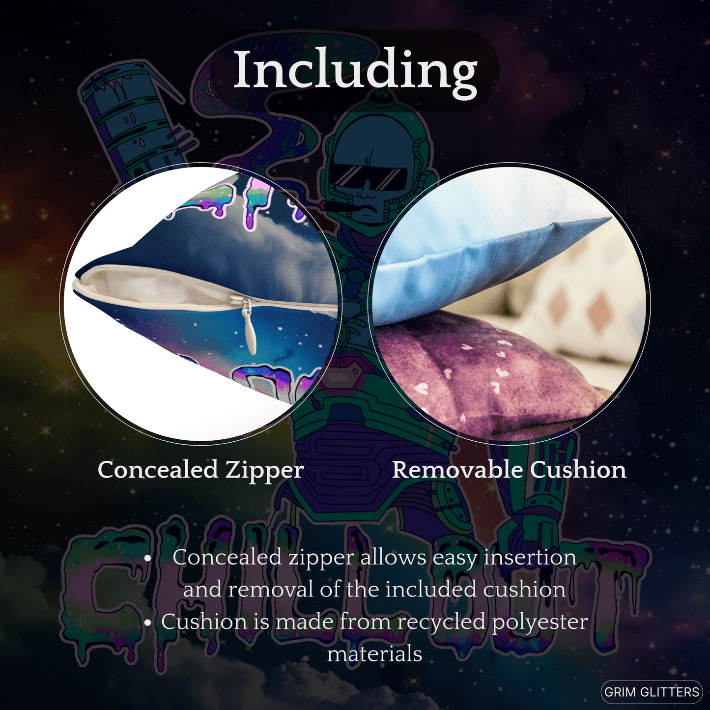 Enhance your home with the funky and cosmic charm of our Chill Out Square Pillow. Perfect for gifting or as a cherished addition to your own collection, this unique throw pillow adds a touch of artistic flair and cool vibes to any space.