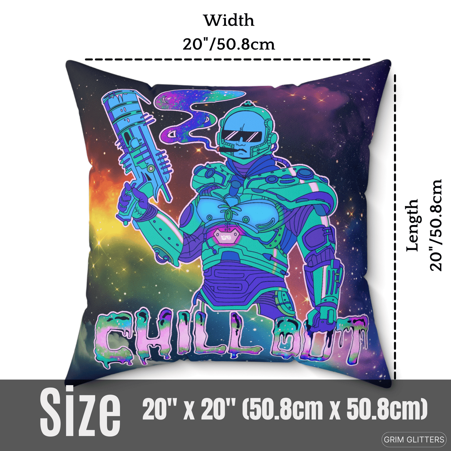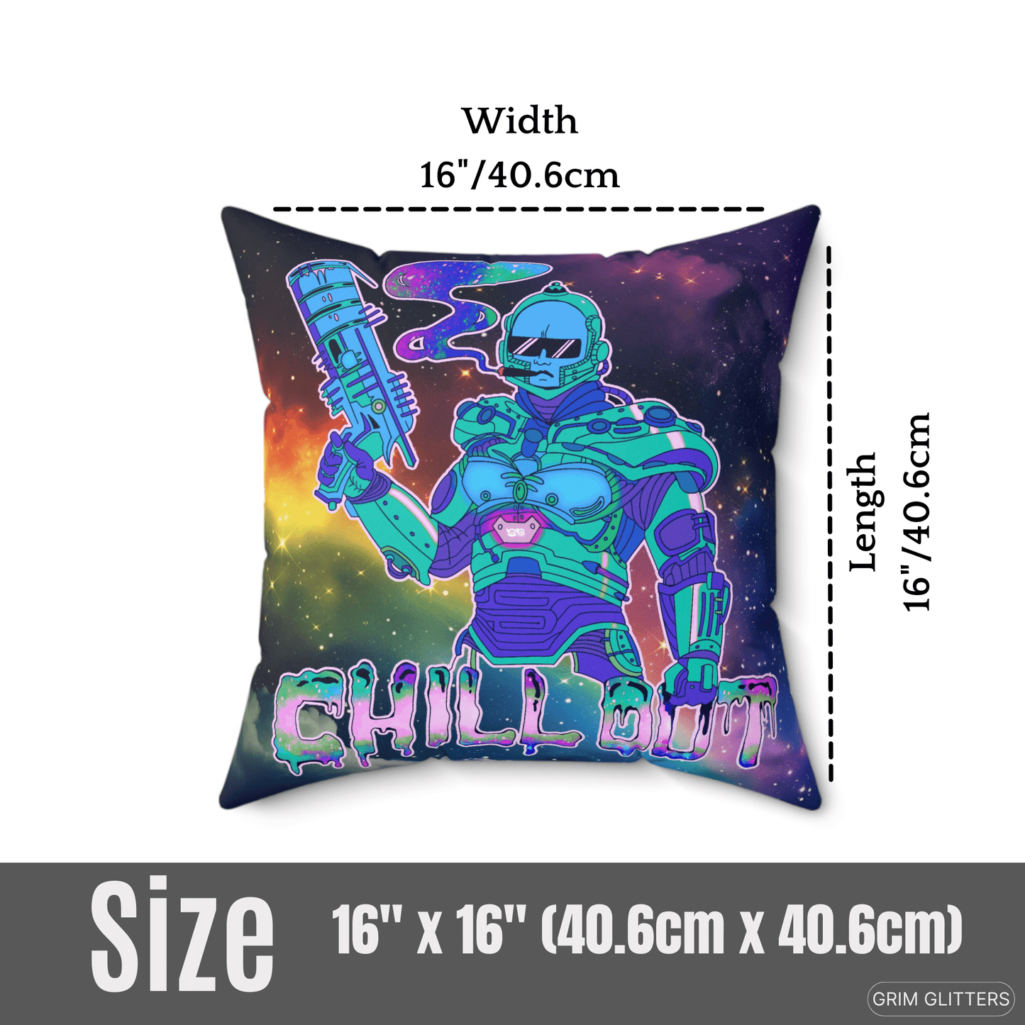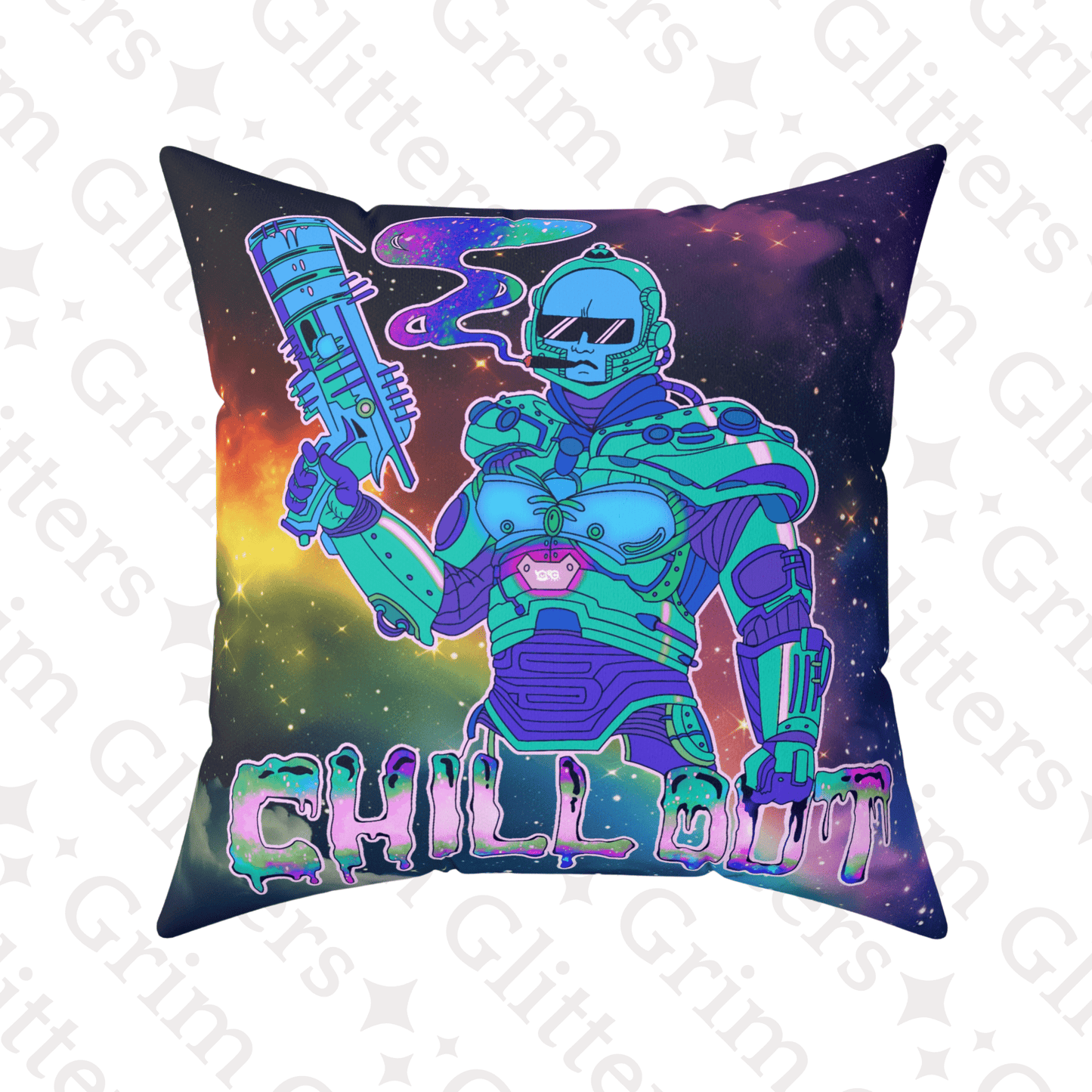 Add a touch of cosmic chillings to your home with our Chill Out Square Pillow. Featuring a groovy Dr. Freeze inspired dude wearing sunglasses and smoking a thicc one, this pillow combines futuristic flair with a funky vibe.