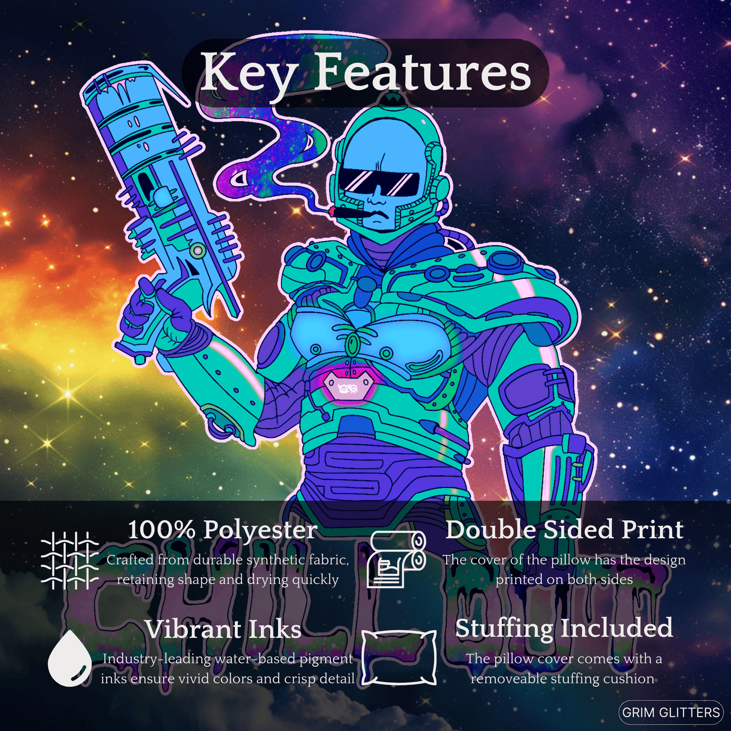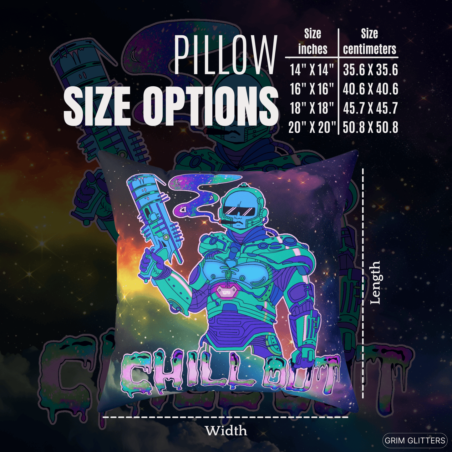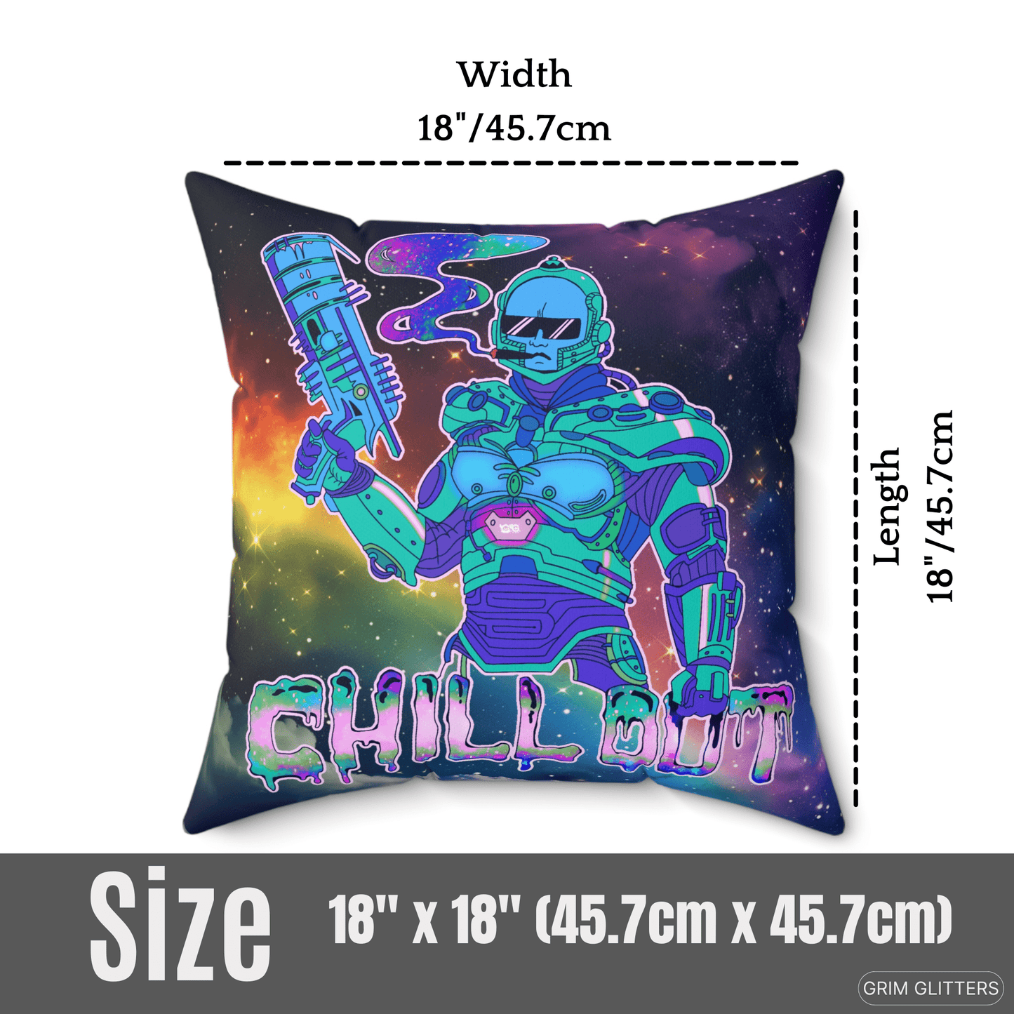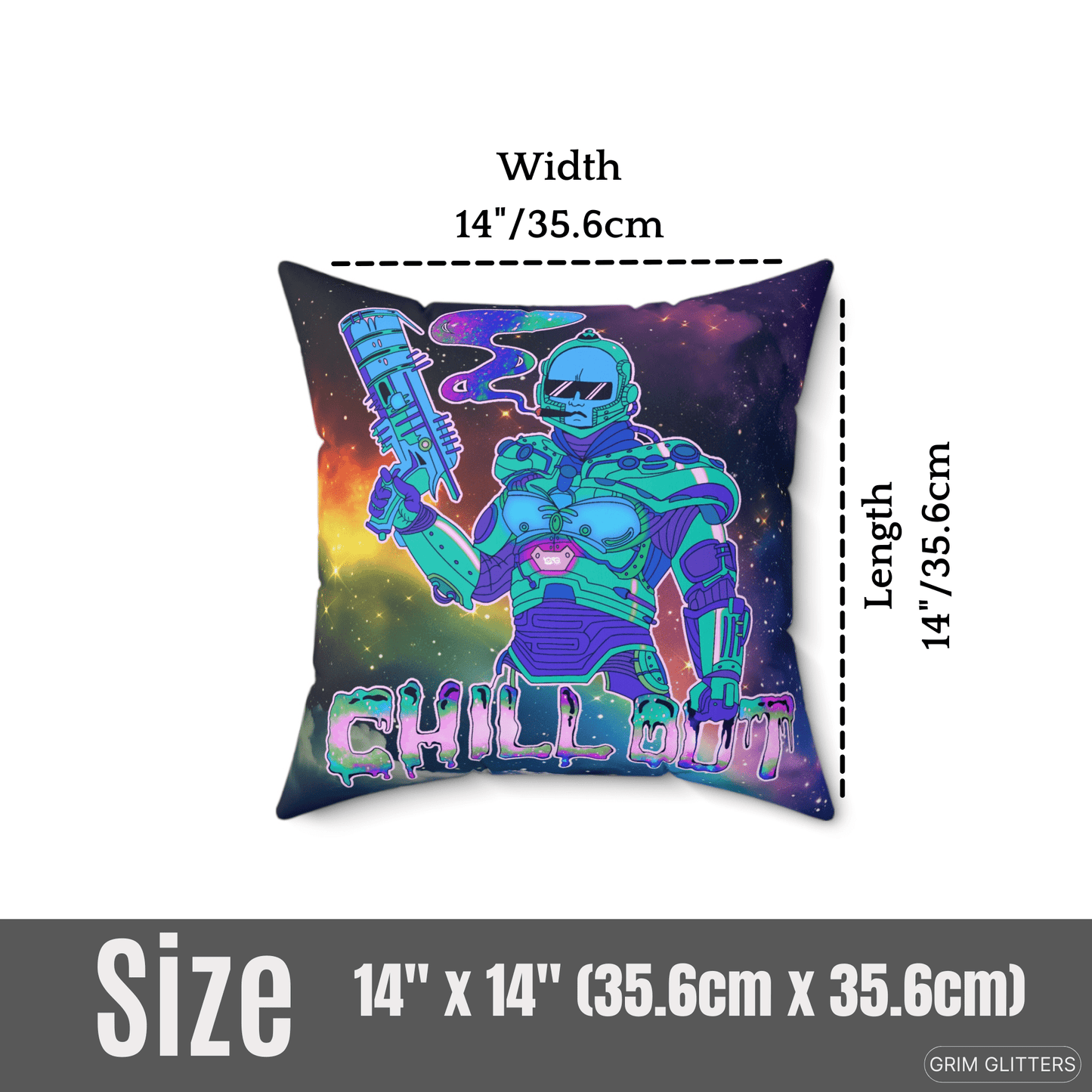 Add a touch of cosmic chillings to your home with our Chill Out Square Pillow. Featuring a groovy Dr. Freeze inspired dude wearing sunglasses and smoking a thicc one, this pillow combines futuristic flair with a funky vibe.