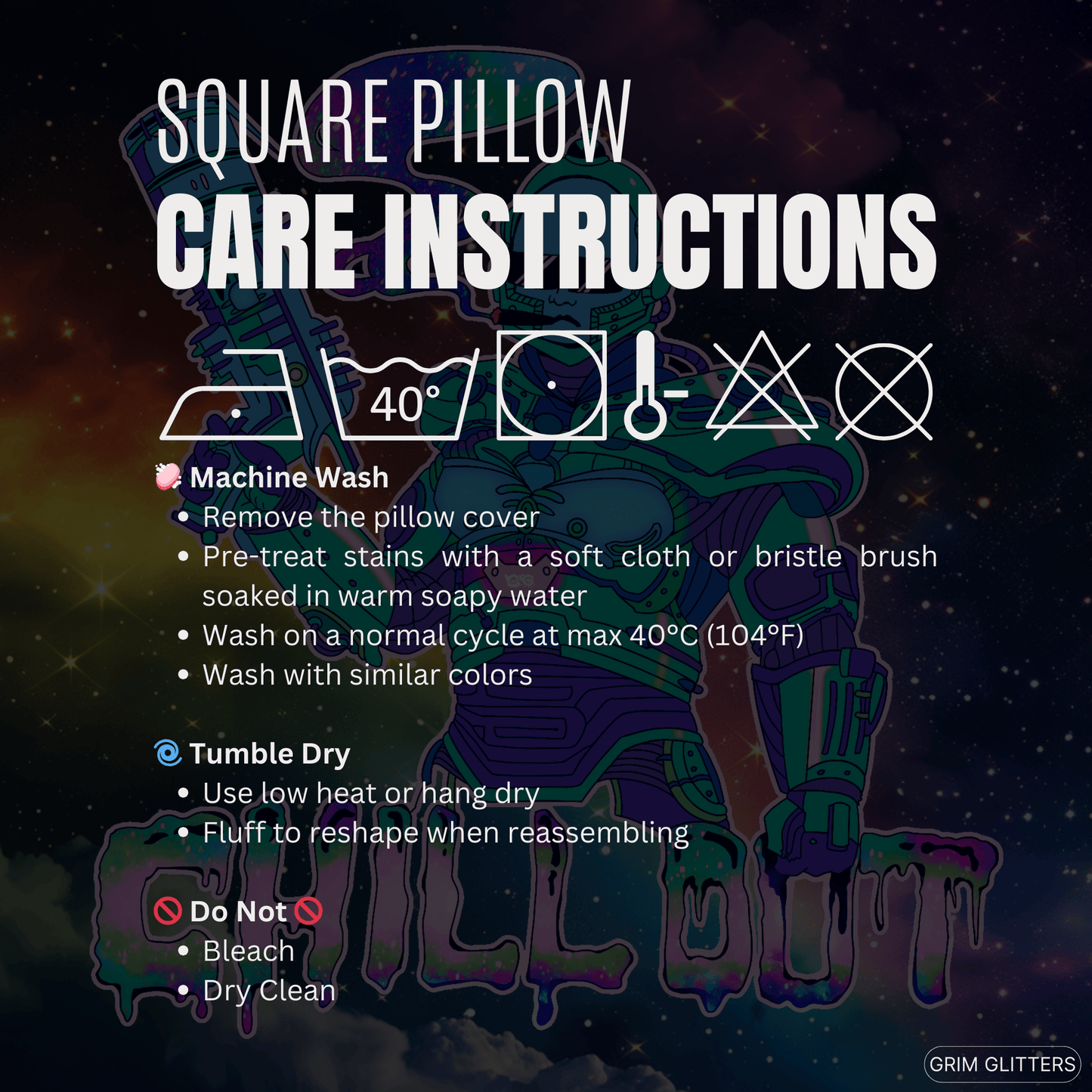 Maintaining the beauty of your Chill Out pillow is simple. Remove the cover and pre-treat any stains with a soft cloth or bristle brush soaked in warm soapy water. Machine wash on a normal cycle at a maximum of 40°C (104°F). Do not bleach, tumble dry on low, and avoid dry-cleaning. Iron, steam, or dry on low heat only. Fluff the insert to reshape when reassembling.