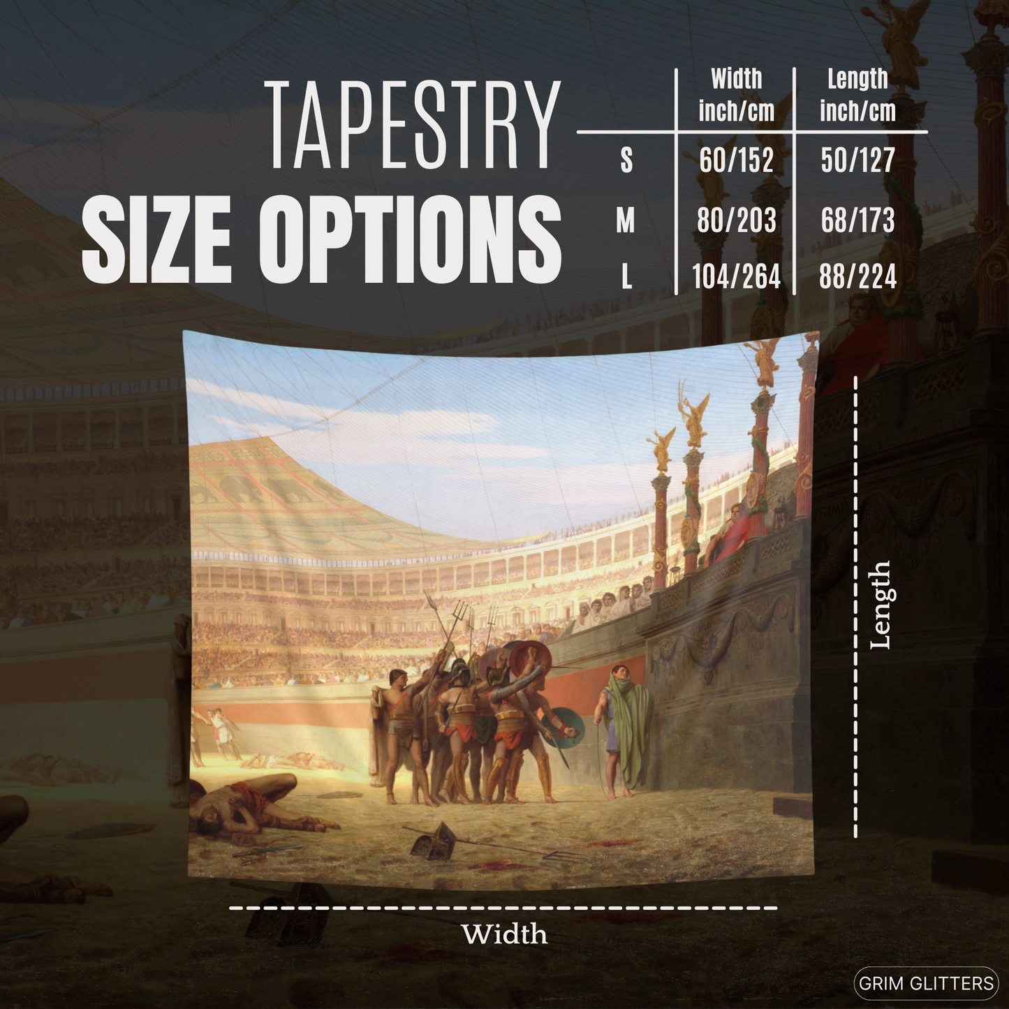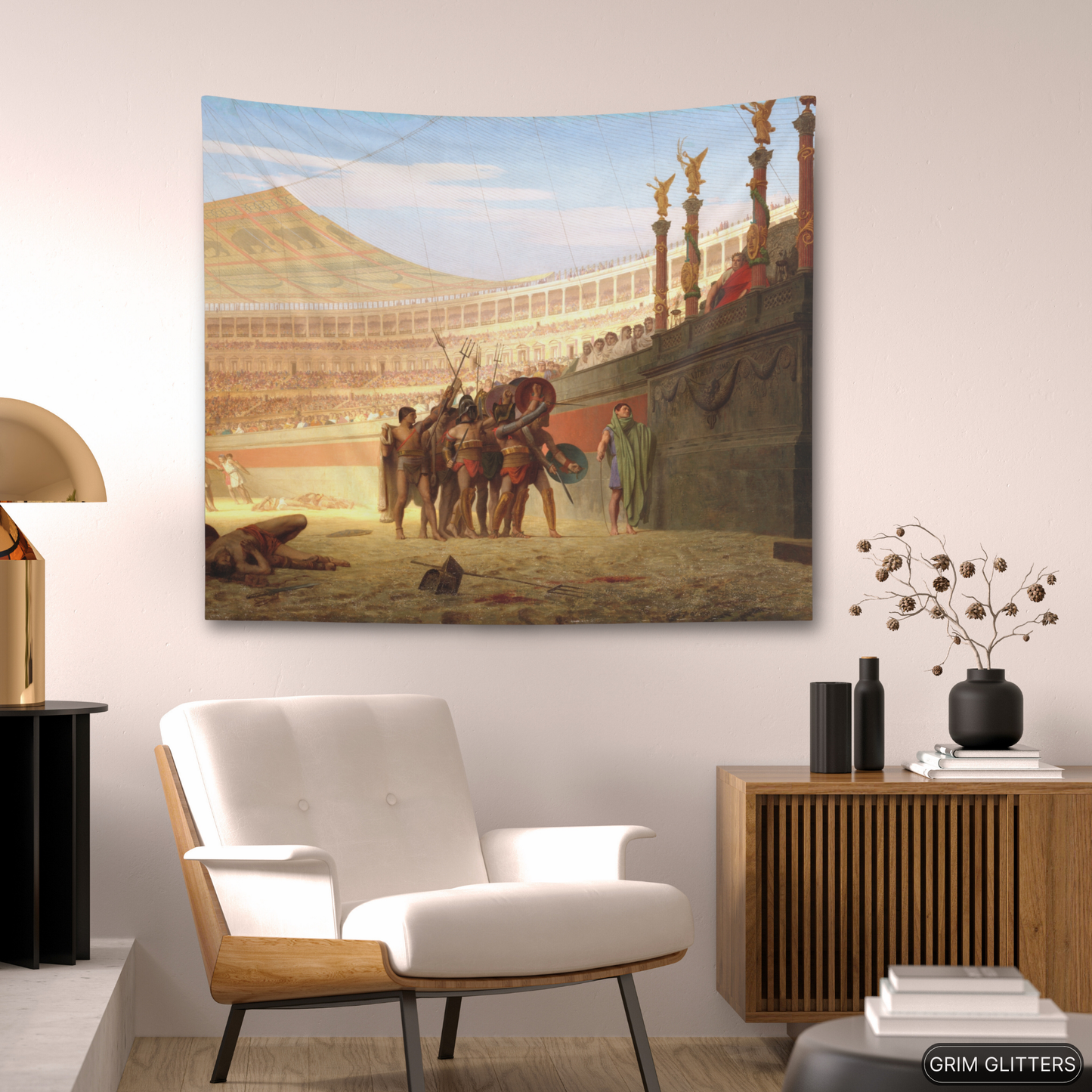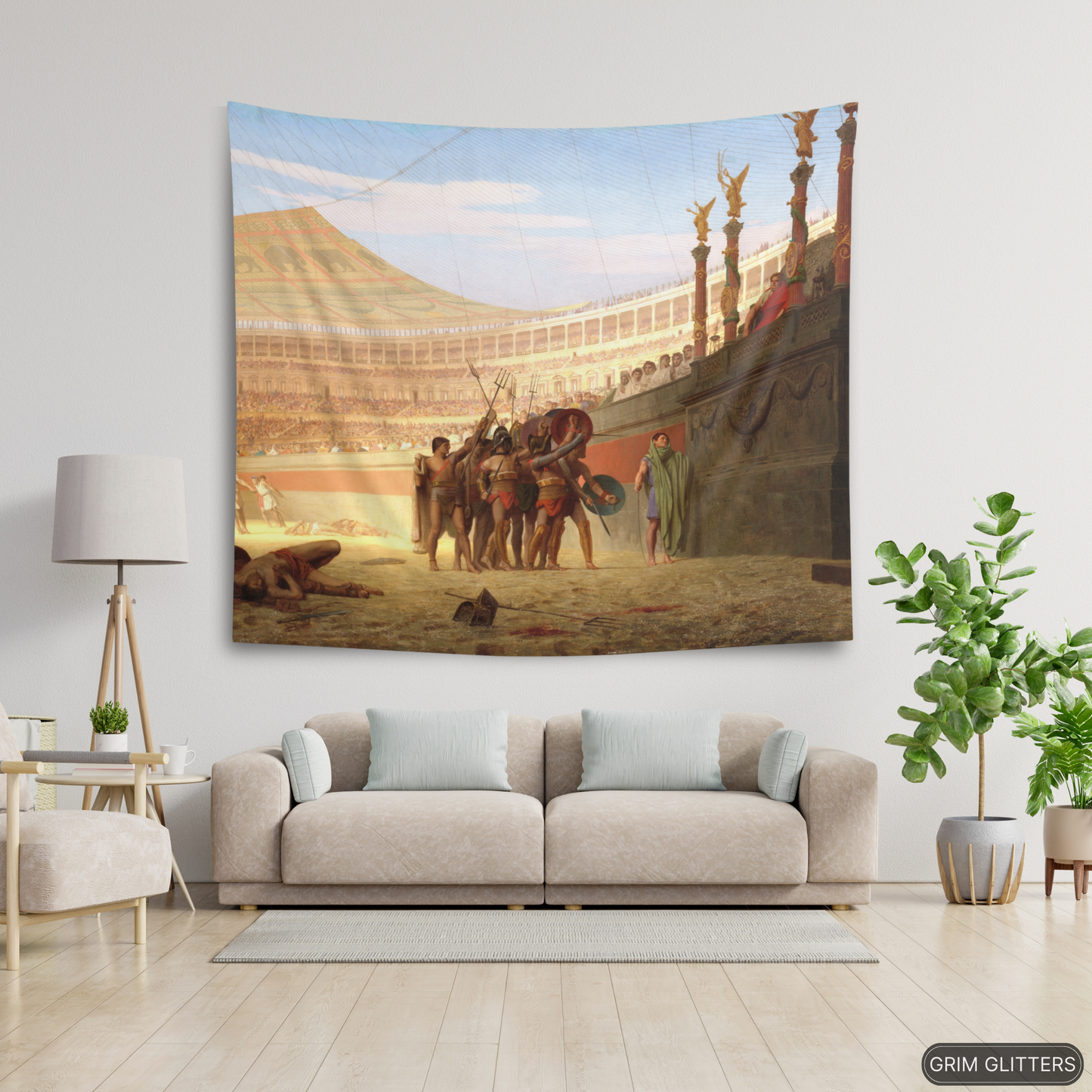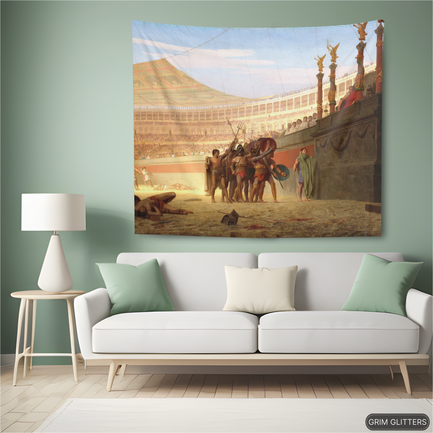 Step into the grandeur of ancient Rome with our Roman Gladiator Tapestry. Featuring the iconic artwork by Jean-Leon Gerome, this tapestry brings the legendary gladiatorial cry, "Hail Caesar! We Who Are About to Die Salute You," to life. Perfect for adding a touch of historical drama to your home decor, this tapestry captures the epic atmosphere of the Roman arena.