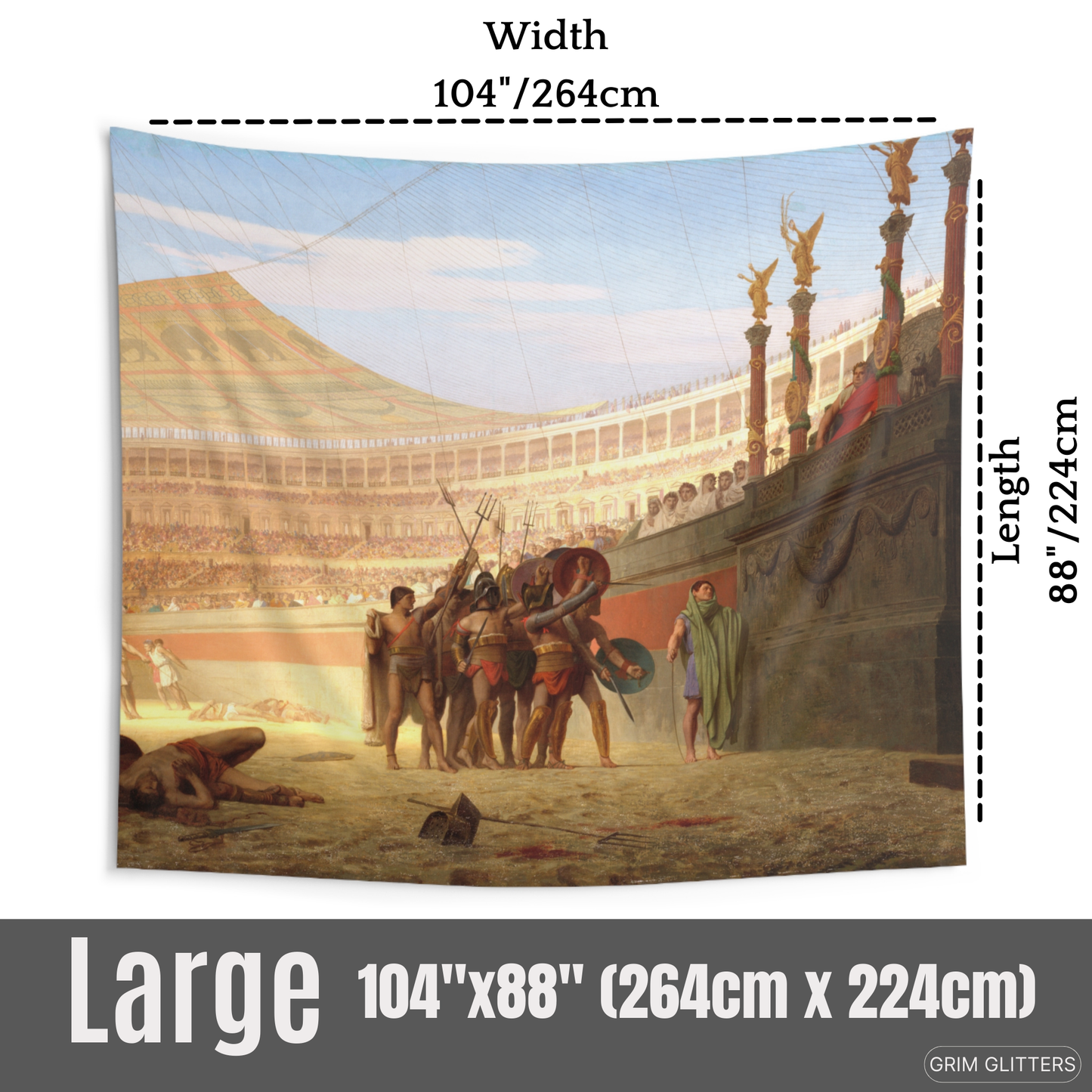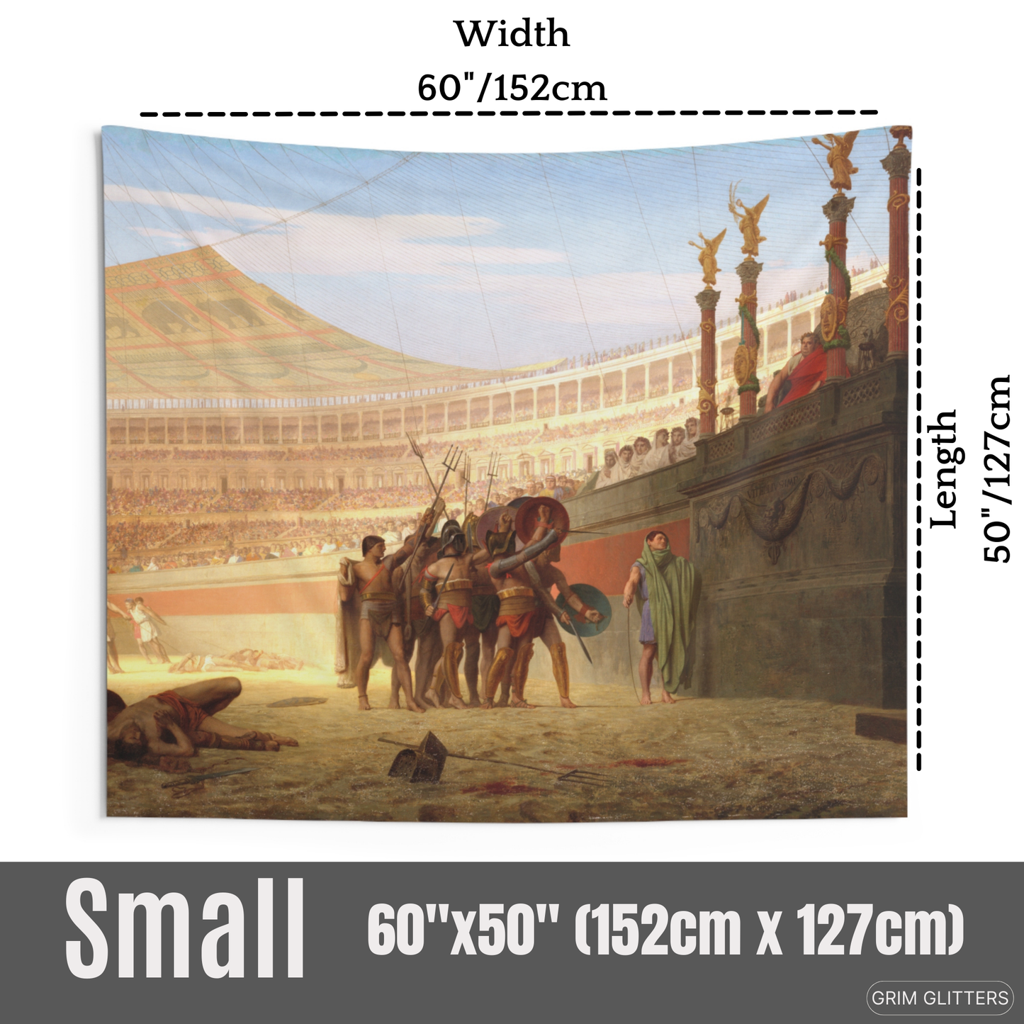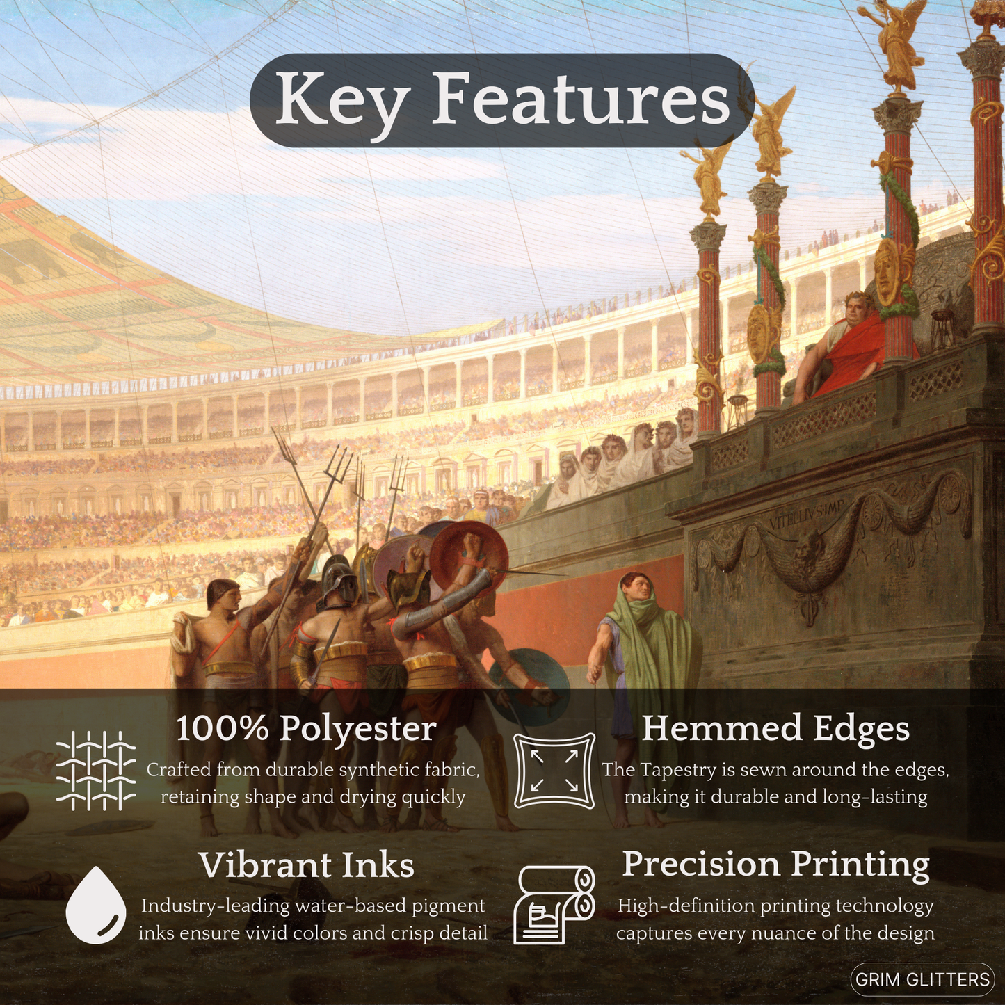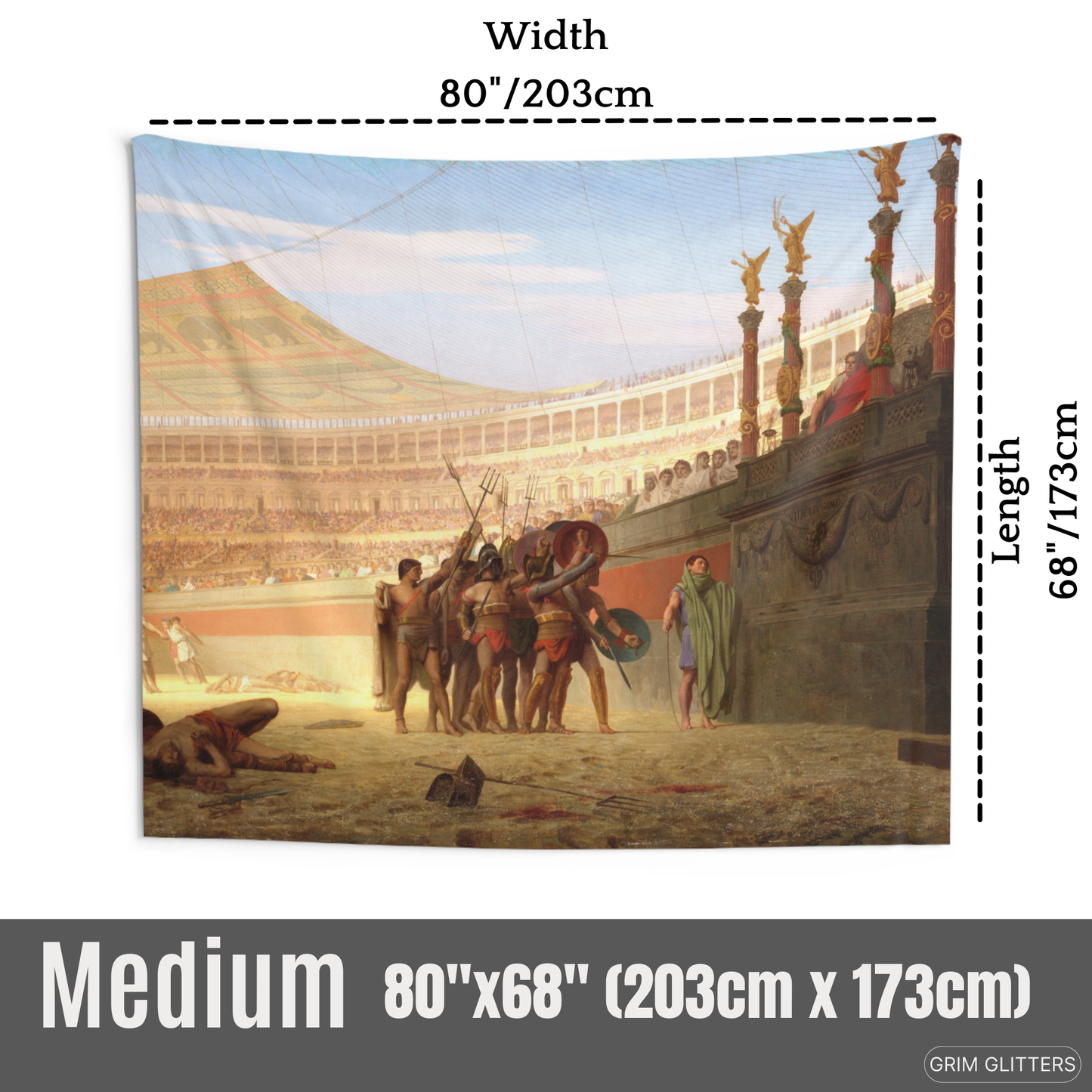 Step into the grandeur of ancient Rome with our Roman Gladiator Tapestry. Featuring the iconic artwork by Jean-Leon Gerome, this tapestry brings the legendary gladiatorial cry, "Hail Caesar! We Who Are About to Die Salute You," to life. Perfect for adding a touch of historical drama to your home decor, this tapestry captures the epic atmosphere of the Roman arena.