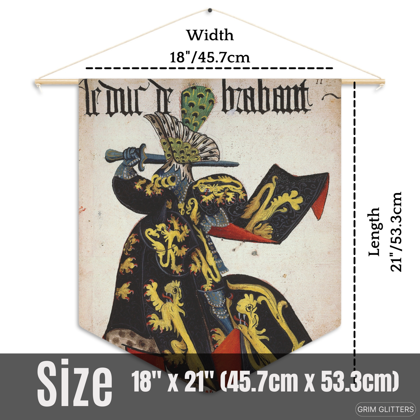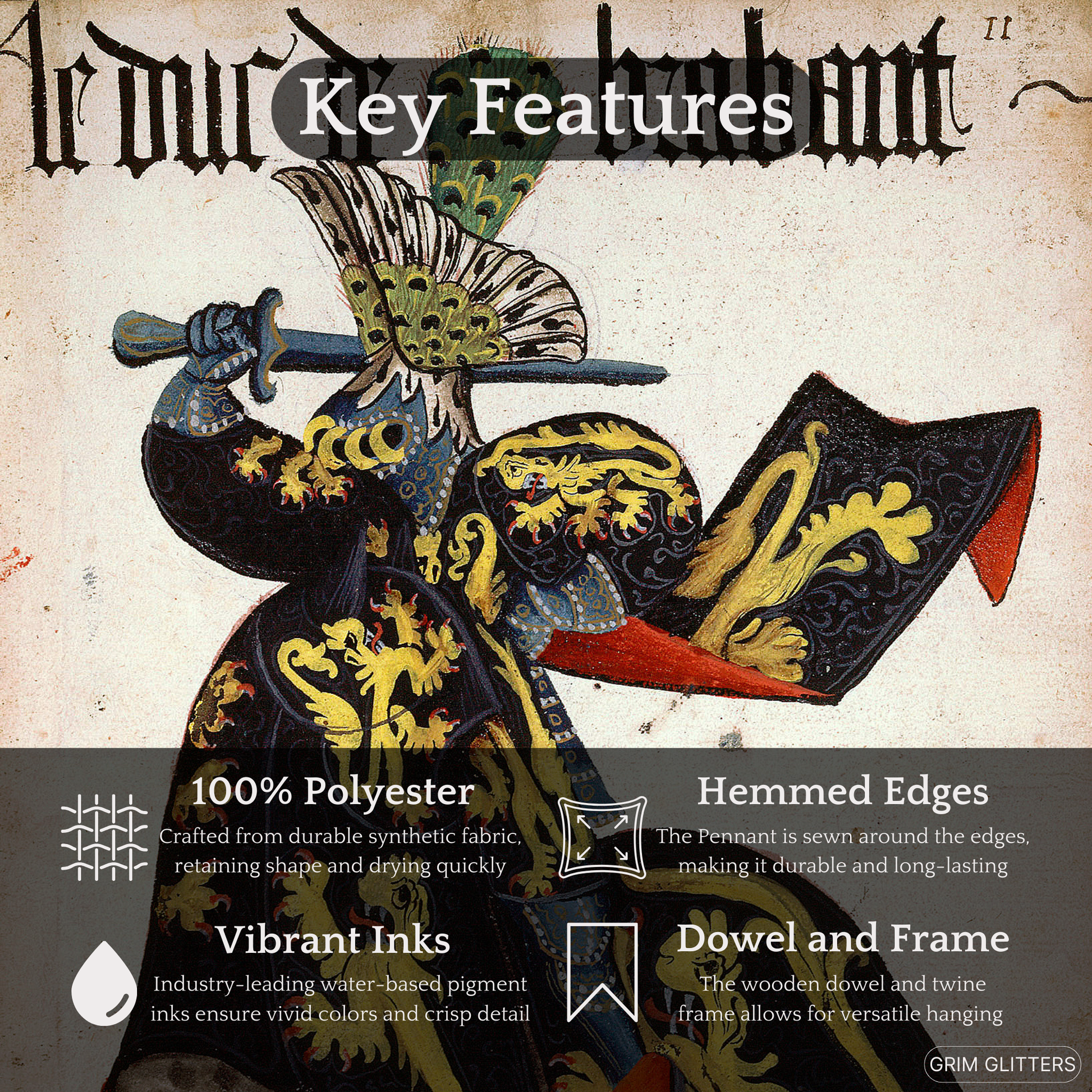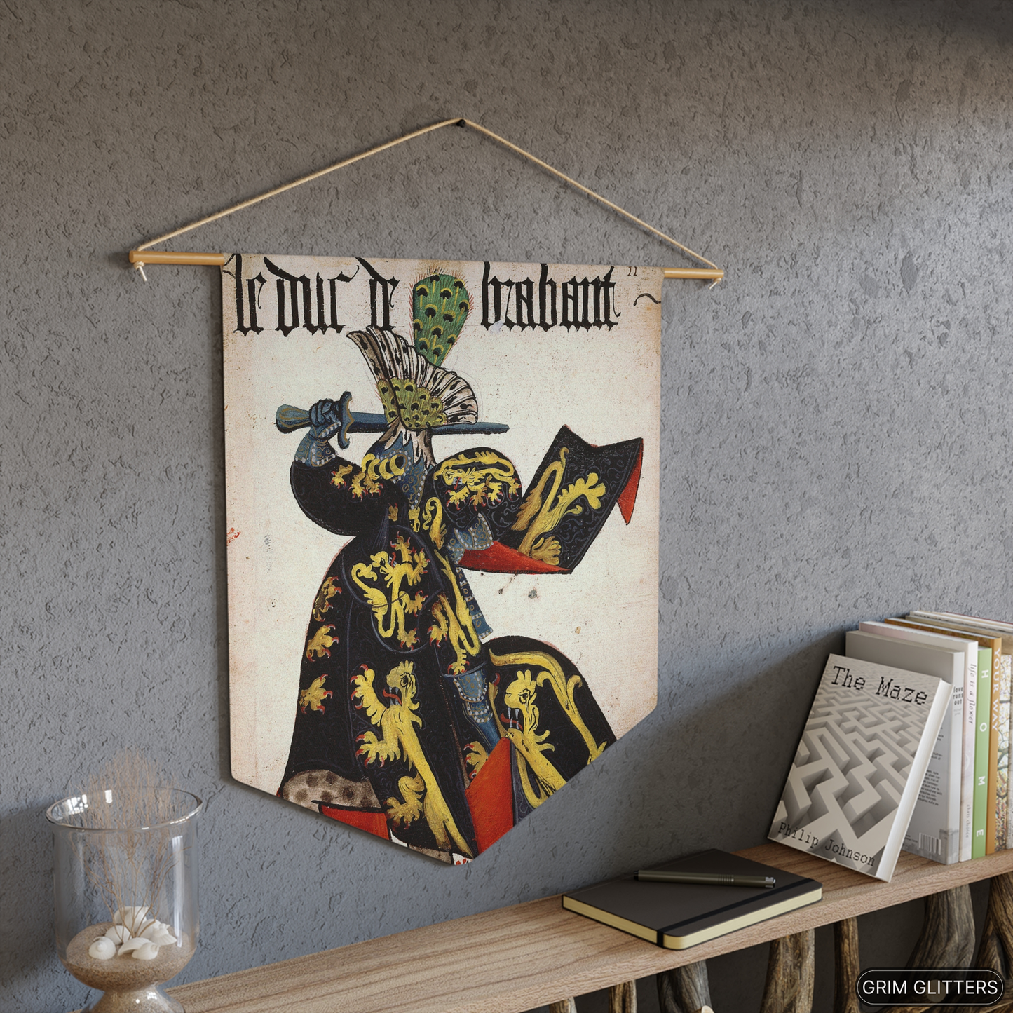 Step into the grandeur of medieval heraldry with The Duke of Brabant Pennant Banner, inspired by the Great Equestrian Armorial of the Golden Fleece. This striking design features the Duke of Brabant adorned in black and gold jousting regalia, with golden lions rampant symbolizing strength and noble power. His elaborate helm, crowned with a plume of green and silver feathers, completes the bold display of chivalric elegance. Perfect for medieval art lovers, history enthusiasts, and those seeking historic grandeur in their home decor.