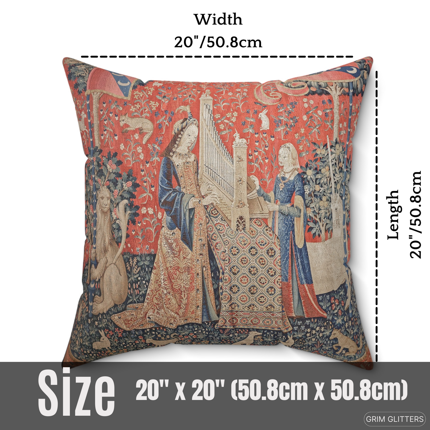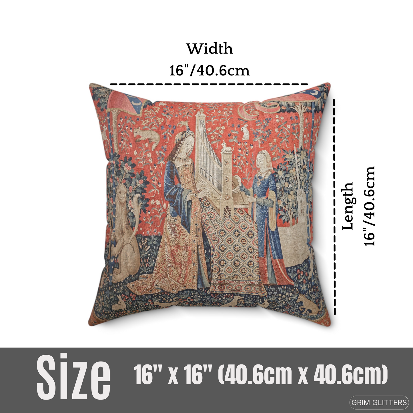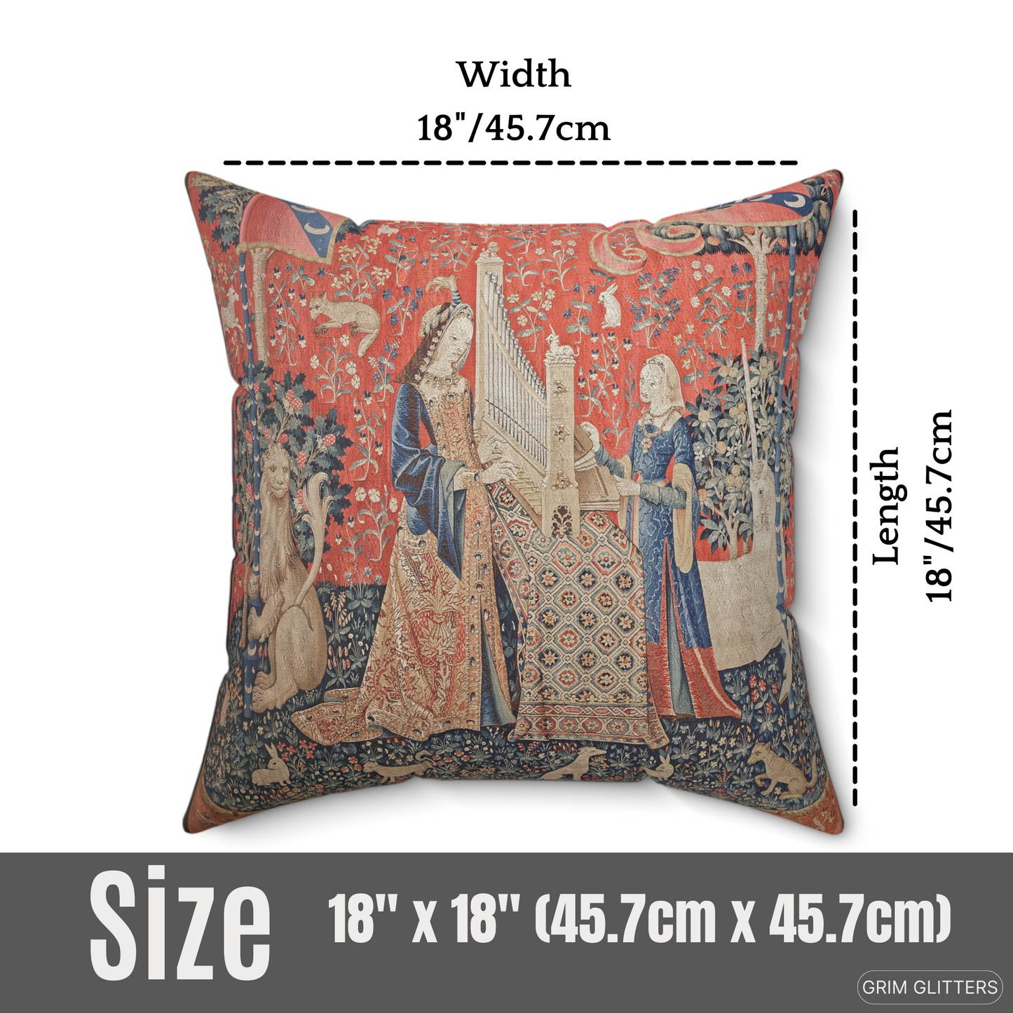 Elevate your home decor with the enchanting beauty of medieval art through our Lady and the Unicorn (Hearing) Square Pillow. Inspired by the iconic Unicorn Tapestry, this captivating pillow brings a touch of historical charm and mystical allure to any room.
