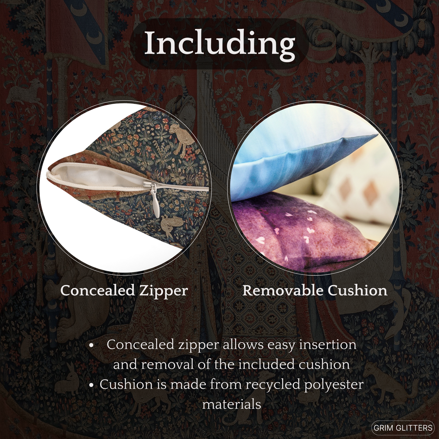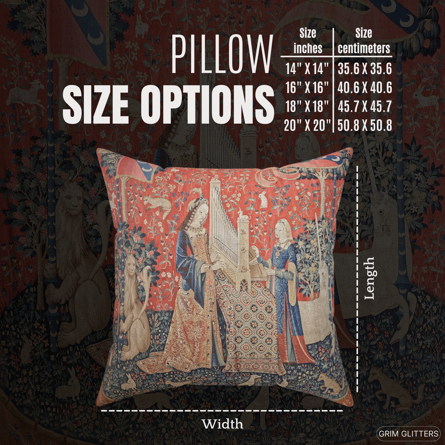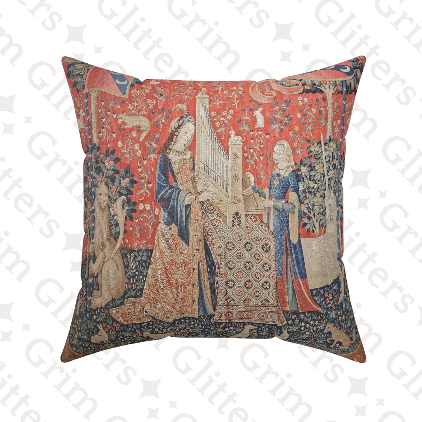 Elevate your home decor with the enchanting beauty of medieval art through our Lady and the Unicorn (Hearing) Square Pillow. Inspired by the iconic Unicorn Tapestry, this captivating pillow brings a touch of historical charm and mystical allure to any room.