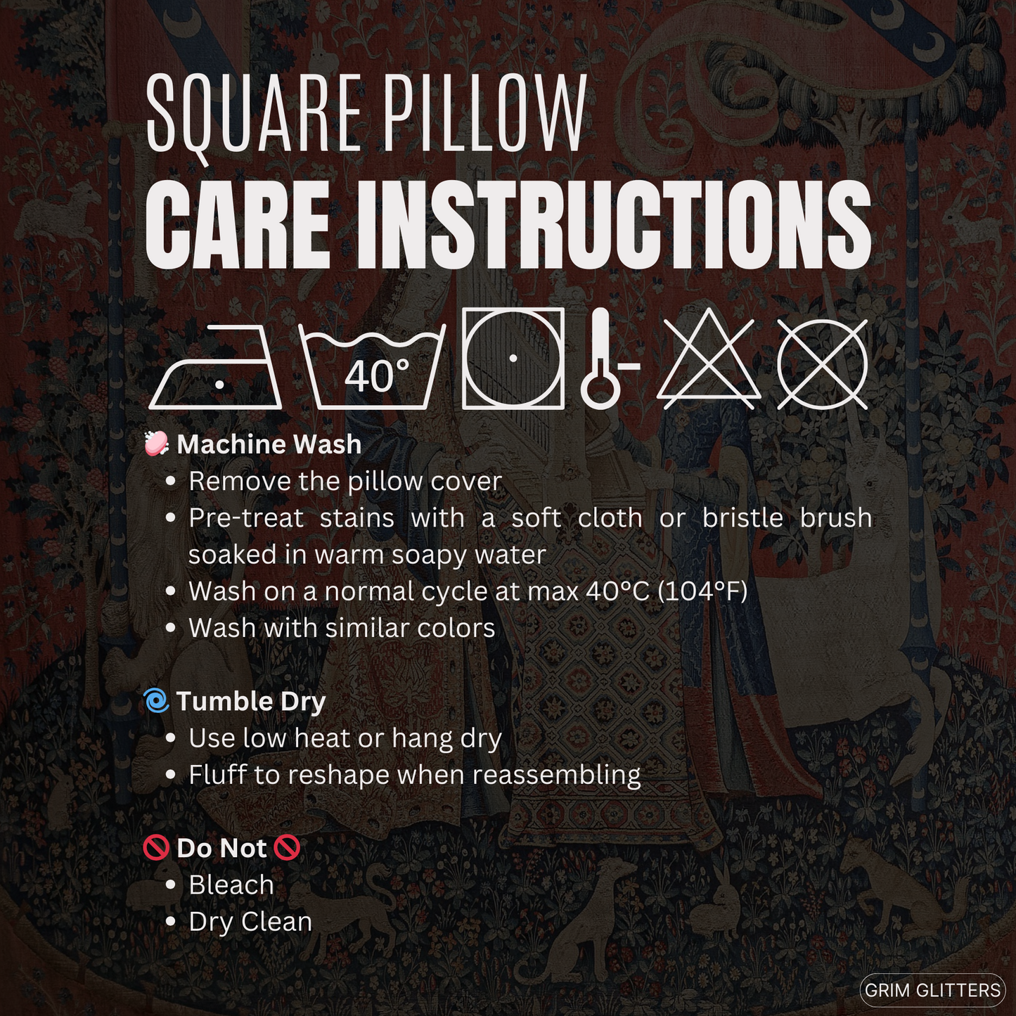 Maintaining the beauty of your Lady and the Unicorn pillow is simple. Remove the cover and pre-treat any stains with a soft cloth or bristle brush soaked in warm soapy water. Machine wash on a normal cycle at a maximum of 40°C (104°F). Do not bleach, tumble dry on low, and avoid dry-cleaning. Iron, steam, or dry on low heat only. Fluff the insert to reshape when reassembling.