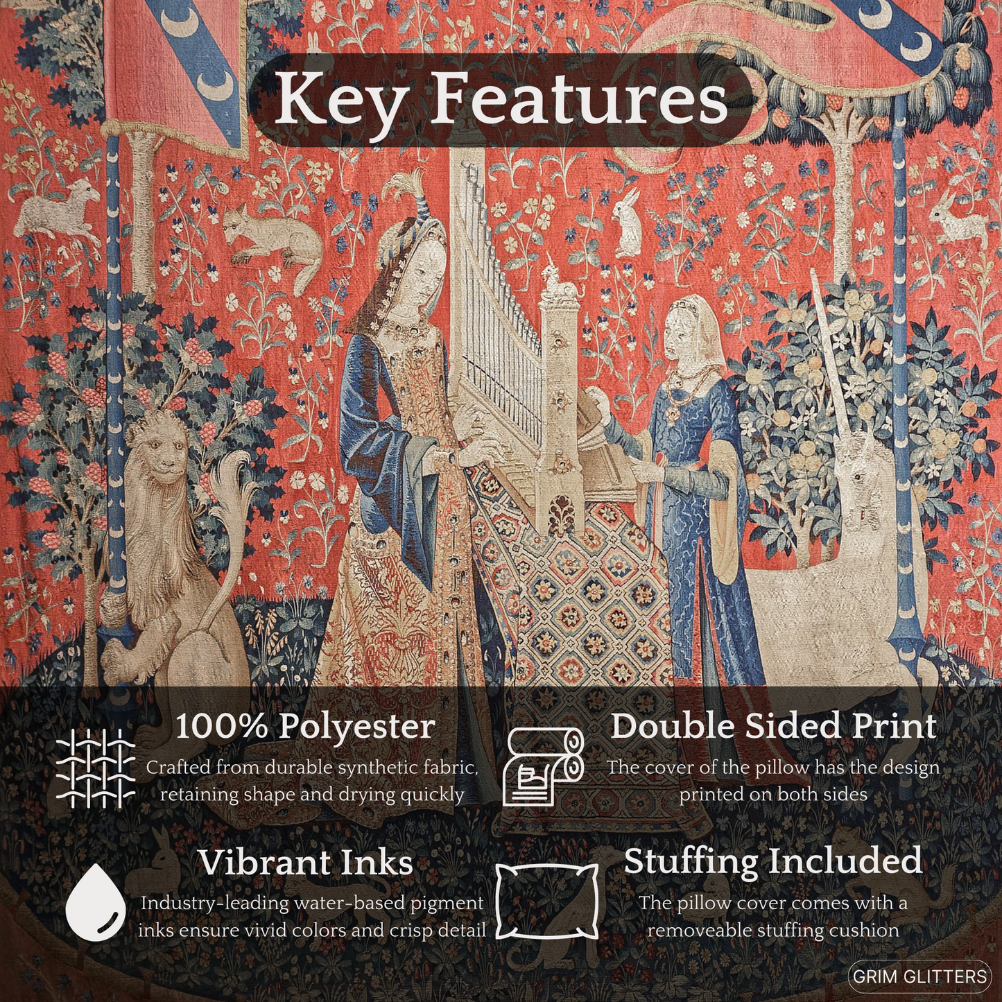 The vibrant colors and intricate details of the Lady and the Unicorn (Hearing) scene are beautifully reproduced on this pillow, making it a stunning addition to any room. The high-resolution printing technique ensures that every detail of the original artwork is captured with clarity and brilliance.
