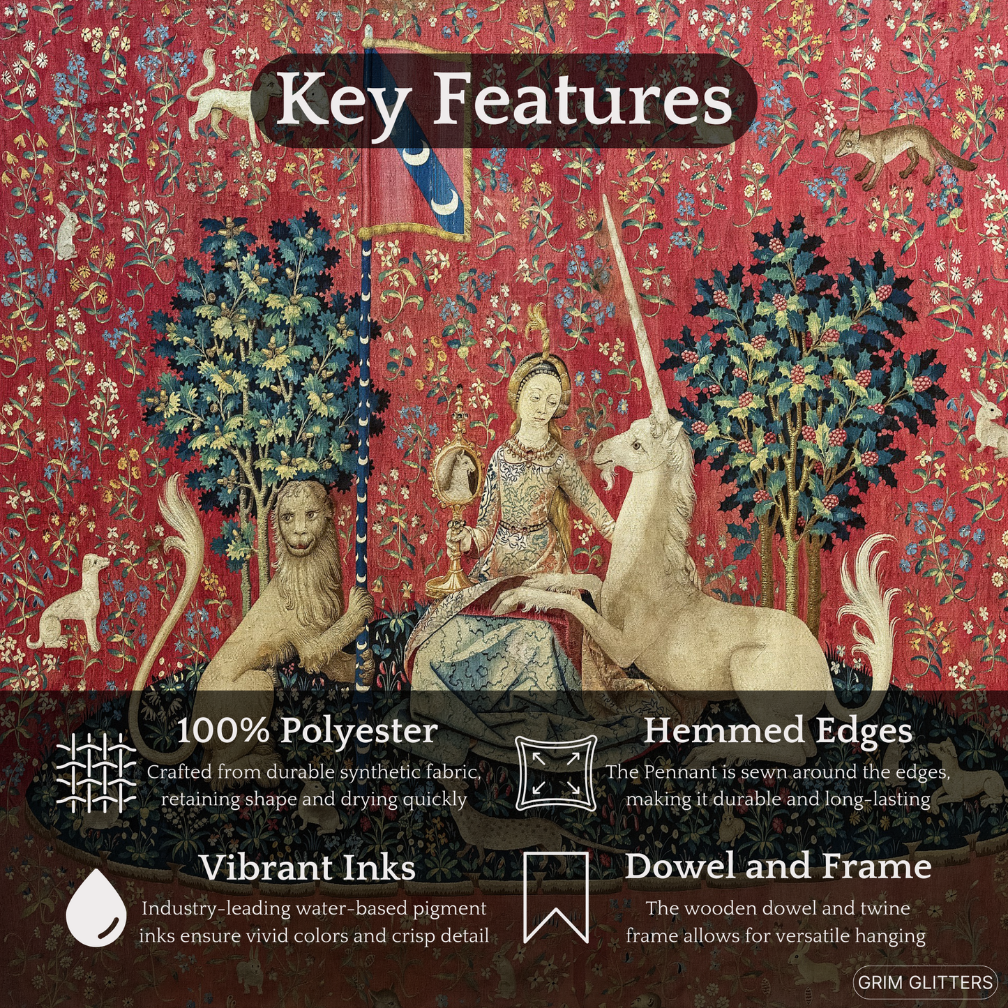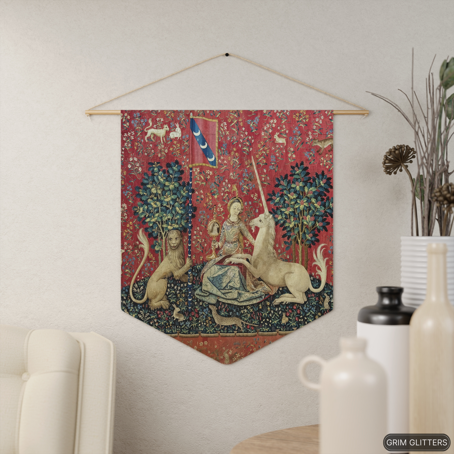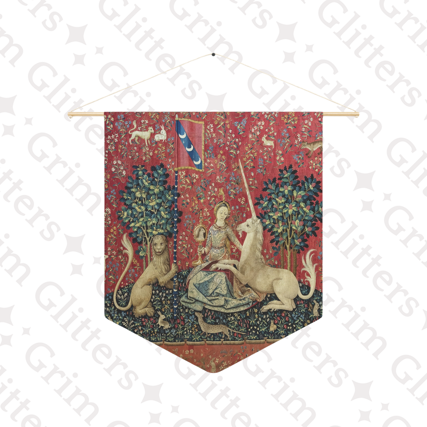 Immerse yourself in the magic of the medieval world with our 'The Lady and the Unicorn (Sight)' Pennant Banner.