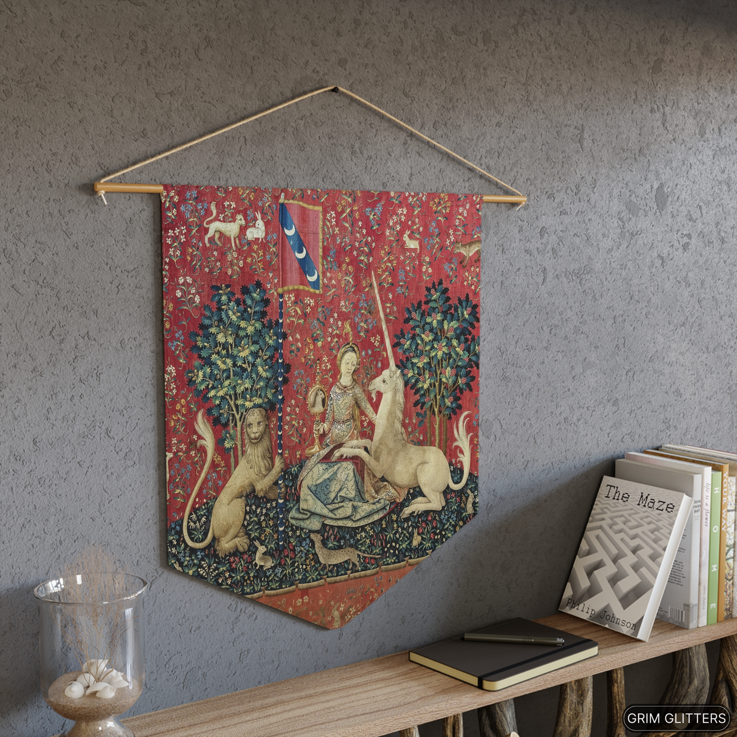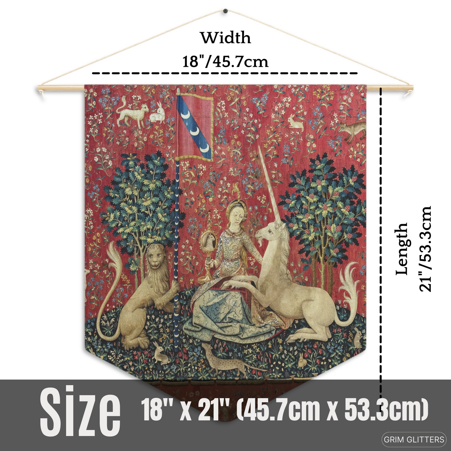 Elevate your home decor with this beautiful wall hanging, featuring the majestic unicorn and the lady in the iconic 'Sight' scene. Perfect for lovers of medieval art and fantasy, it adds a touch of elegance and charm to any room.