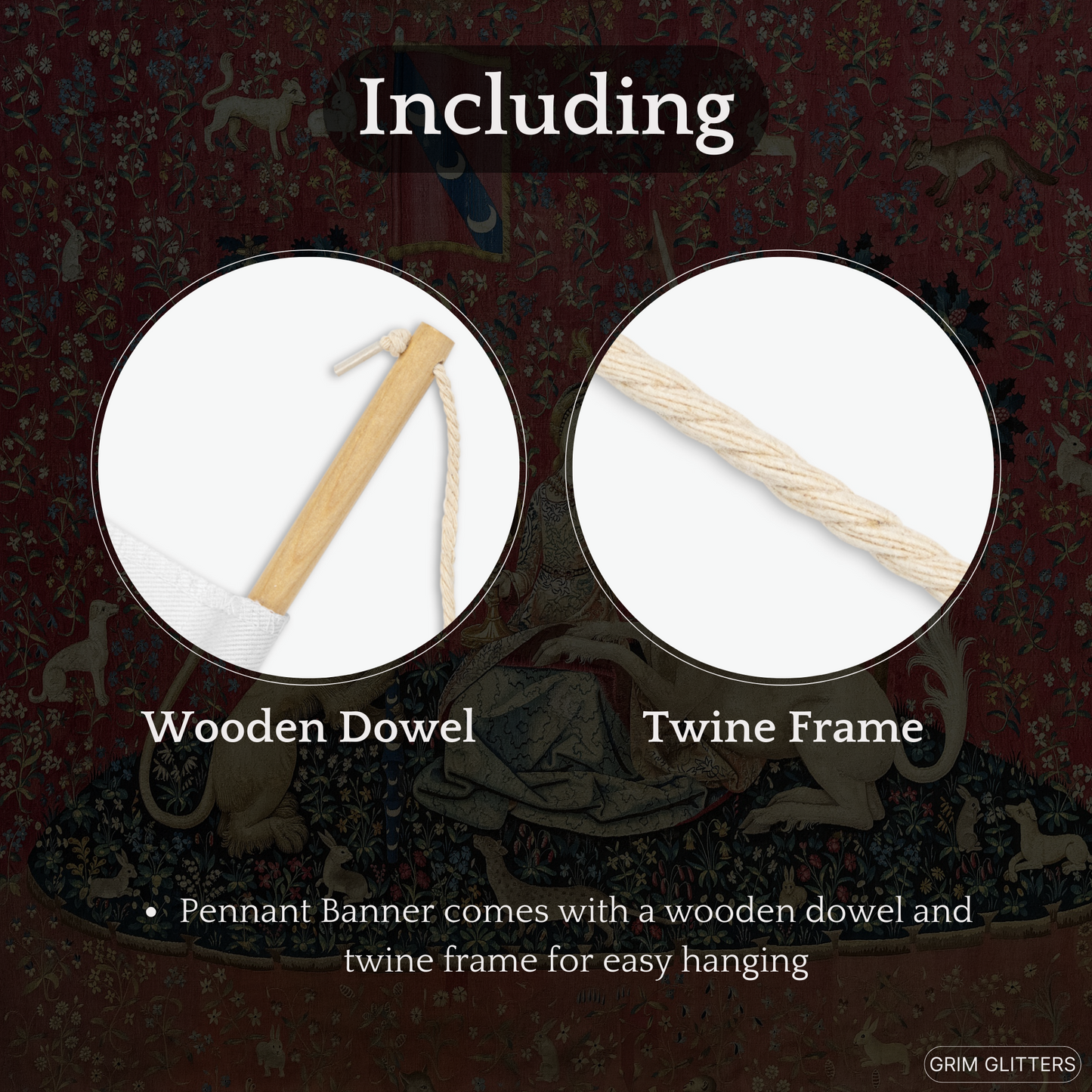 Step into the enchanting world of medieval art with our 'The Lady and the Unicorn (Sight)' Pennant Banner. This exquisite banner, inspired by the iconic Unicorn Tapestries, captures the essence of mystery and magic.