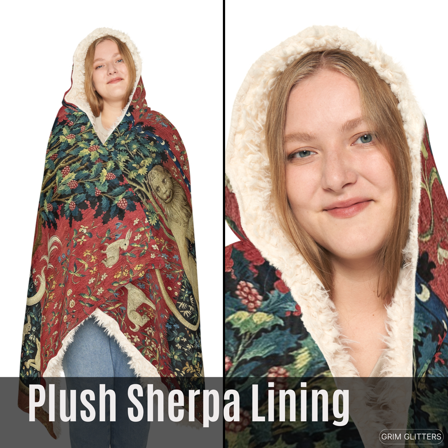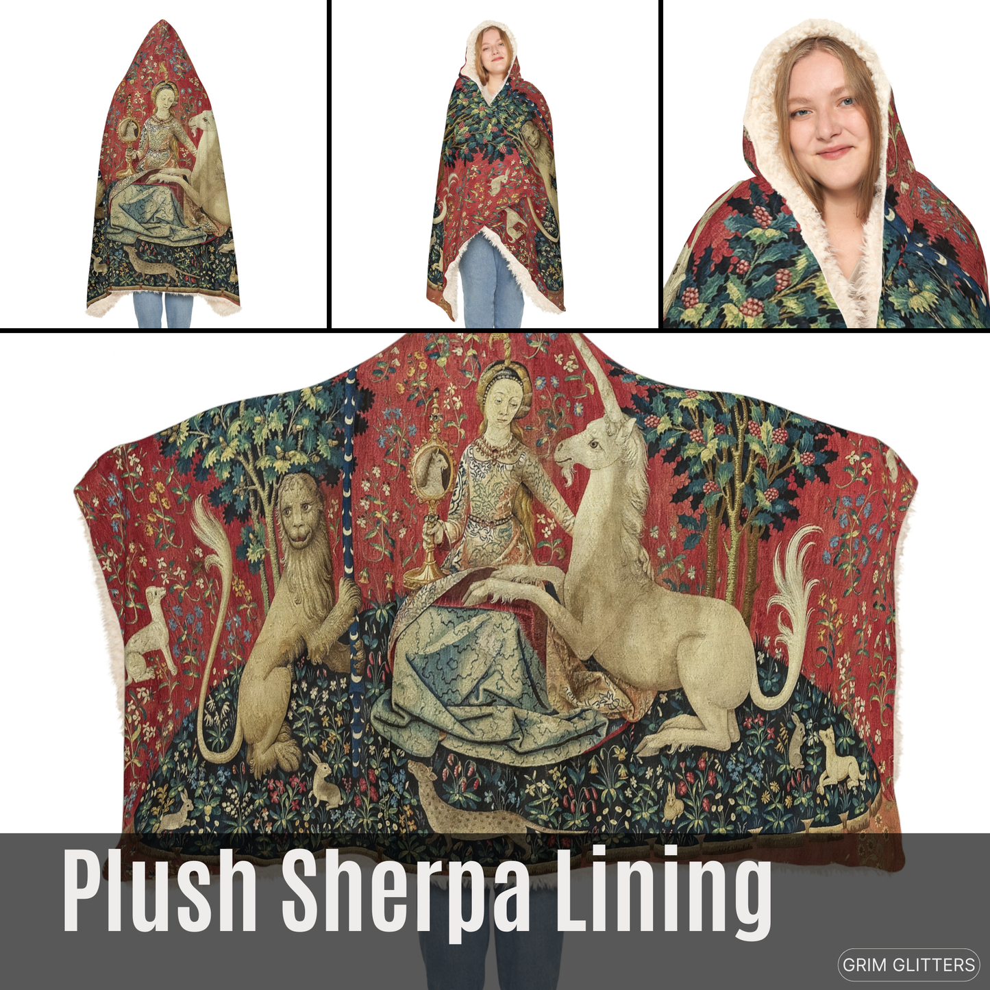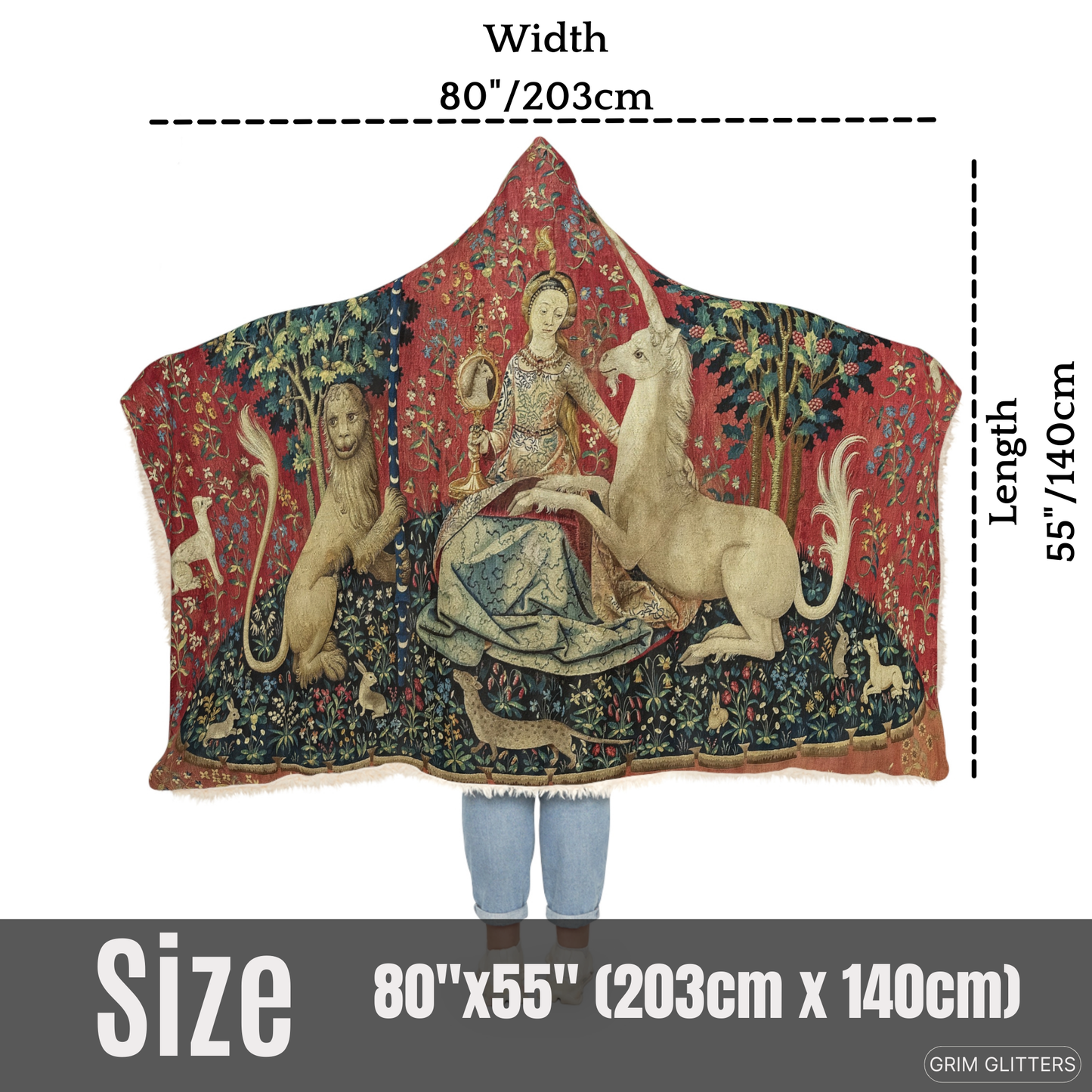 Enhance your cozy moments with the historical and mystical charm of our Lady and the Unicorn (Sight) Snuggle Cloak. Perfect for gifting or as a cherished addition to your own collection, this hooded blanket adds a touch of medieval elegance and artistic beauty to your relaxation time.