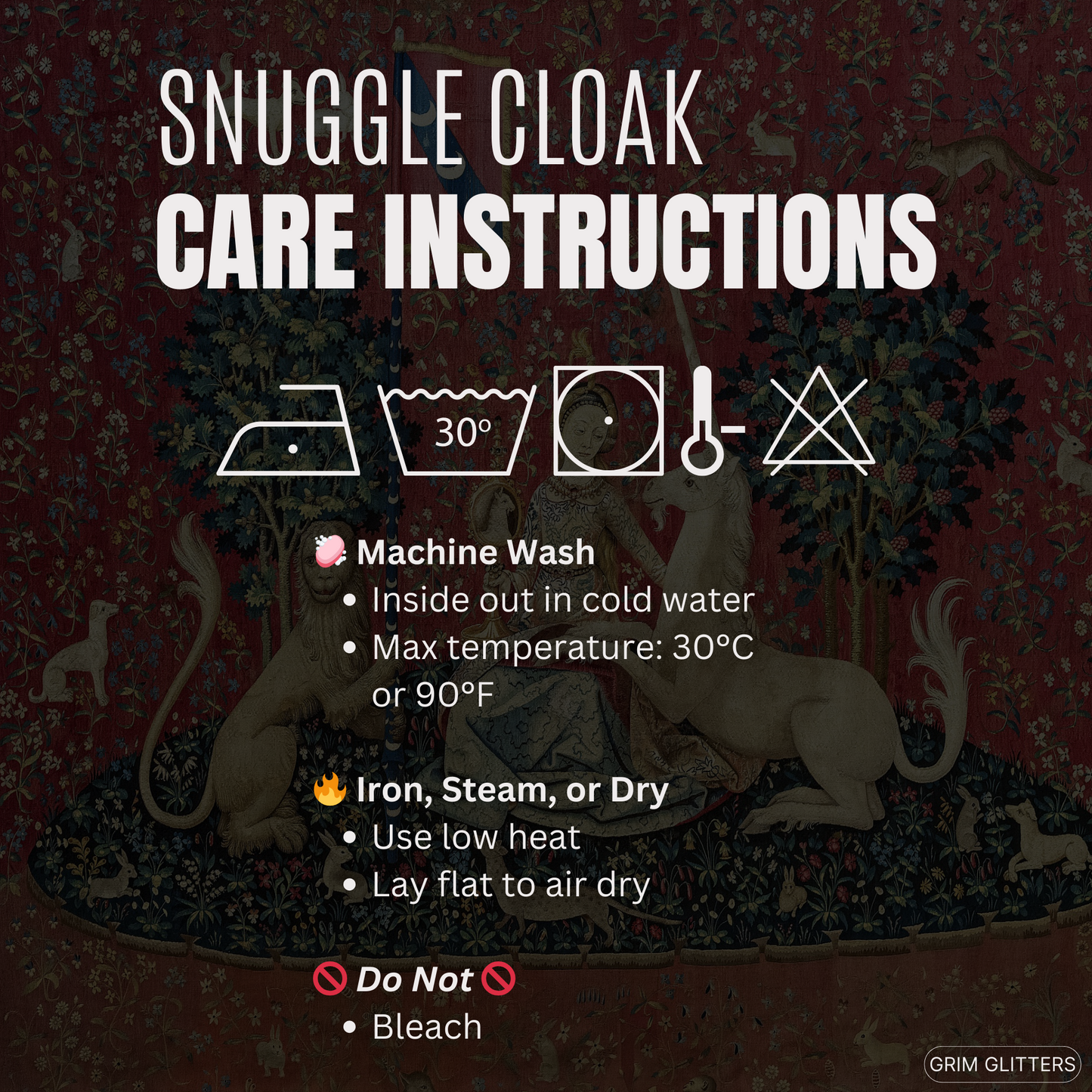 Keeping your snuggle cloak beautiful is simple. Machine wash inside out in cold water (max 30°C or 90°F). Drip dry, and if needed, iron, steam, or dry on low heat. Do not bleach to preserve the vibrant colors and soft texture.