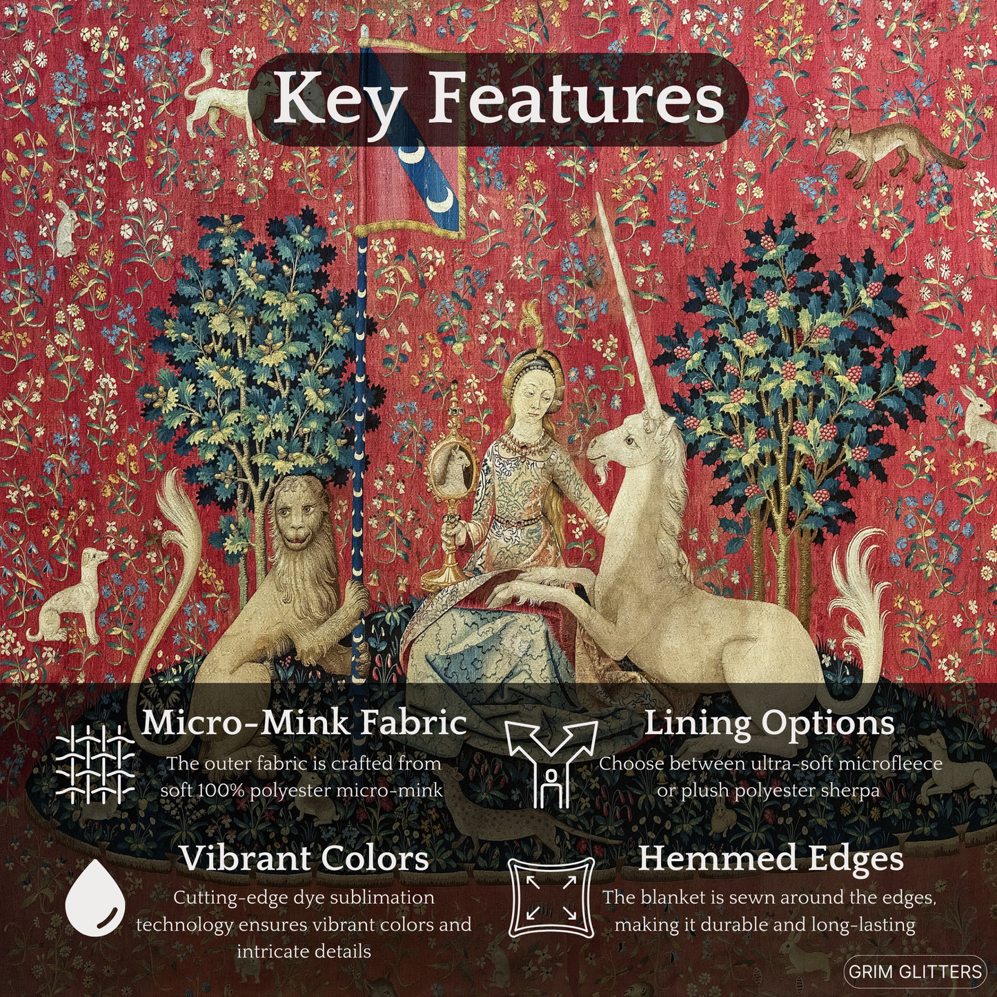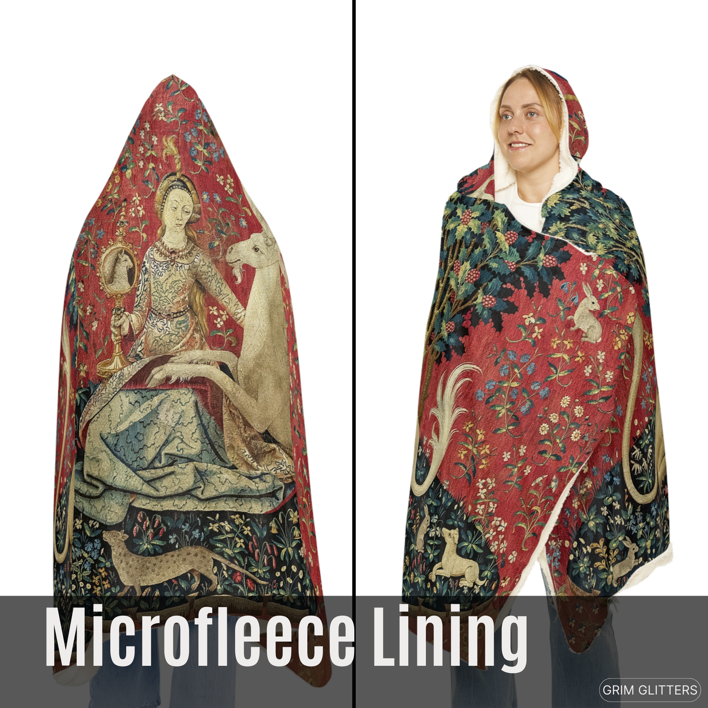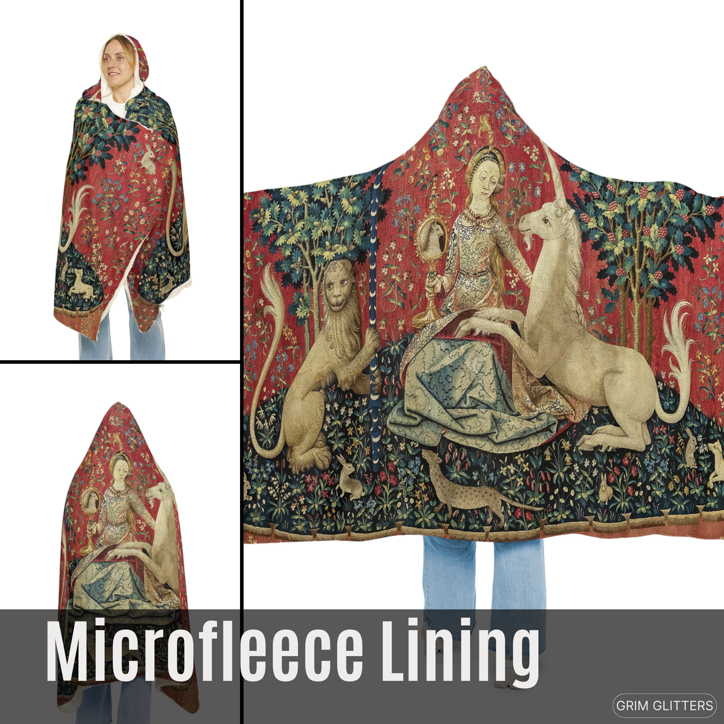 Immerse yourself in the enchanting beauty of medieval art with our Lady and the Unicorn (Sight) Snuggle Cloak. Inspired by the iconic Unicorn Tapestry, this snuggle cloak combines historical charm with modern comfort, making it the perfect addition to your cozy days at home.