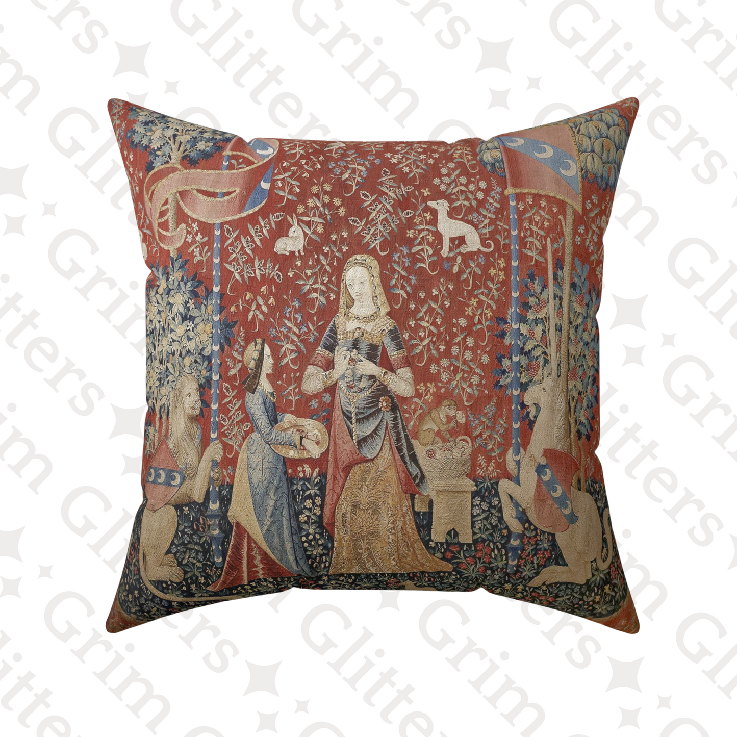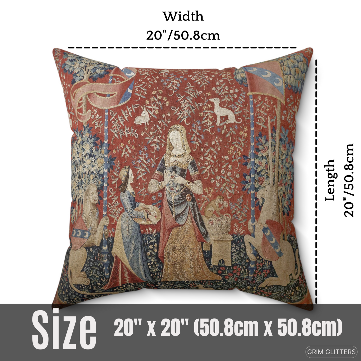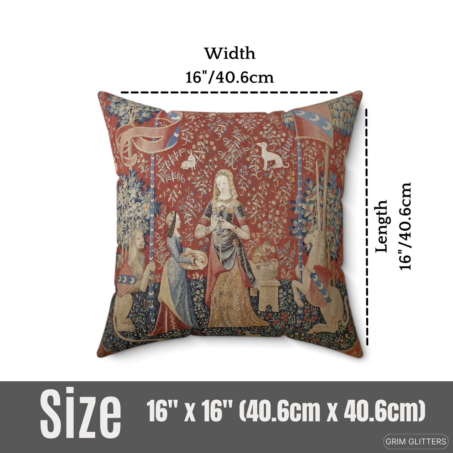 Enhance your home with the historical and mystical charm of our Lady and the Unicorn (Smell) Square Pillow. Perfect for gifting or as a cherished addition to your own collection, this enchanting throw pillow adds a touch of medieval elegance and artistic beauty to any space.