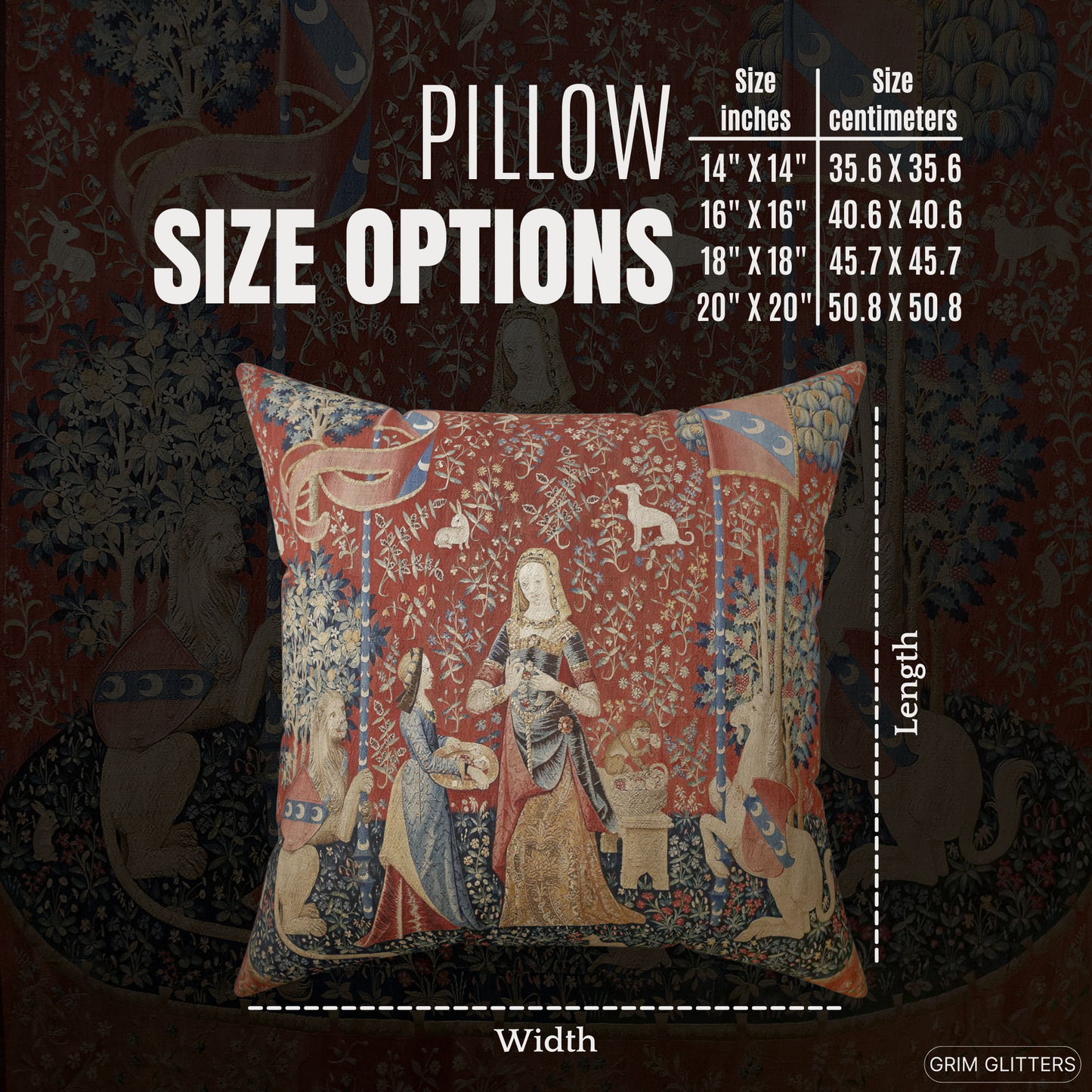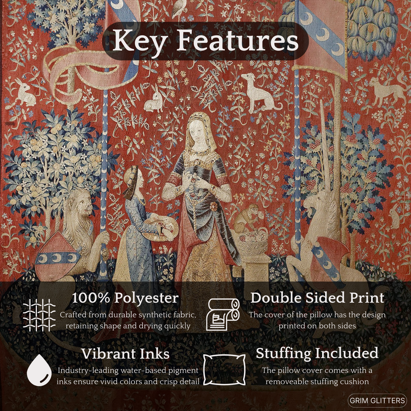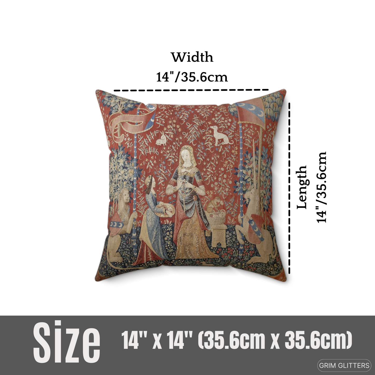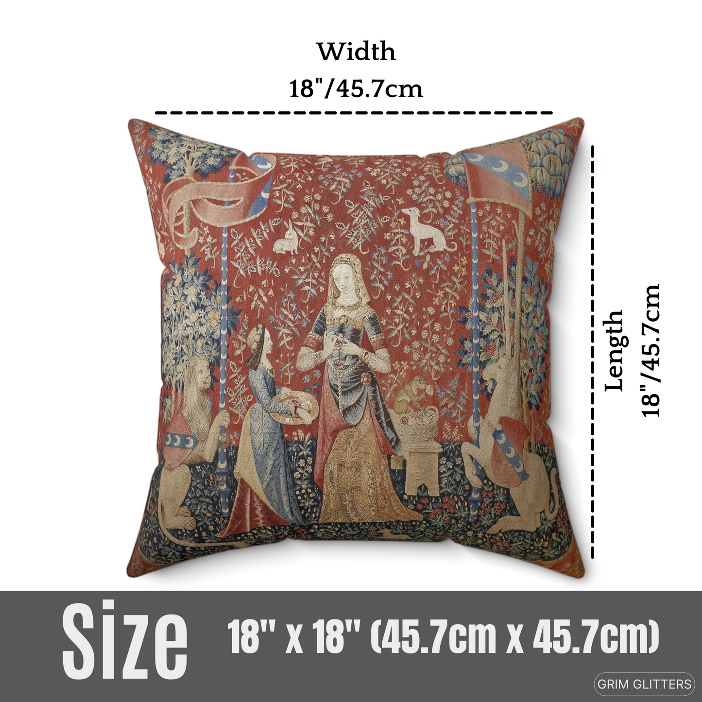 Enhance your home with the historical and mystical charm of our Lady and the Unicorn (Smell) Square Pillow. Perfect for gifting or as a cherished addition to your own collection, this enchanting throw pillow adds a touch of medieval elegance and artistic beauty to any space.