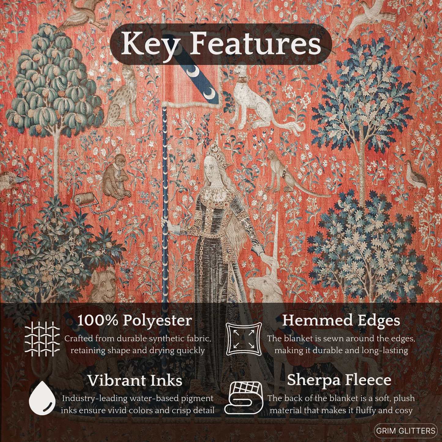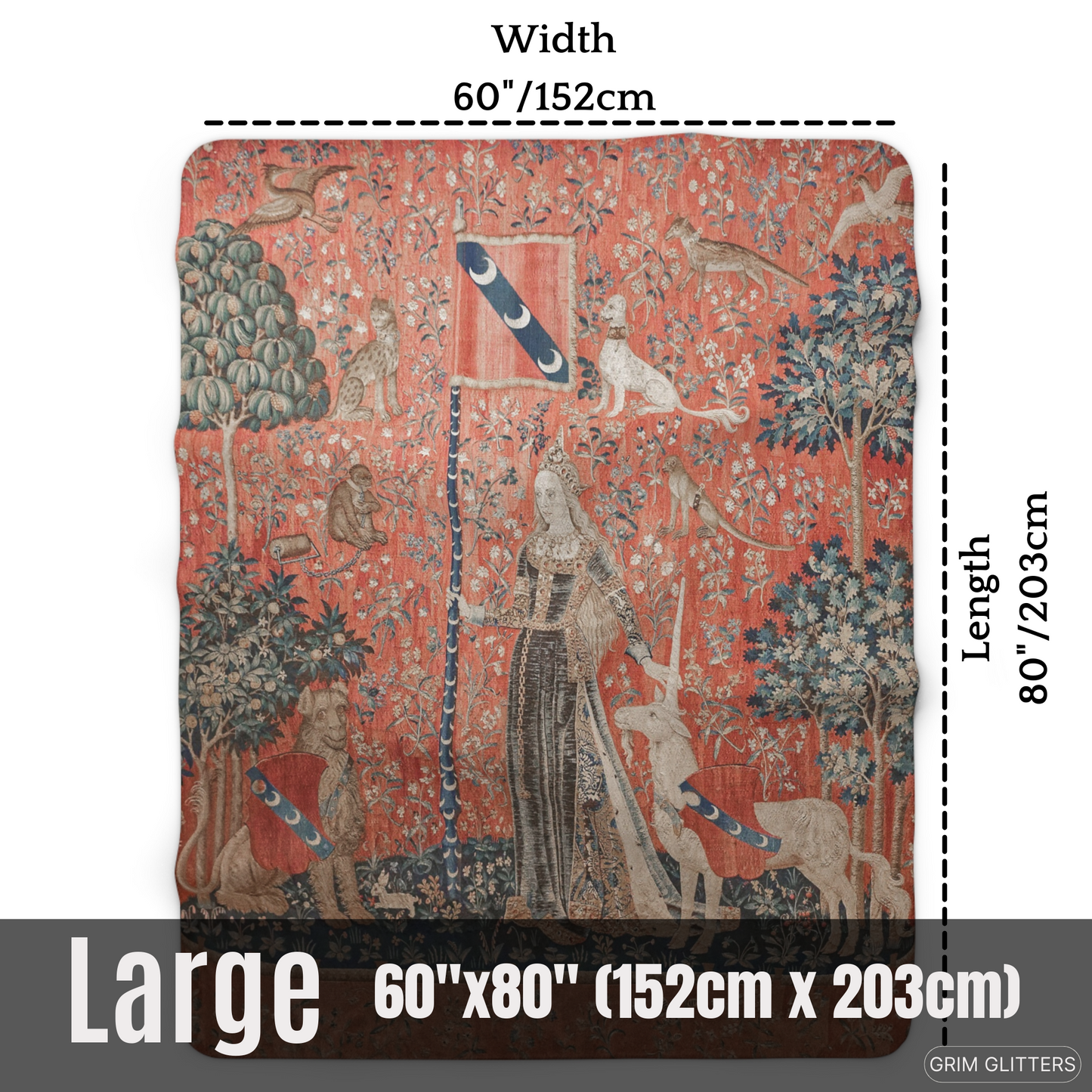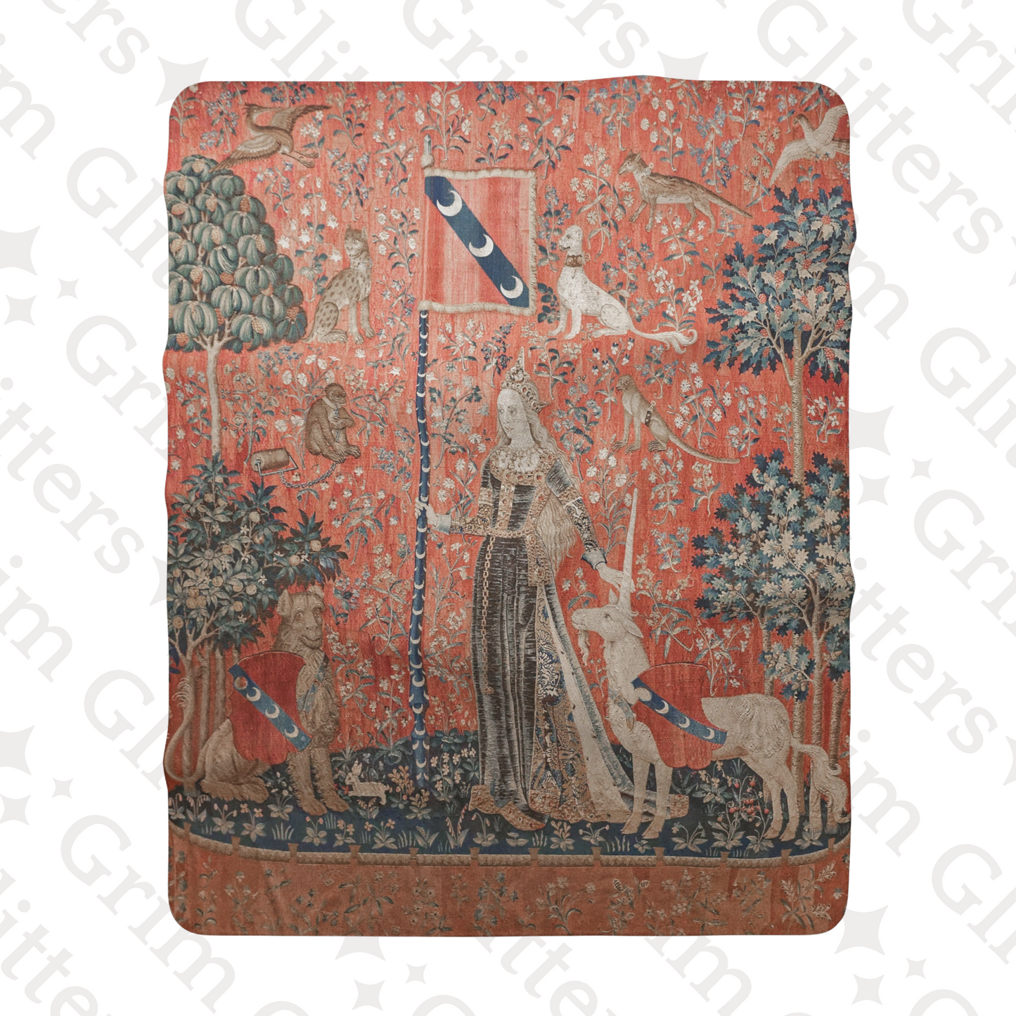 Wrap yourself in the enchanting beauty of medieval artistry with our "The Lady and the Unicorn (Touch)" Sherpa Fleece Blanket. Crafted with the utmost care and attention to detail, this cozy blanket brings the mystical allure of the Unicorn Tapestries into your home.