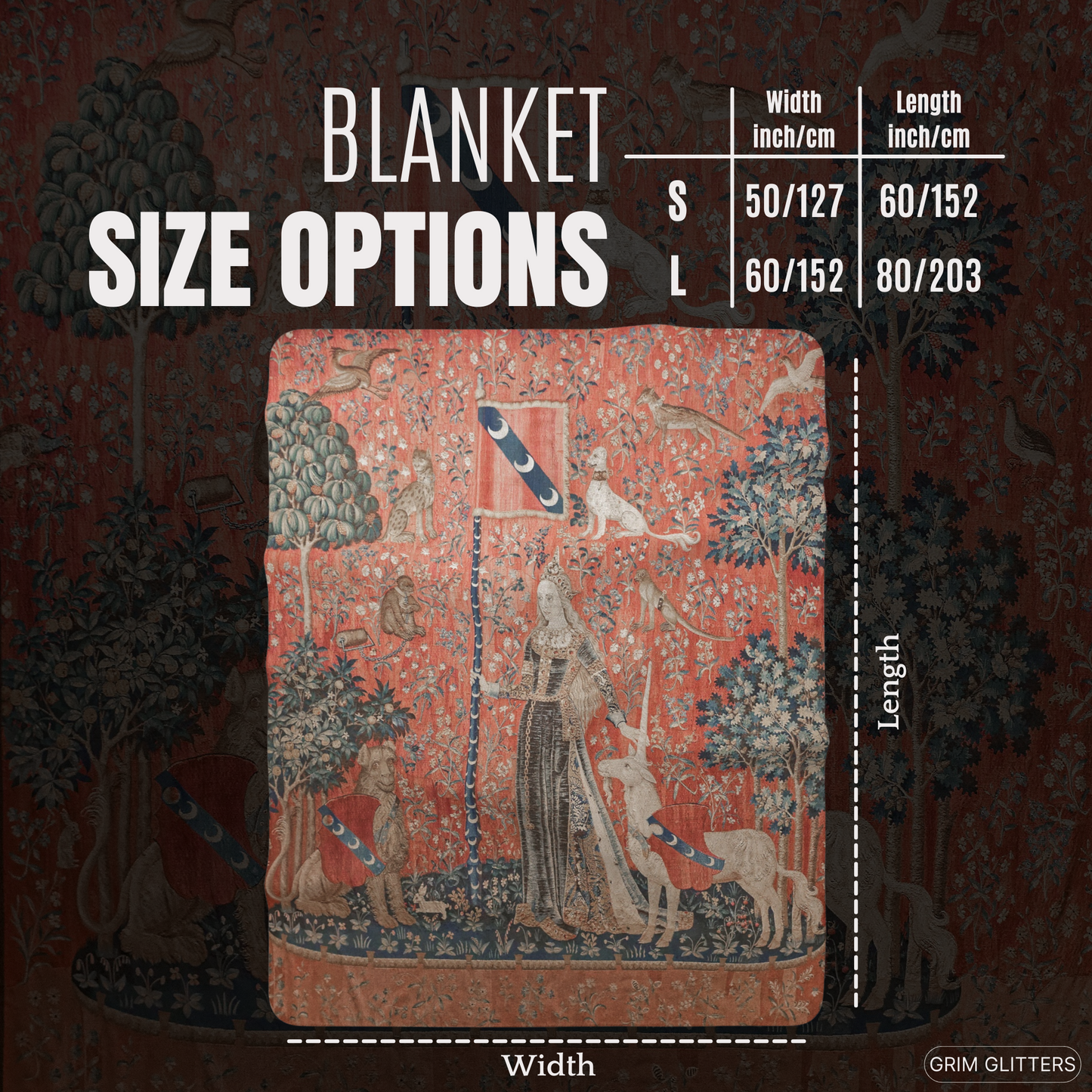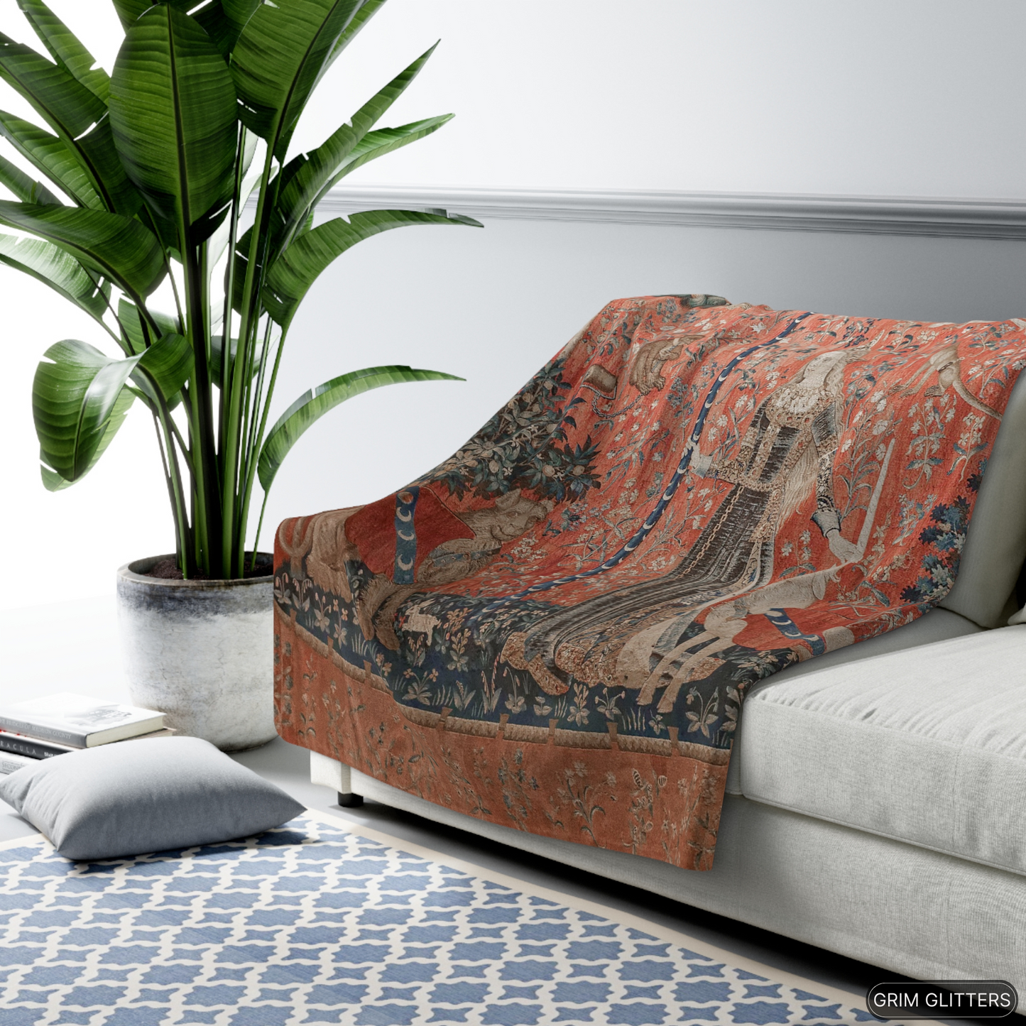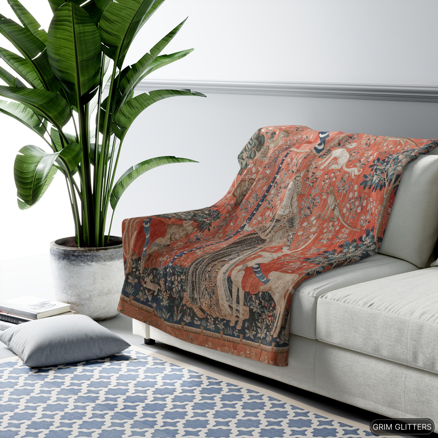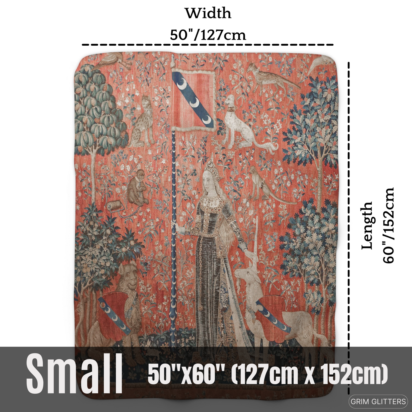 Wrap yourself in the enchanting beauty of medieval artistry with our "The Lady and the Unicorn (Touch)" Sherpa Fleece Blanket. Crafted with the utmost care and attention to detail, this cozy blanket brings the mystical allure of the Unicorn Tapestries into your home.