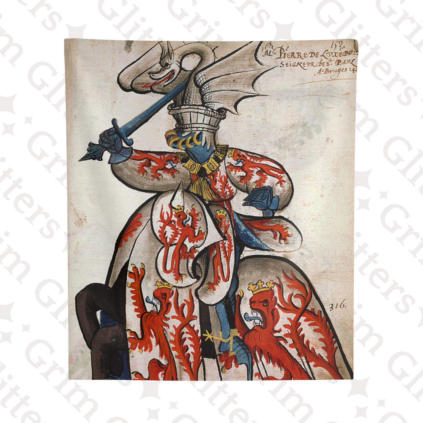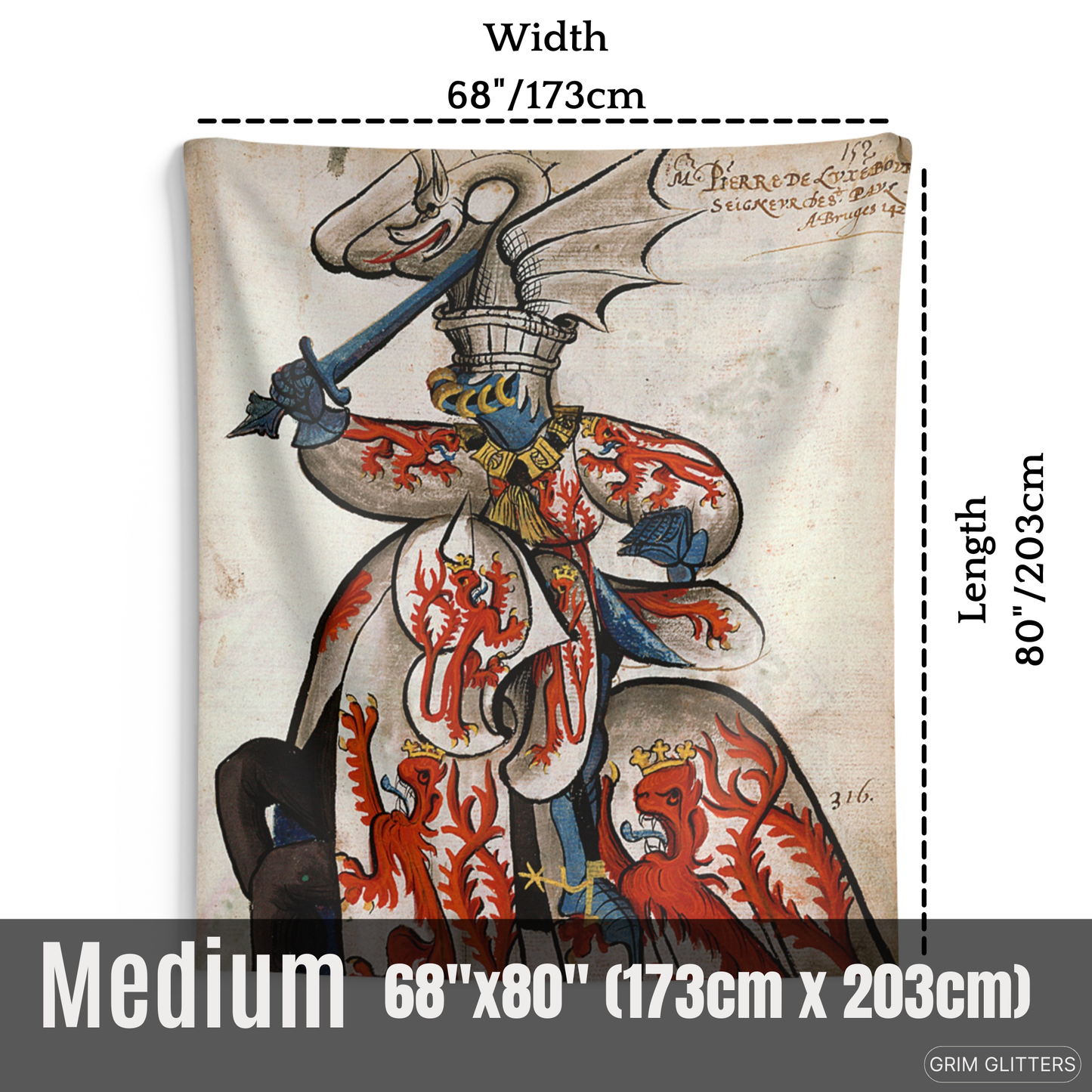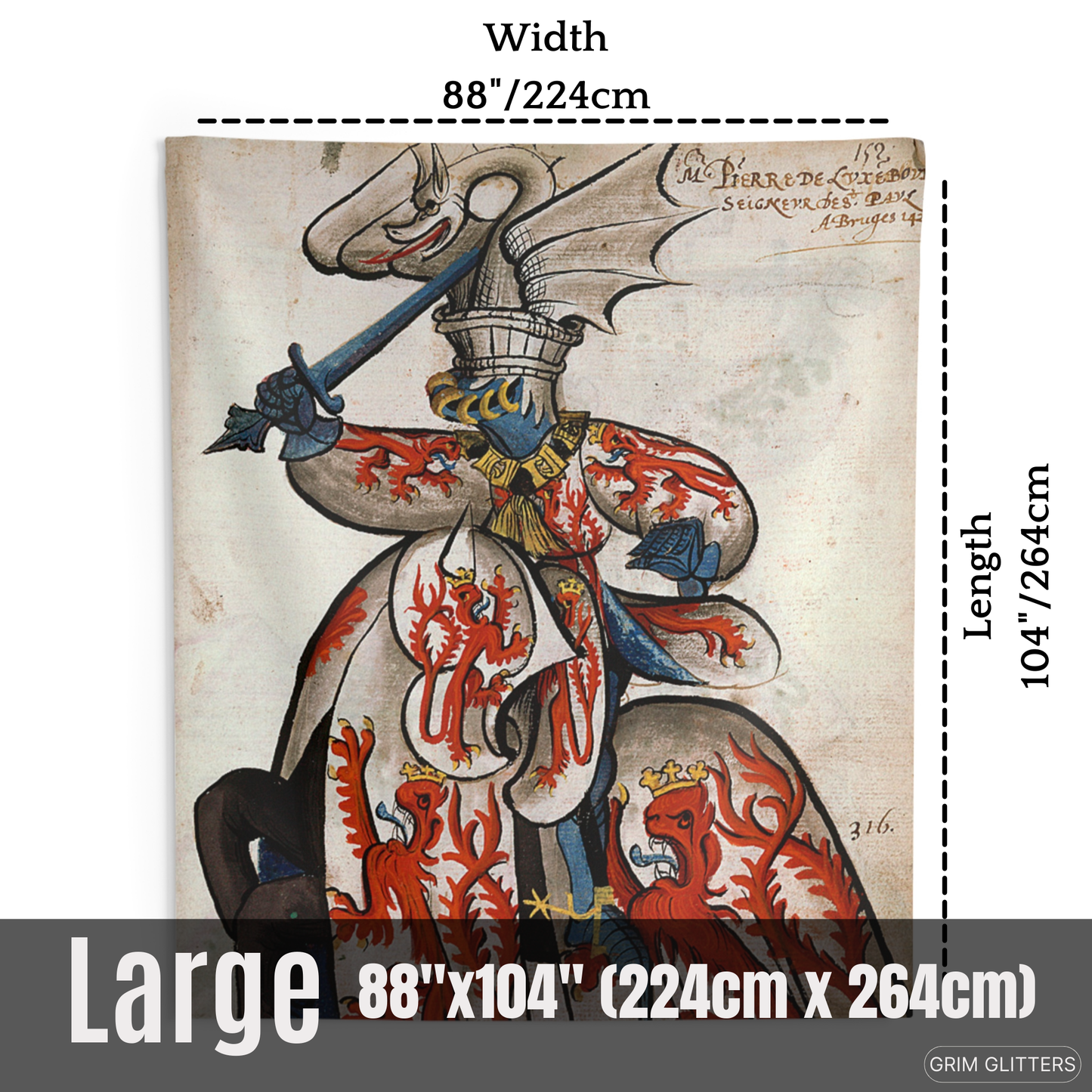 Bring the chivalric spirit of medieval France into your home with The Lord of Beauvoir Tapestry, showcasing John de Luxembourg in all his heraldic glory. This striking tapestry depicts the noble lord clad in white and crimson, adorned with crowned red lions symbolizing power and regal heritage. His dragon-crested helm, with intricate detailing, evokes the valiant legacy of the knights of the Order of the Golden Fleece. Perfect for history enthusiasts and lovers of medieval decor, this tapestry is a magnificent homage to 15th-century heraldry.