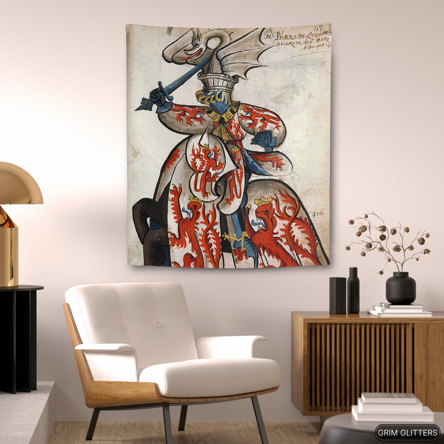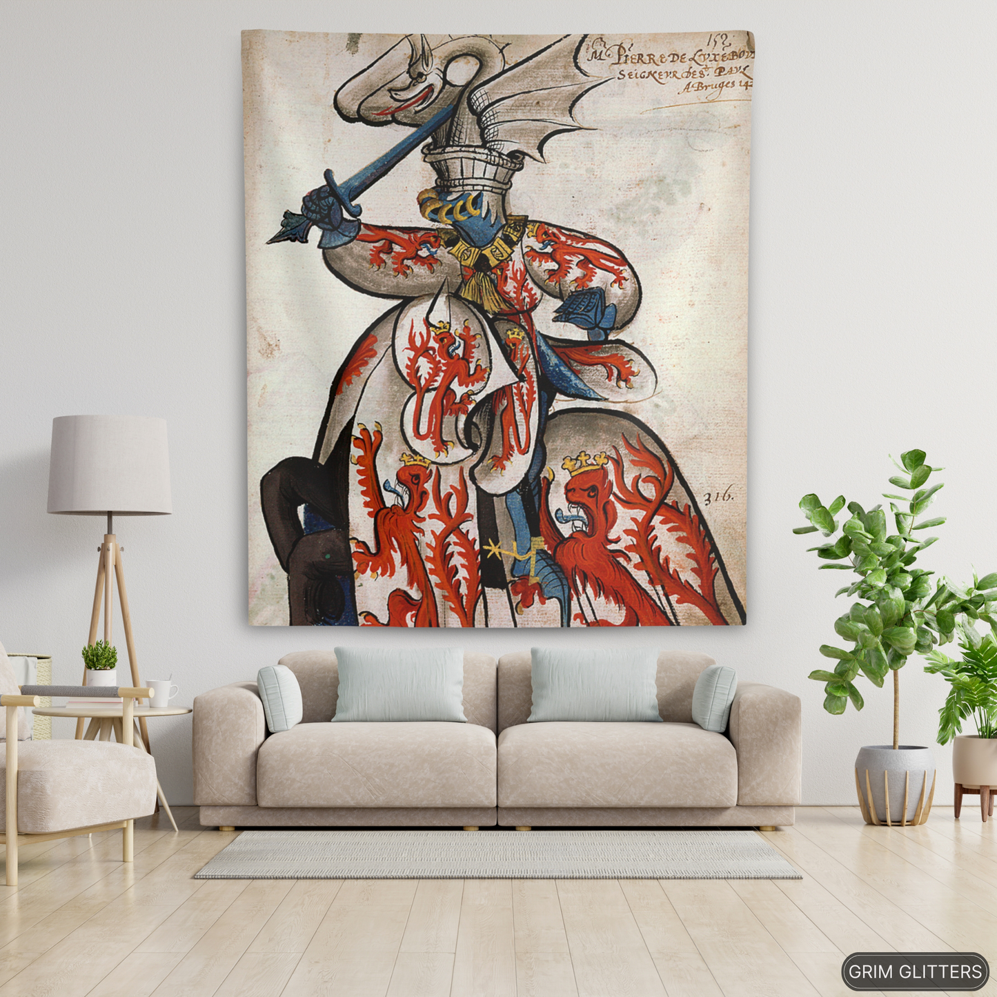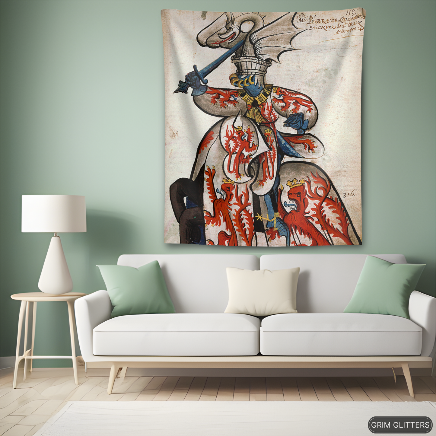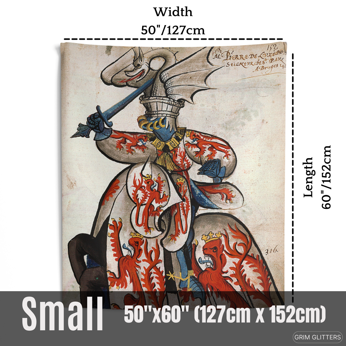 Bring the chivalric spirit of medieval France into your home with The Lord of Beauvoir Tapestry, showcasing John de Luxembourg in all his heraldic glory. This striking tapestry depicts the noble lord clad in white and crimson, adorned with crowned red lions symbolizing power and regal heritage. His dragon-crested helm, with intricate detailing, evokes the valiant legacy of the knights of the Order of the Golden Fleece. Perfect for history enthusiasts and lovers of medieval decor, this tapestry is a magnificent homage to 15th-century heraldry.