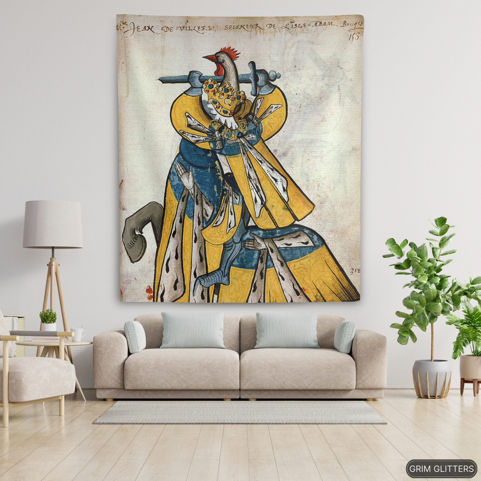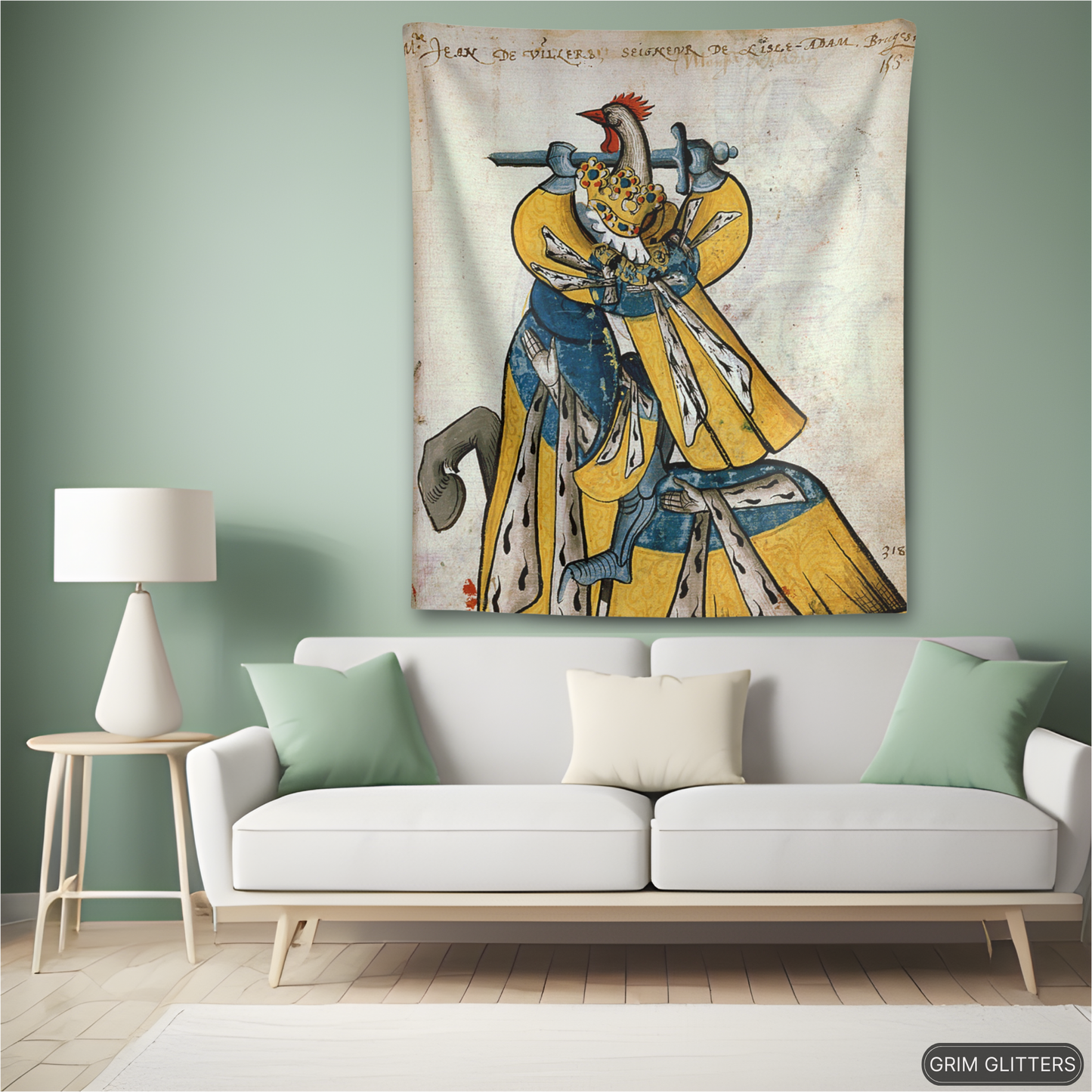 Step into the pages of history with The Lord of L'Isle-Adam Tapestry, a majestic depiction of Jean de Villiers from the Great Equestrian Armorial of the Golden Fleece. This exquisite piece showcases the noble lord adorned in golden and blue heraldic robes, detailed with ermine accents and crowned by a striking rooster helm—a symbol of vigilance and gallantry. A masterpiece of medieval artistry, this tapestry is perfect for history lovers and those inspired by the chivalric splendor of France’s storied past.