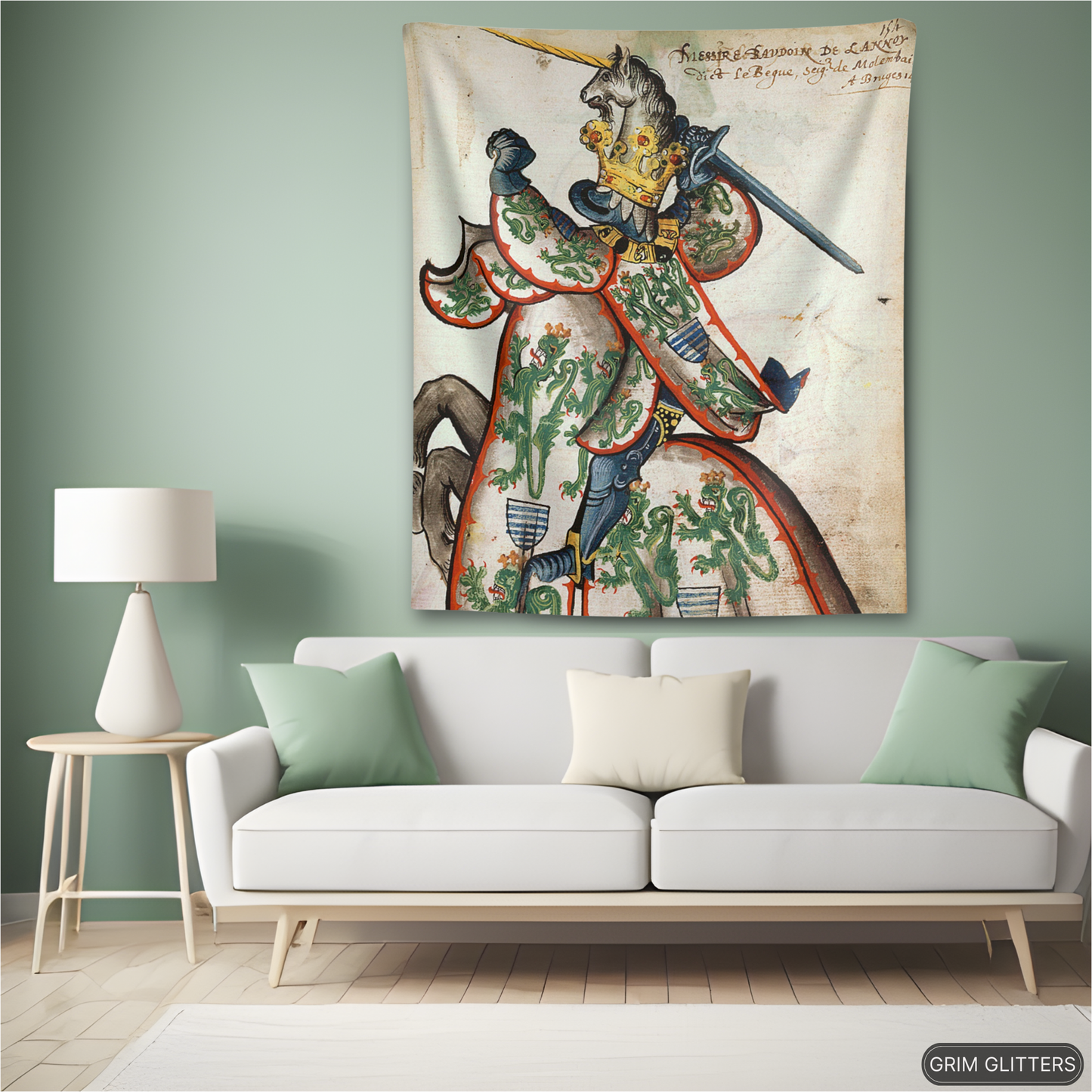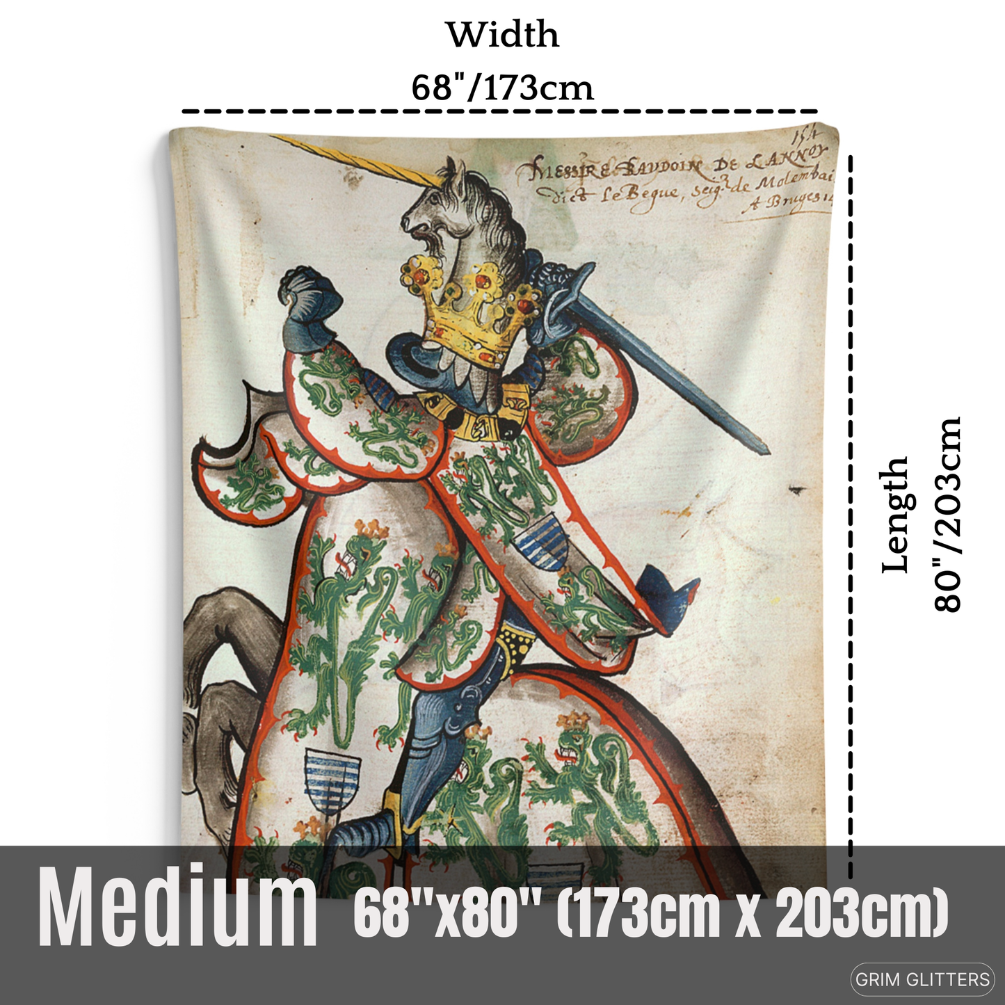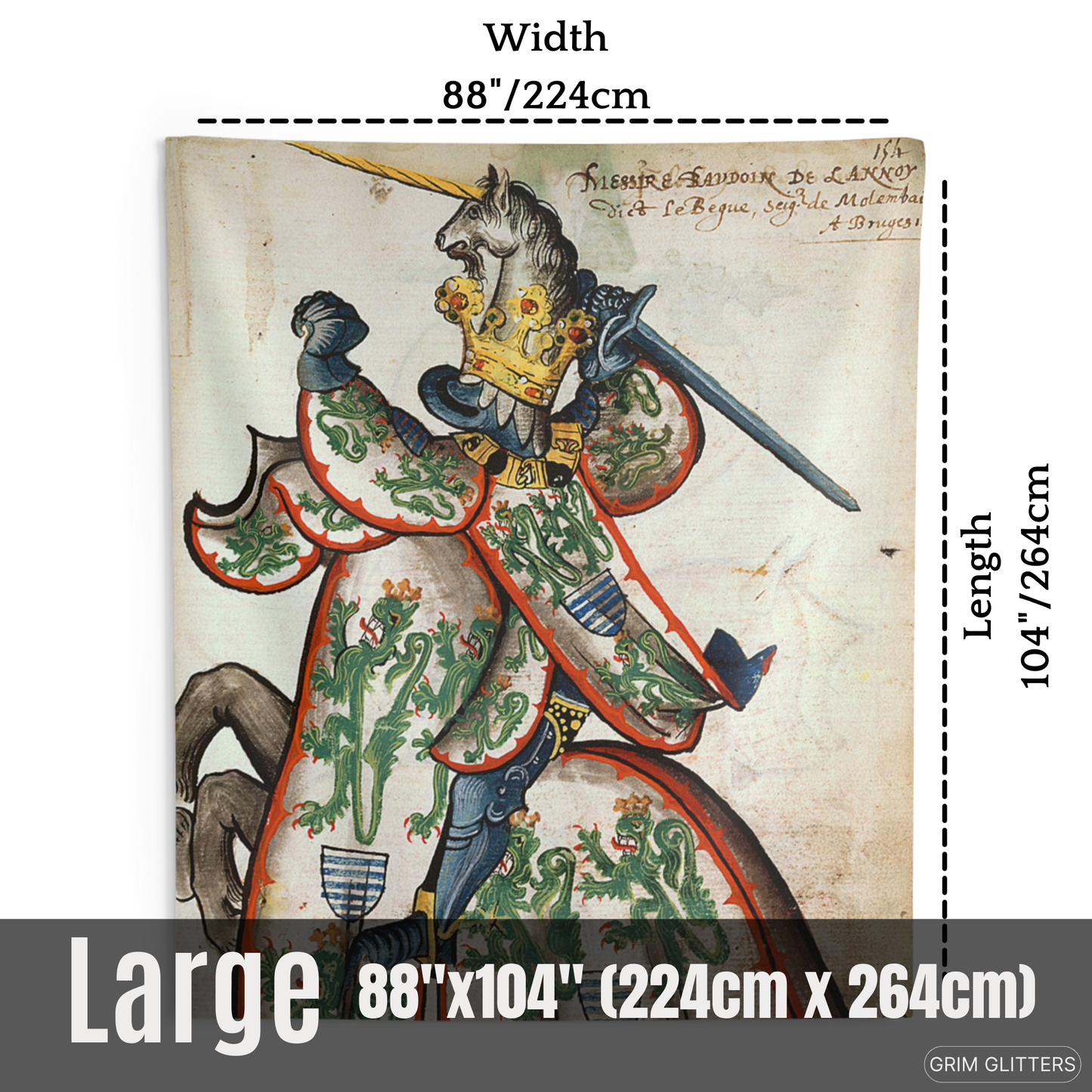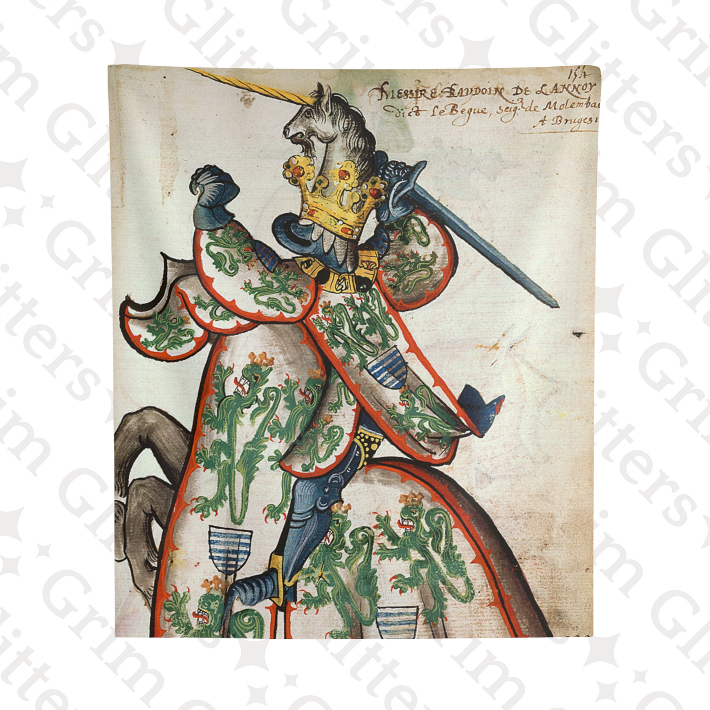 Celebrate the legacy of Baudouin de Lannoy with The Lord of Molembais Tapestry, a breathtaking depiction from the Great Equestrian Armorial of the Golden Fleece. This historic masterpiece features Baudouin clad in an intricate surcoat adorned with crowned green lions, emblems of nobility and valor, accompanied by a golden unicorn helm. This tapestry is a stunning tribute to medieval chivalry and heraldry, perfect for history lovers, art enthusiasts, and admirers of French nobility.