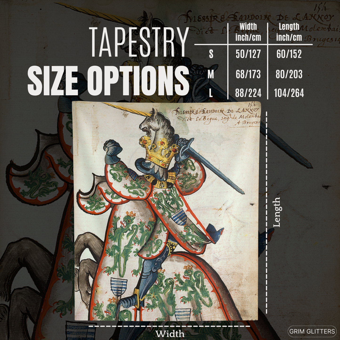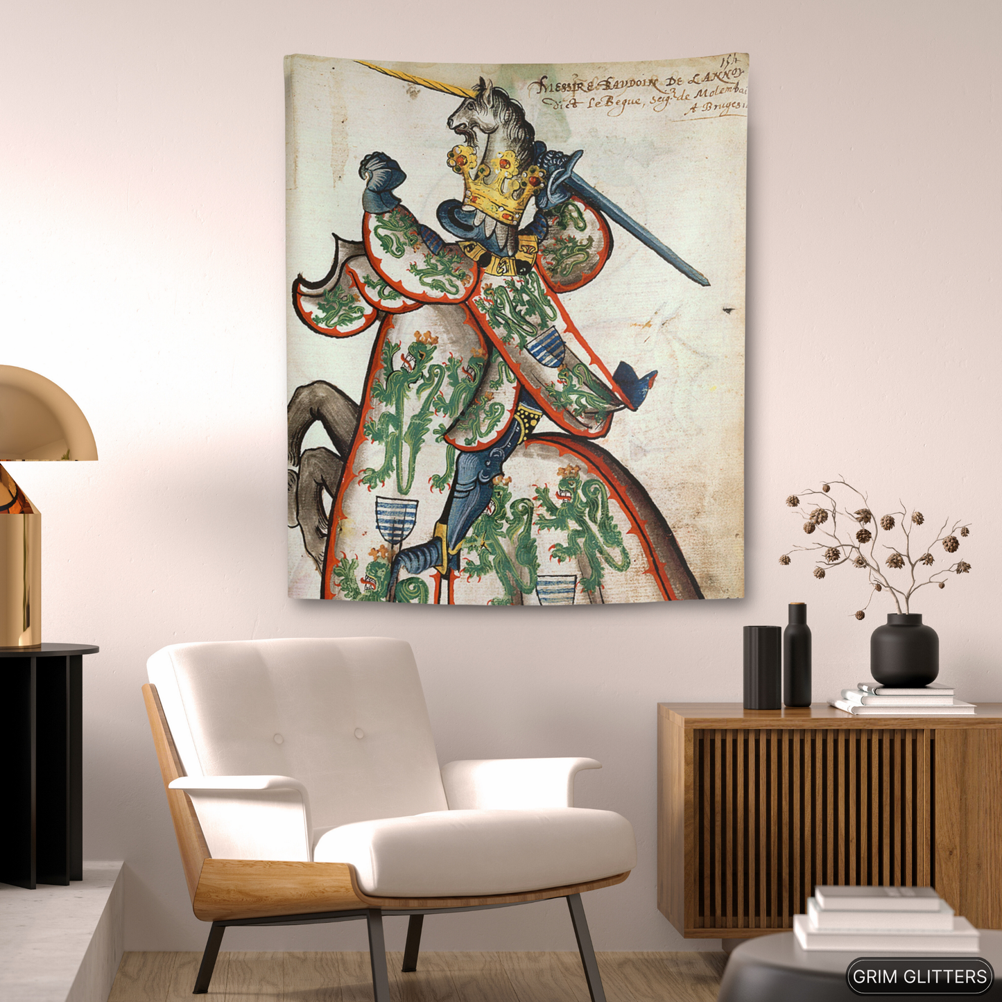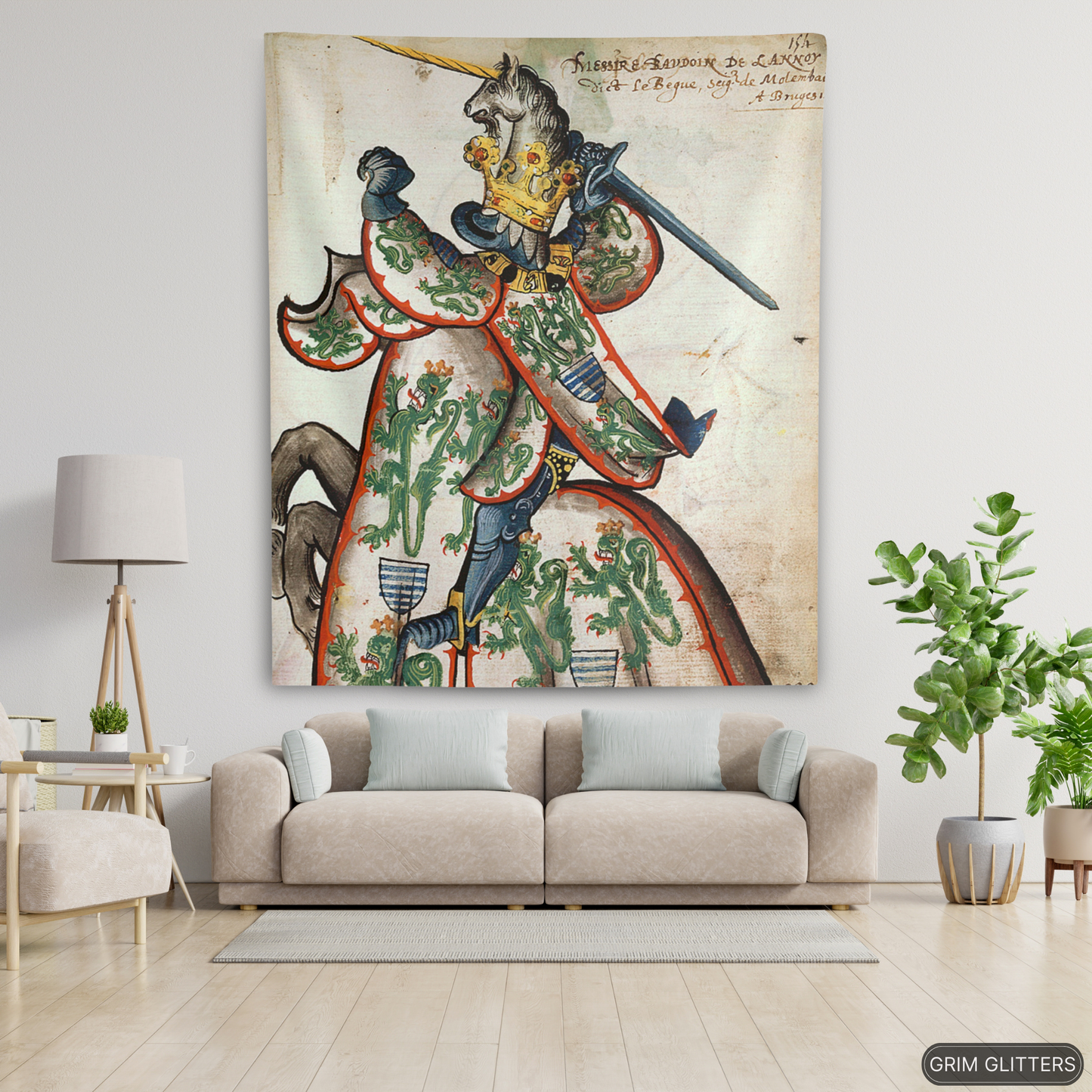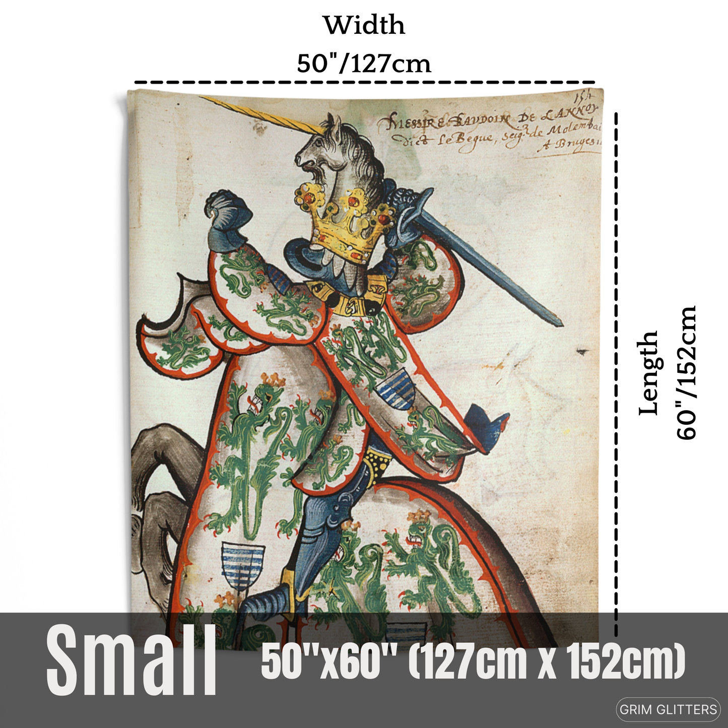 Celebrate the legacy of Baudouin de Lannoy with The Lord of Molembais Tapestry, a breathtaking depiction from the Great Equestrian Armorial of the Golden Fleece. This historic masterpiece features Baudouin clad in an intricate surcoat adorned with crowned green lions, emblems of nobility and valor, accompanied by a golden unicorn helm. This tapestry is a stunning tribute to medieval chivalry and heraldry, perfect for history lovers, art enthusiasts, and admirers of French nobility.