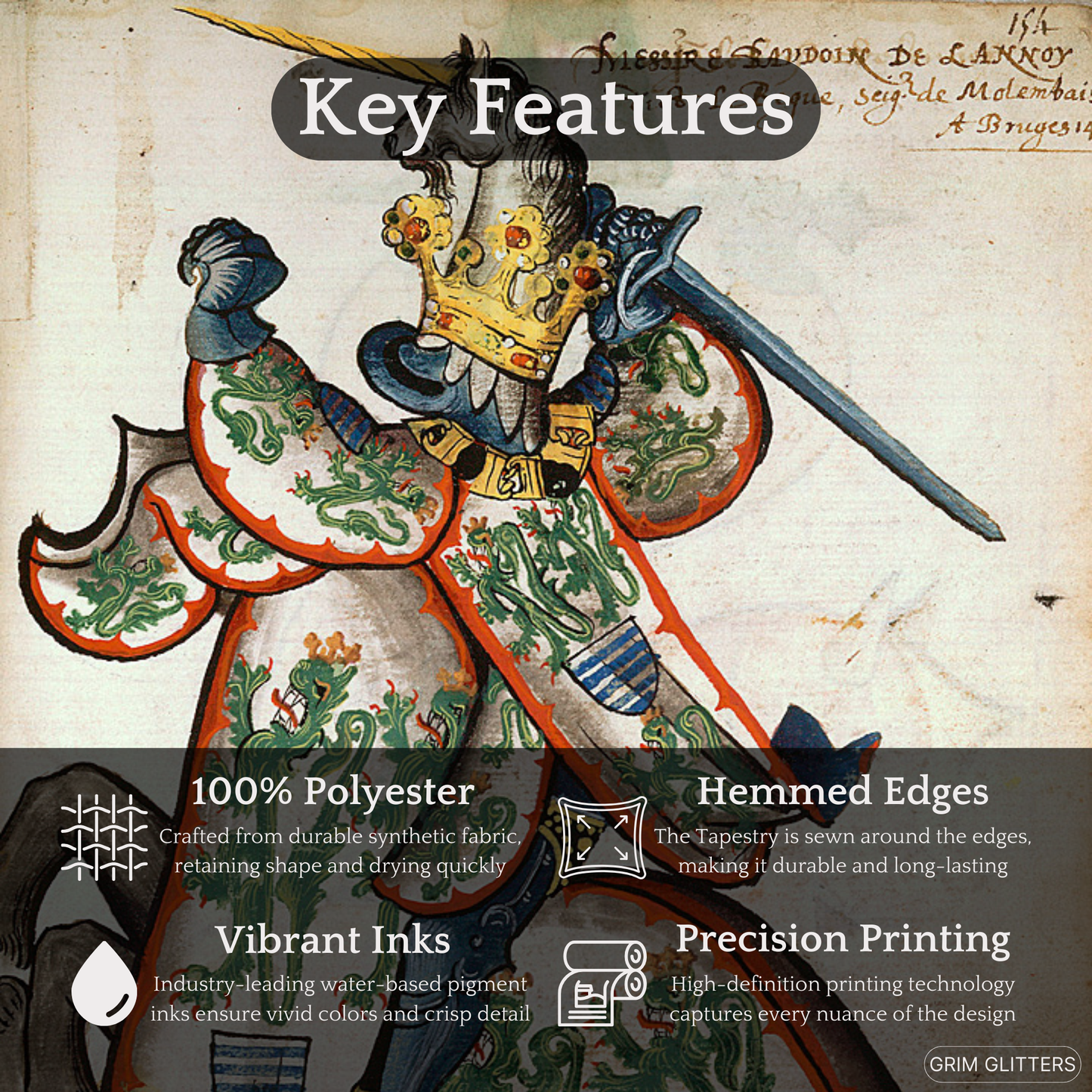 This meticulously recreated tapestry captures the grandeur and artistry of the Golden Fleece manuscript. Its vibrant colors and heraldic motifs bring a regal, medieval atmosphere to your living space, adding sophistication and historic charm to any room.