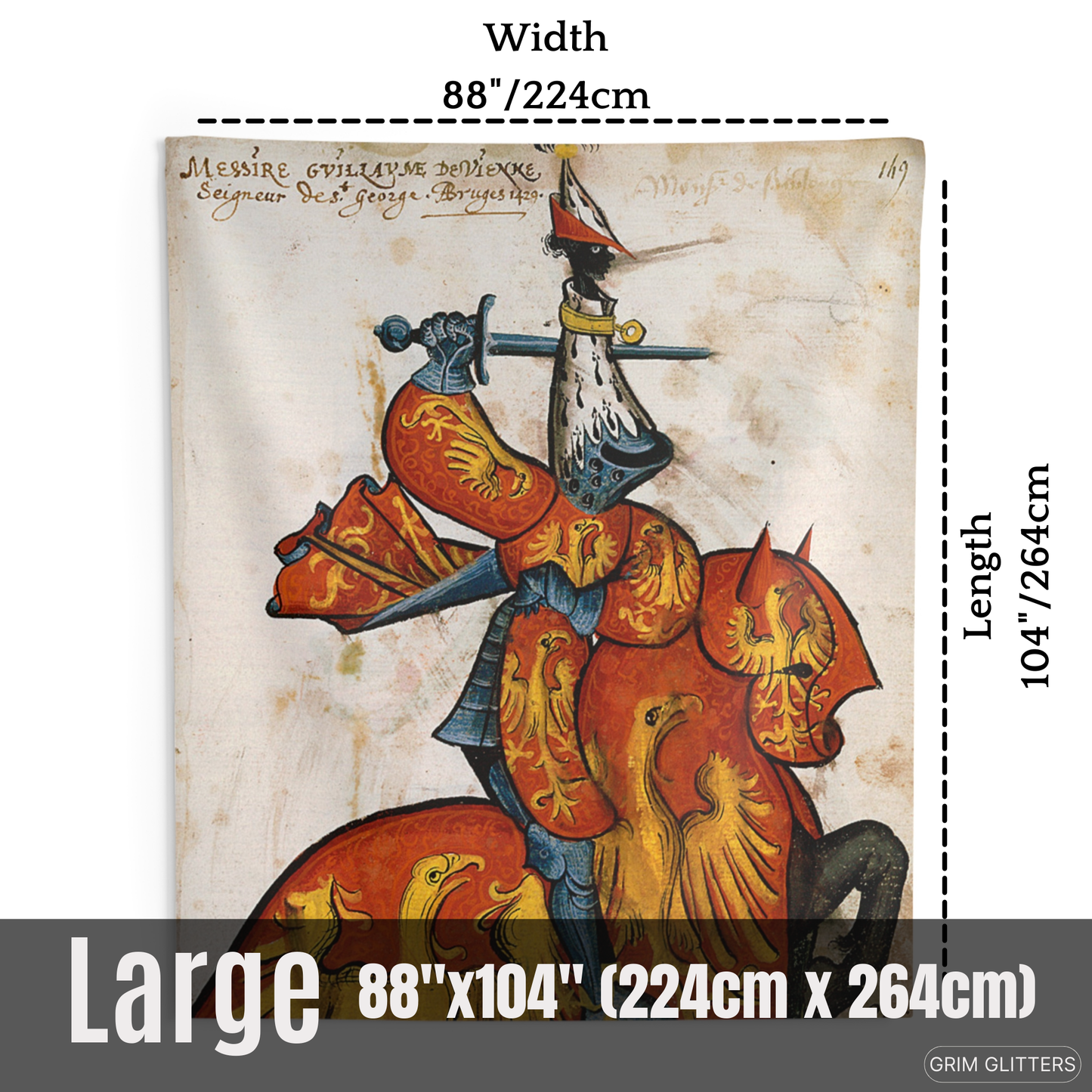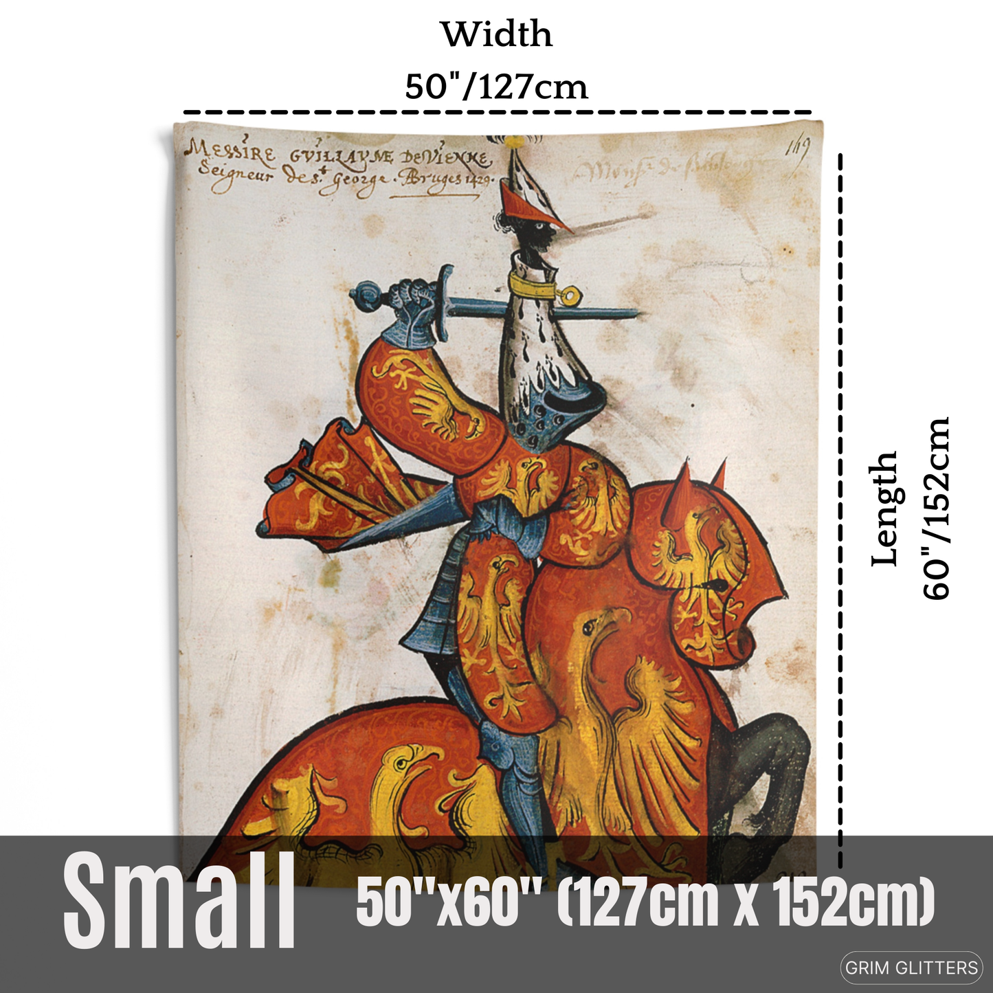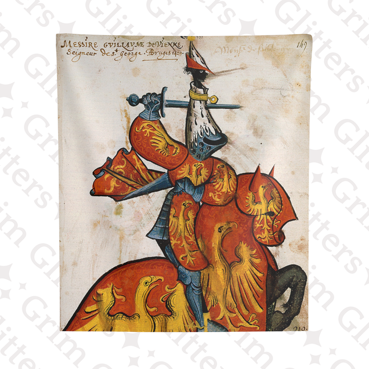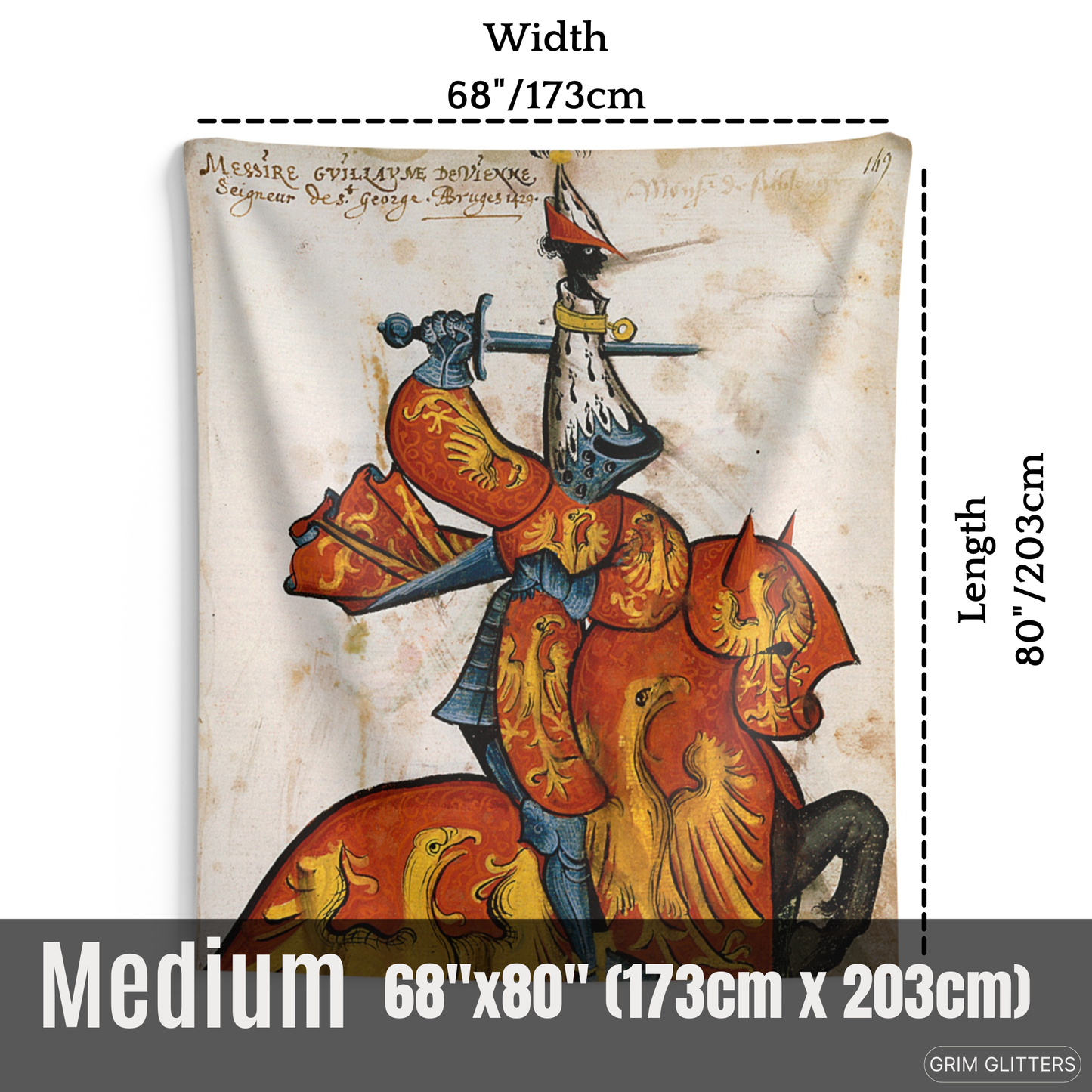 Immerse yourself in the grandeur of medieval France with The Lord of Saint-Georges Tapestry, featuring Guillaume de Vienne, a celebrated knight of the Golden Fleece. This magnificent tapestry captures Guillaume in vibrant red and gold heraldry, adorned with radiant golden eagles symbolizing power and vigilance. His striking armor and distinctive ermine-accented helm pay tribute to the artistry and prestige of the medieval era. Perfect for history enthusiasts and lovers of heraldic decor, this tapestry brings the splendor of the chivalric age into your space.