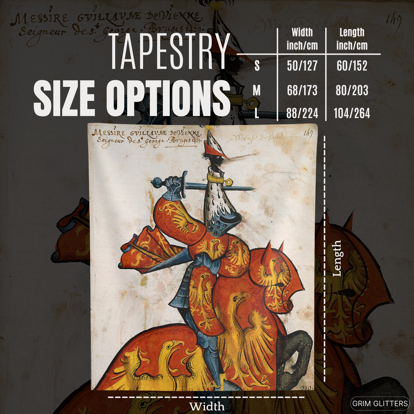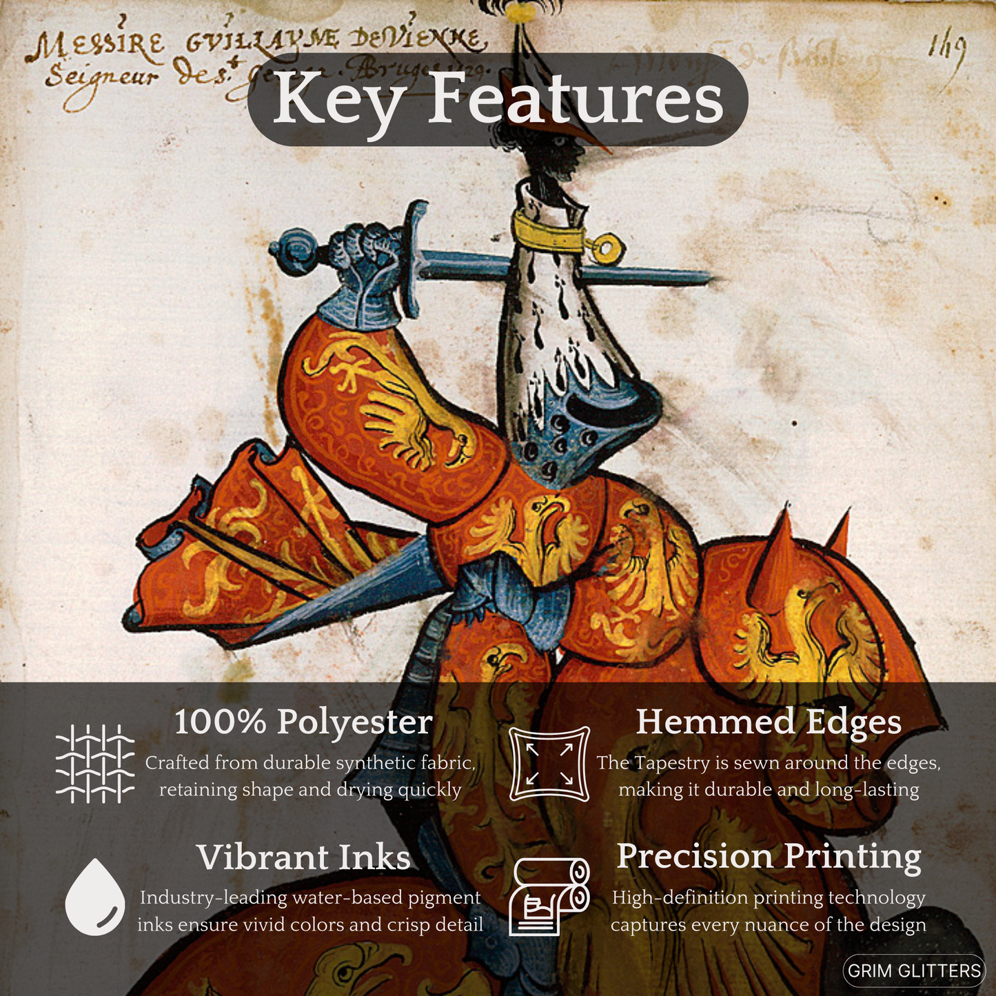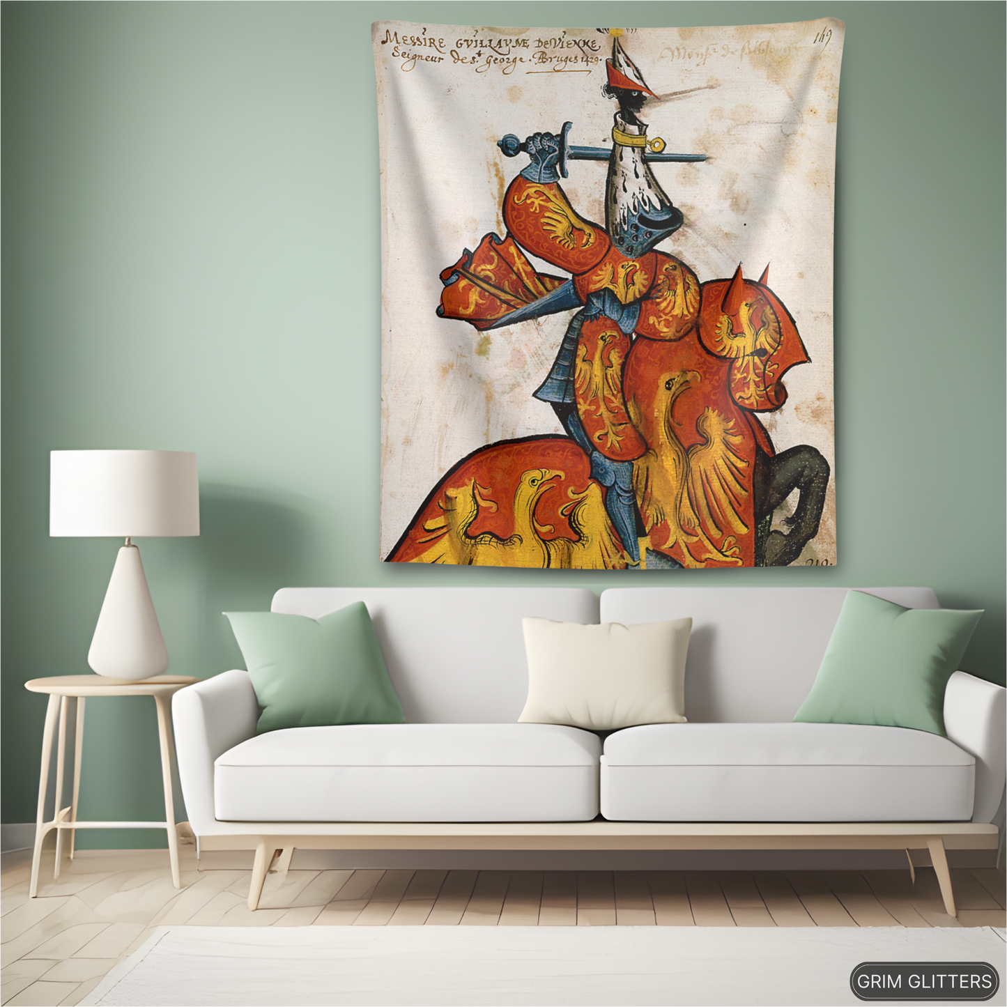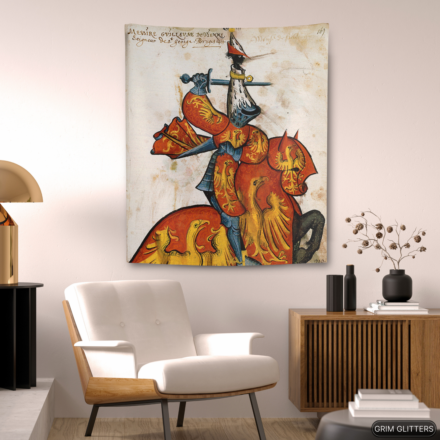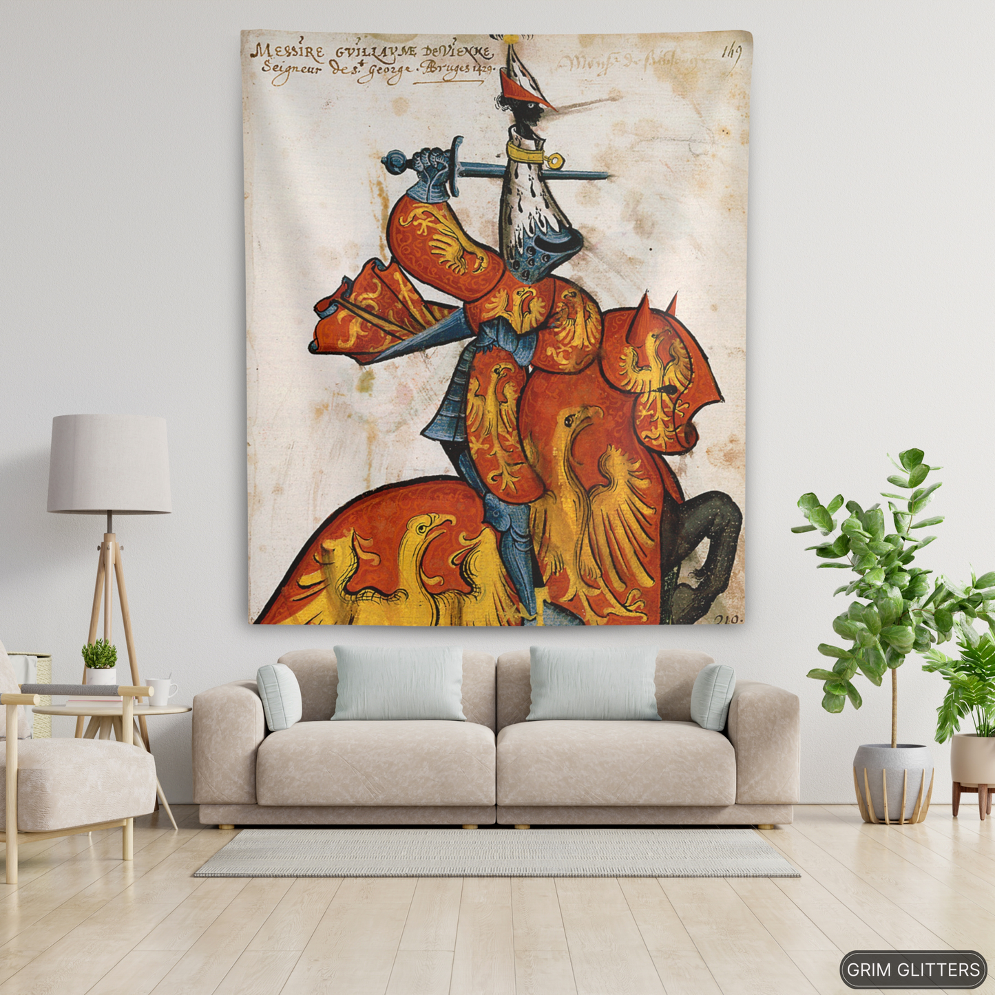 Immerse yourself in the grandeur of medieval France with The Lord of Saint-Georges Tapestry, featuring Guillaume de Vienne, a celebrated knight of the Golden Fleece. This magnificent tapestry captures Guillaume in vibrant red and gold heraldry, adorned with radiant golden eagles symbolizing power and vigilance. His striking armor and distinctive ermine-accented helm pay tribute to the artistry and prestige of the medieval era. Perfect for history enthusiasts and lovers of heraldic decor, this tapestry brings the splendor of the chivalric age into your space.