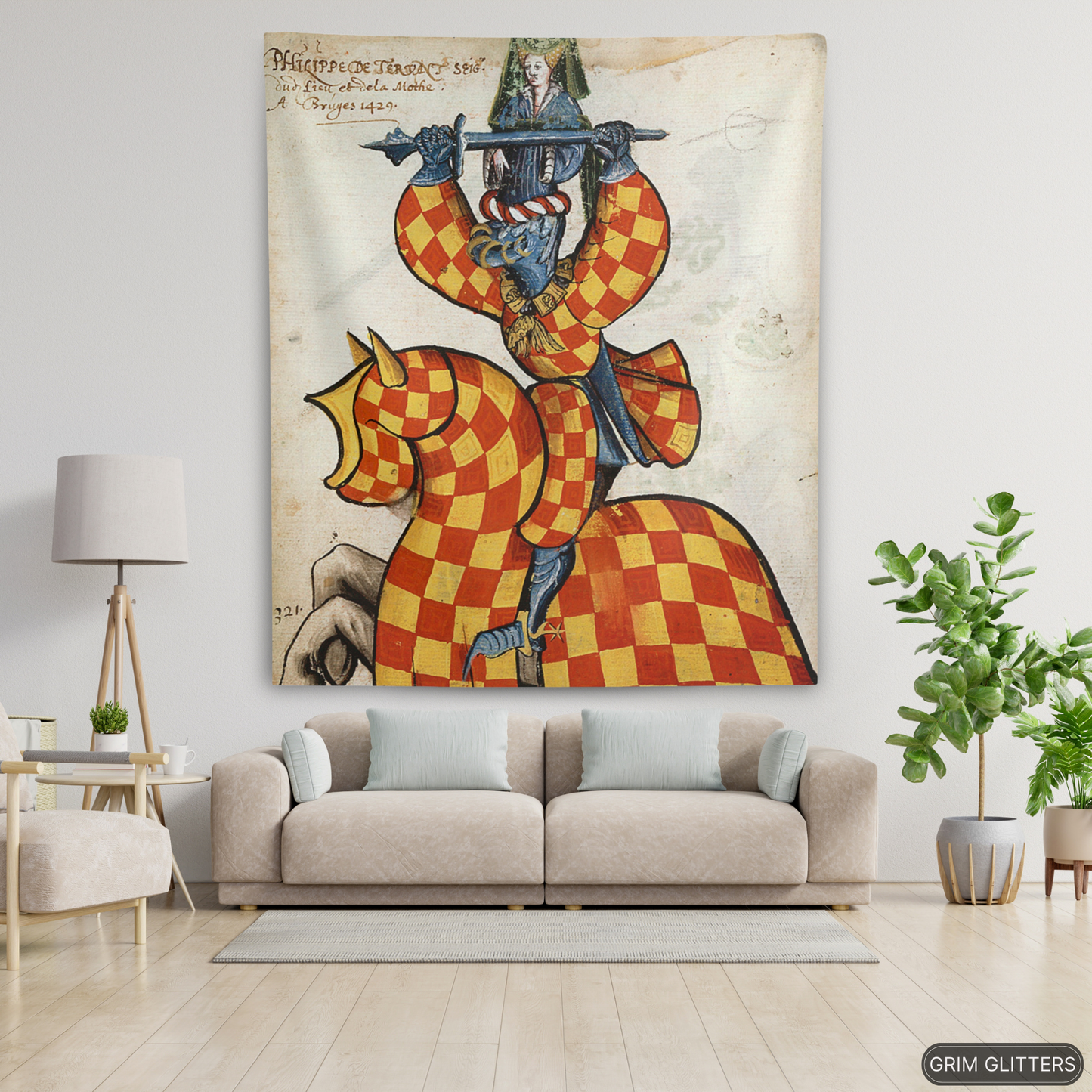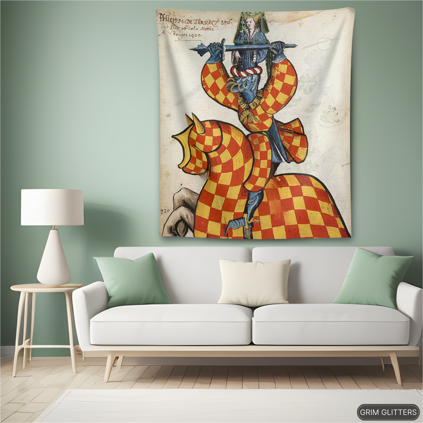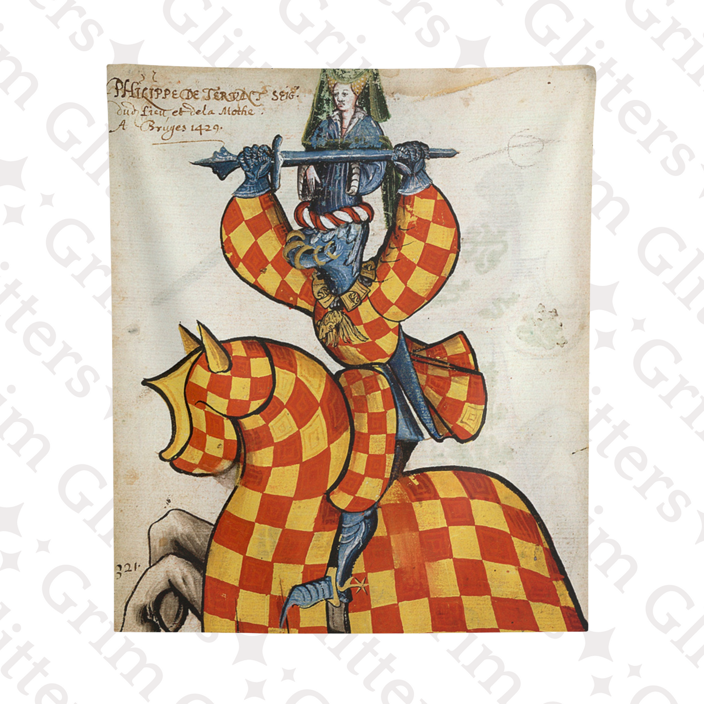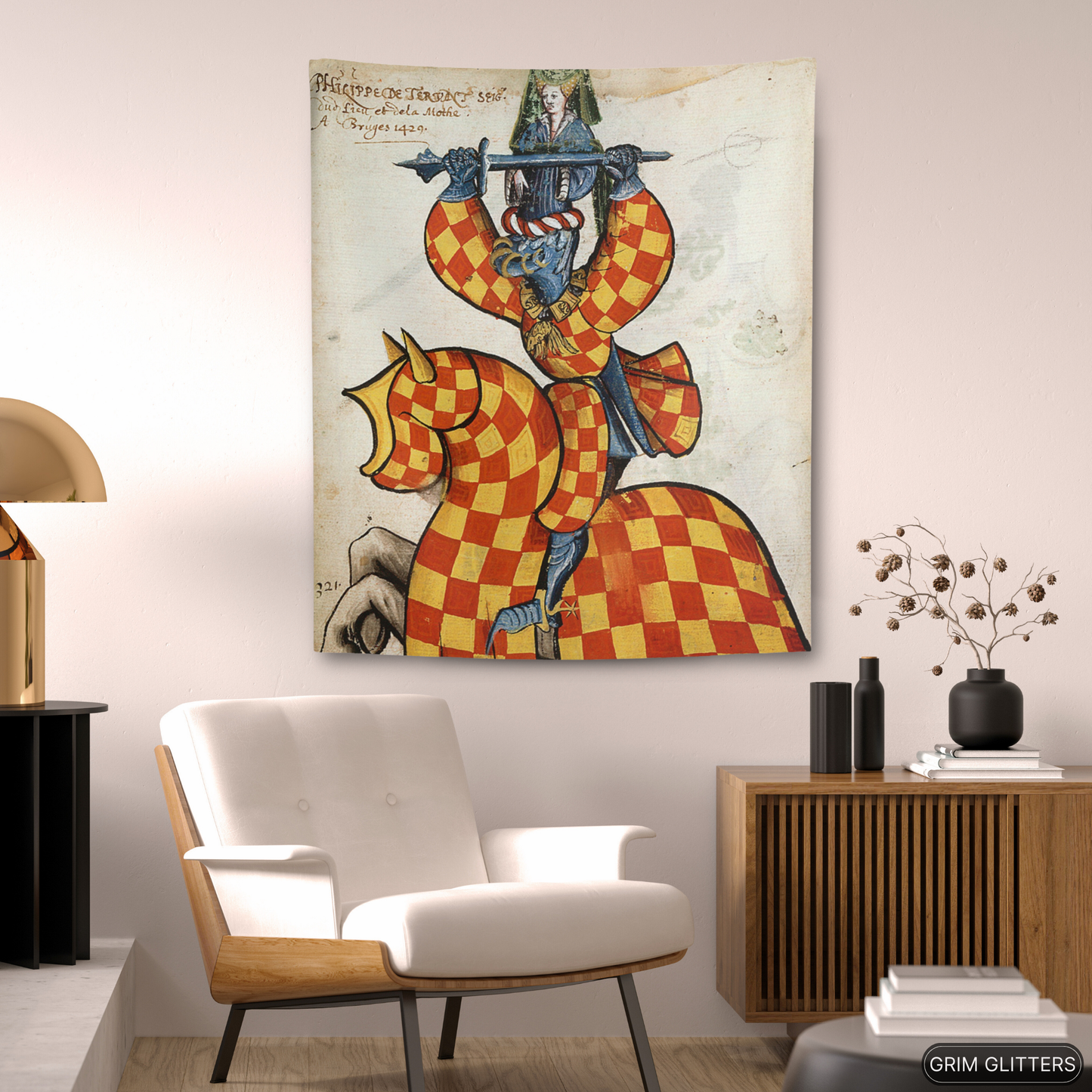 Celebrate the heraldic elegance of Philippe de Ternant with The Lord of Ternant Tapestry, inspired by the Great Equestrian Armorial of the Golden Fleece. This striking design features Philippe adorned in a bold orange and yellow checkered surcoat, a testament to his noble heritage. The unique helm, crowned with a stately figure of a lady, adds an air of distinction and intrigue. This tapestry is a perfect centerpiece for history enthusiasts, medieval decor admirers, and those captivated by the artistry of chivalric France.