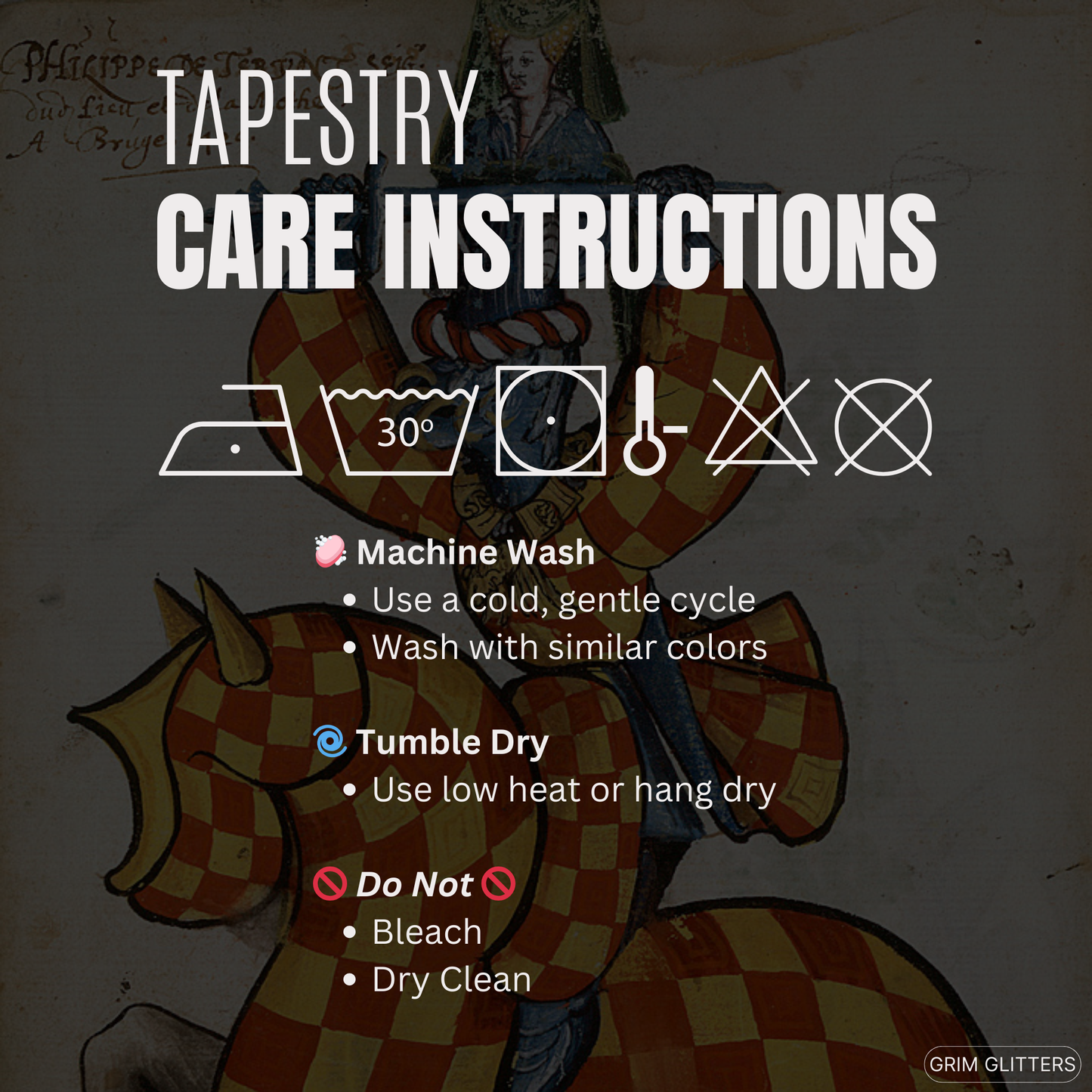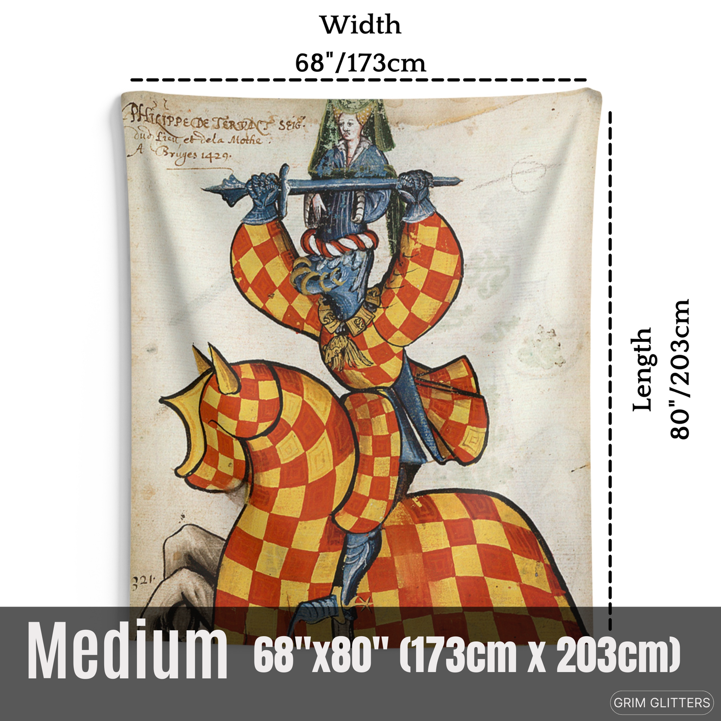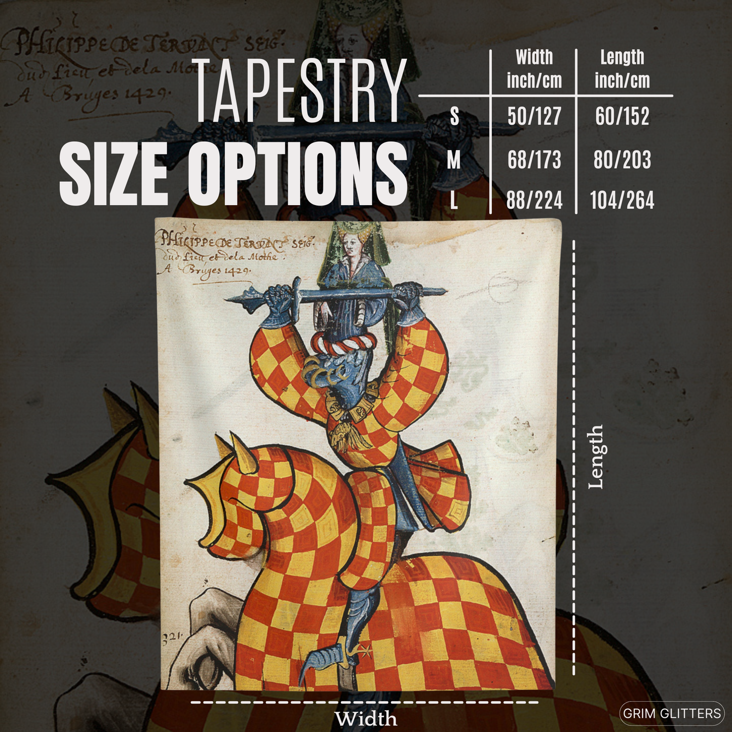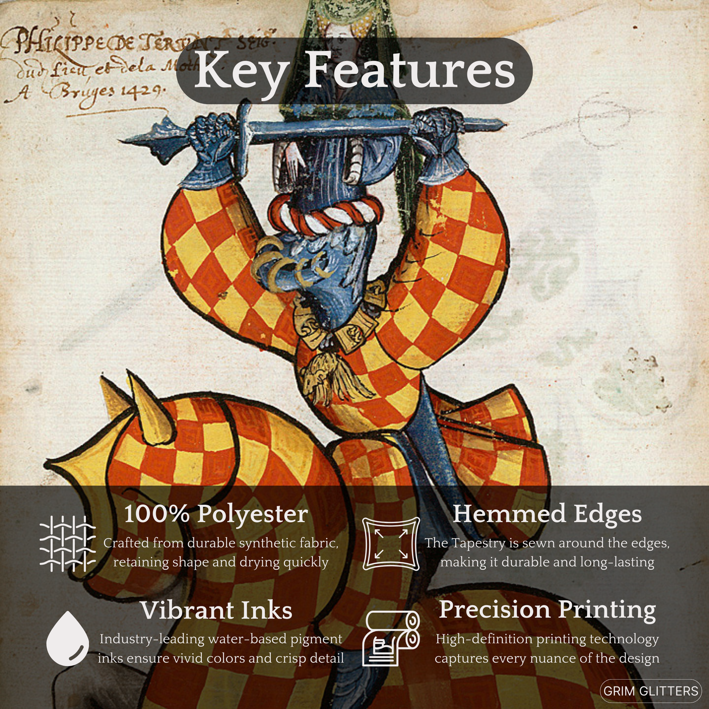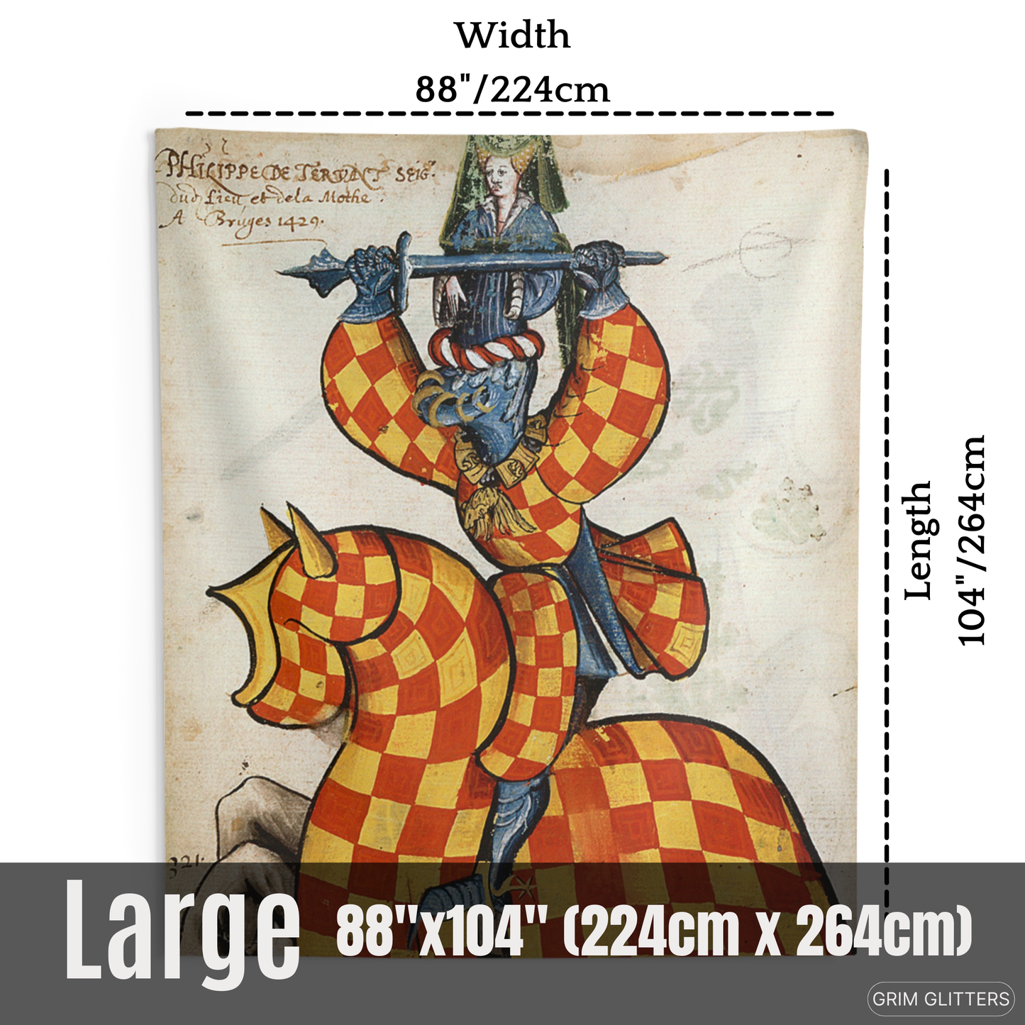 Celebrate the heraldic elegance of Philippe de Ternant with The Lord of Ternant Tapestry, inspired by the Great Equestrian Armorial of the Golden Fleece. This striking design features Philippe adorned in a bold orange and yellow checkered surcoat, a testament to his noble heritage. The unique helm, crowned with a stately figure of a lady, adds an air of distinction and intrigue. This tapestry is a perfect centerpiece for history enthusiasts, medieval decor admirers, and those captivated by the artistry of chivalric France.