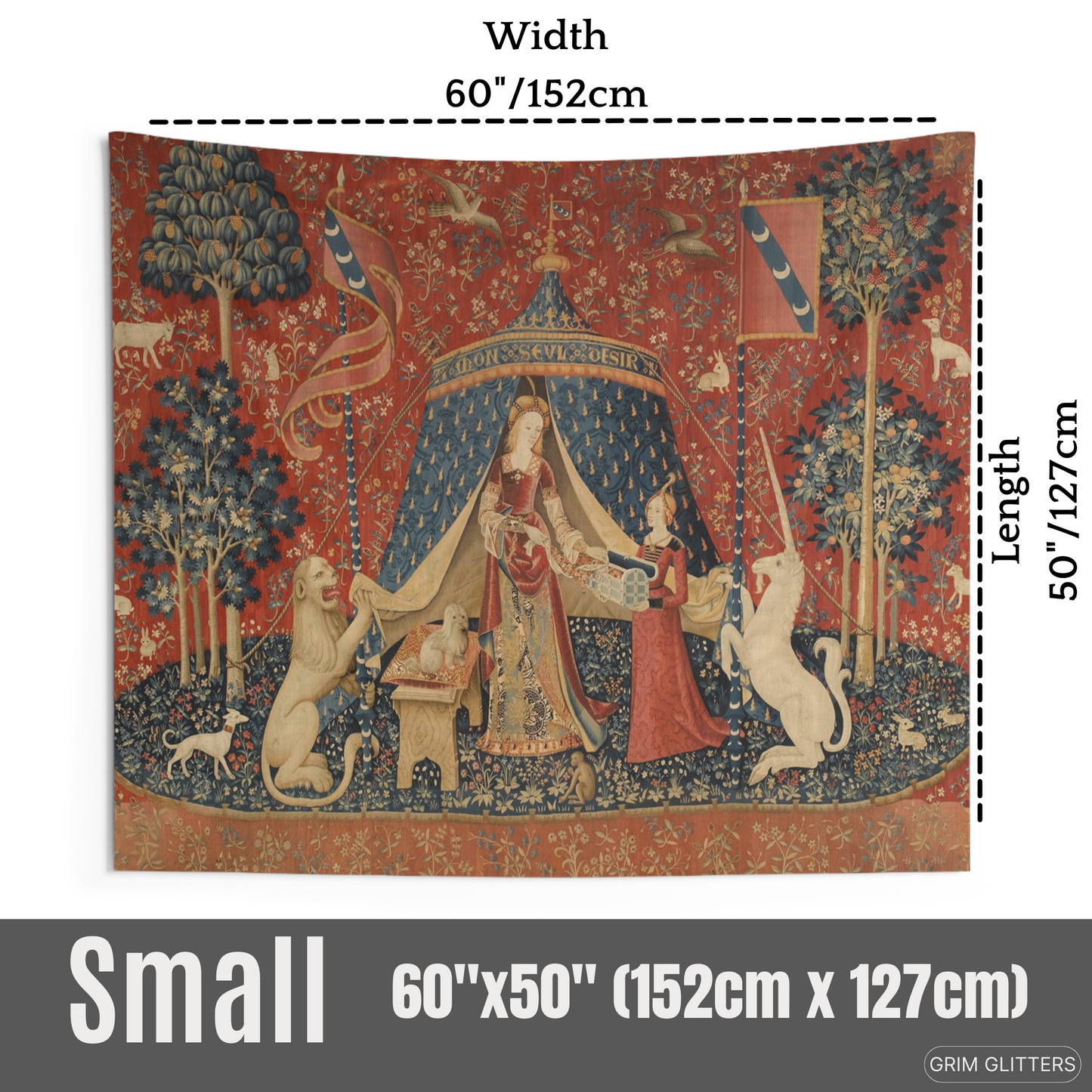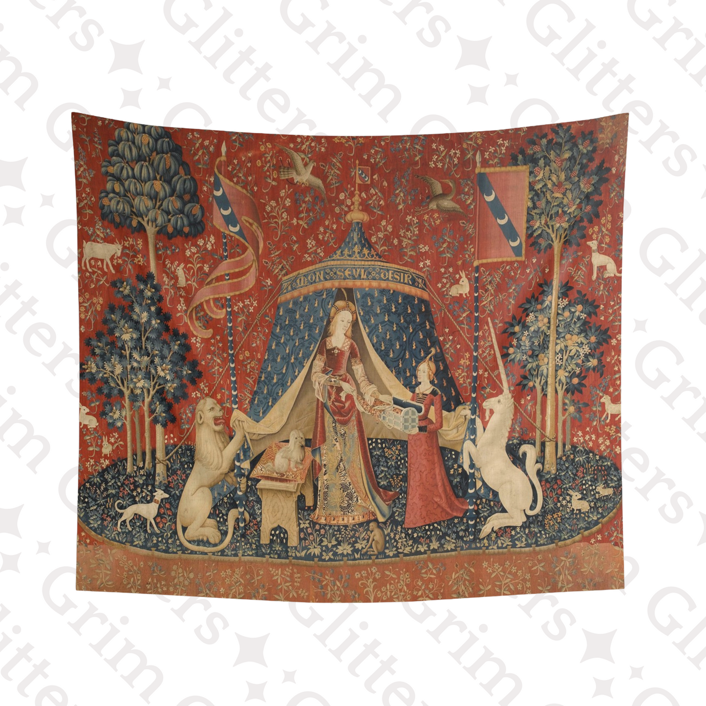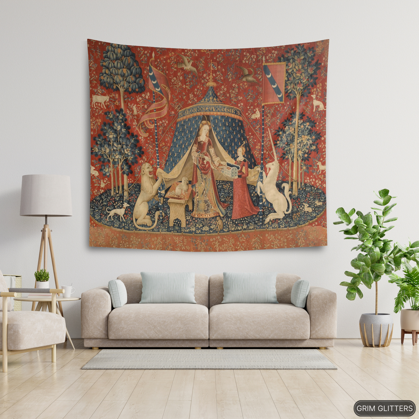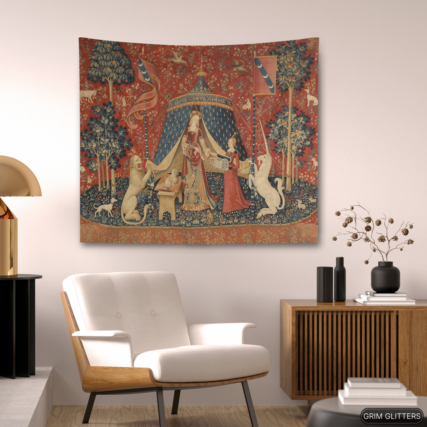 Step into the enchanting world of medieval artistry with our The Lady and the Unicorn (Desire) Tapestry. Capturing the essence of wonder and elegance, this tapestry brings to life the iconic imagery of the Unicorn Tapestries, transporting you to a realm of magic and fantasy.