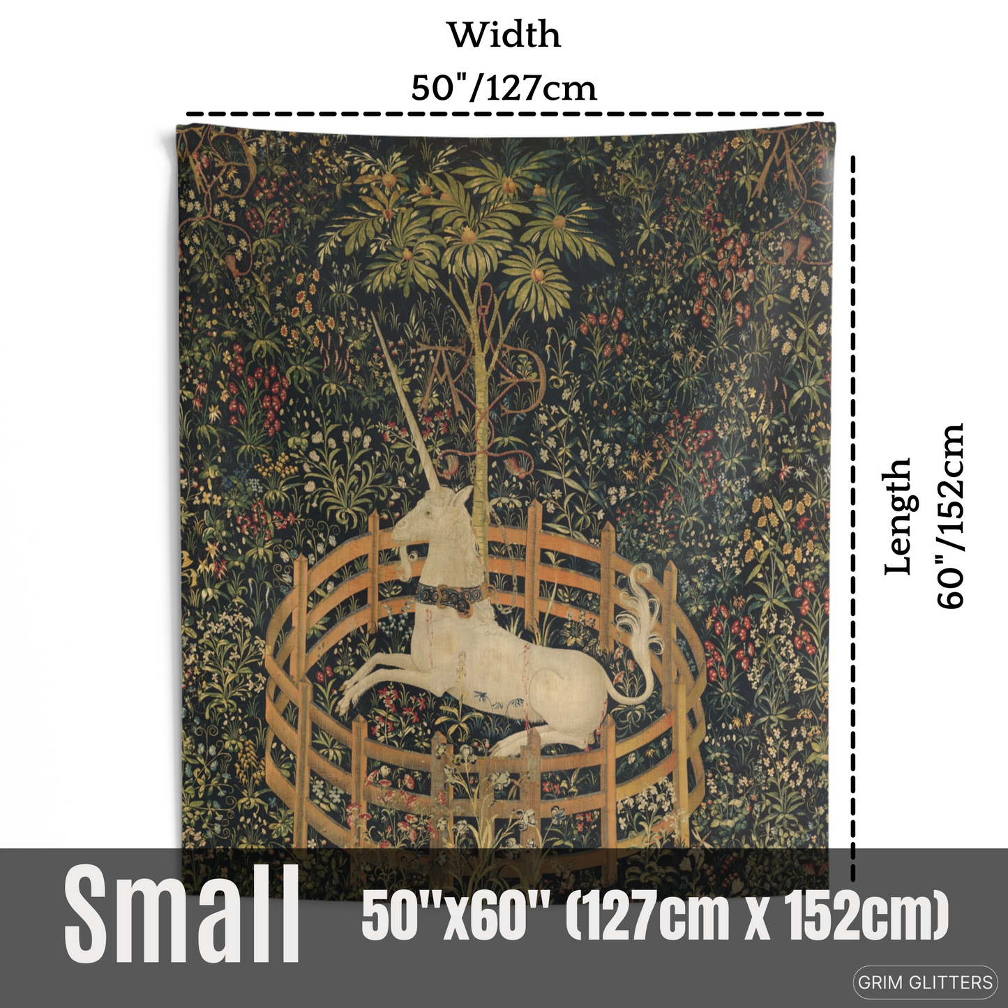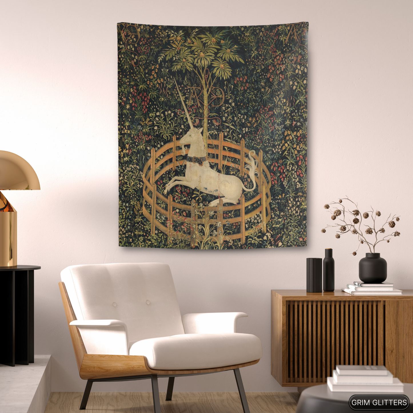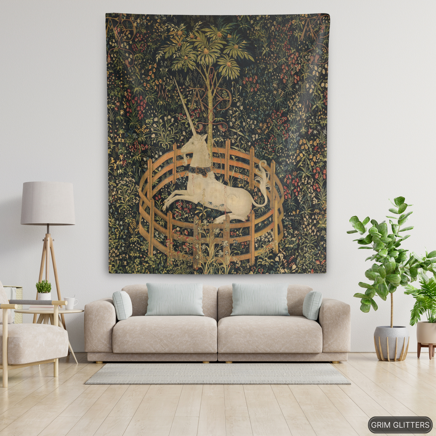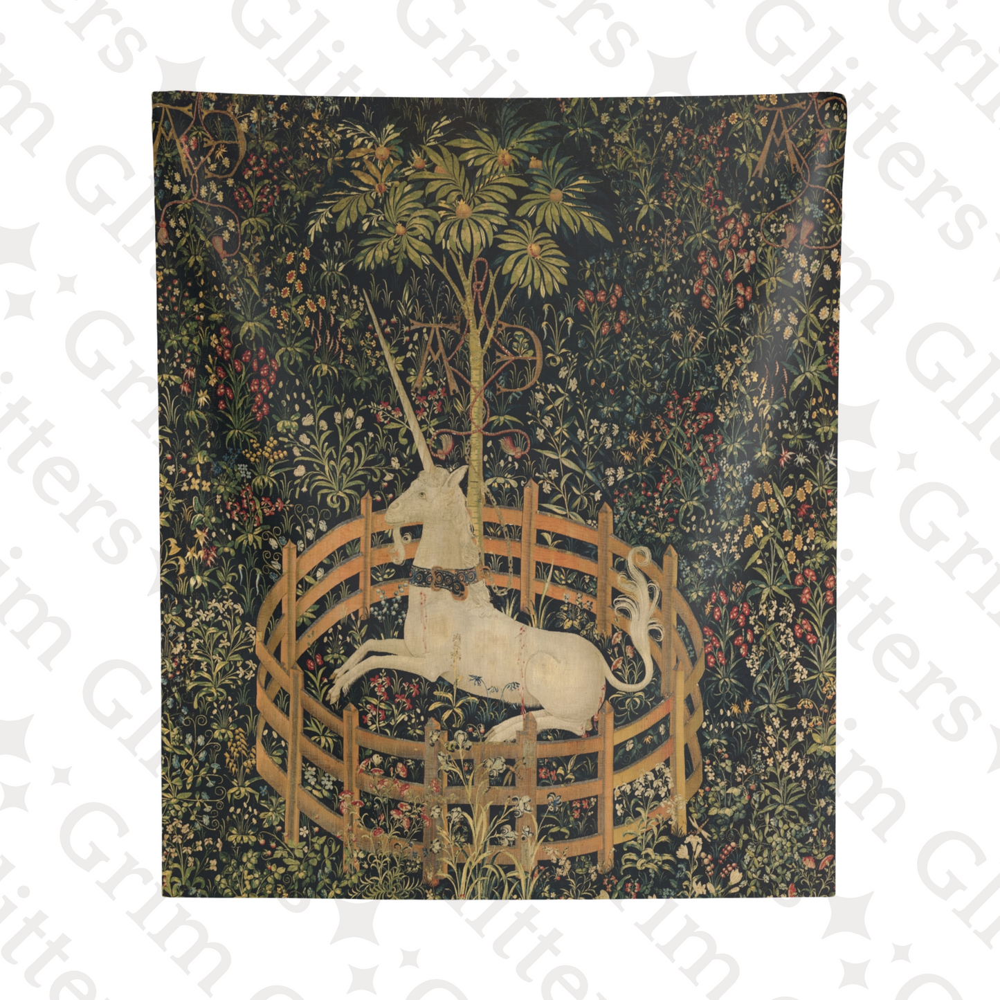 Bring a touch of magic and mystique into your home with our "Unicorn in Captivity" tapestry reproduction. Embrace the enchantment and let your imagination roam free amidst its captivating beauty!