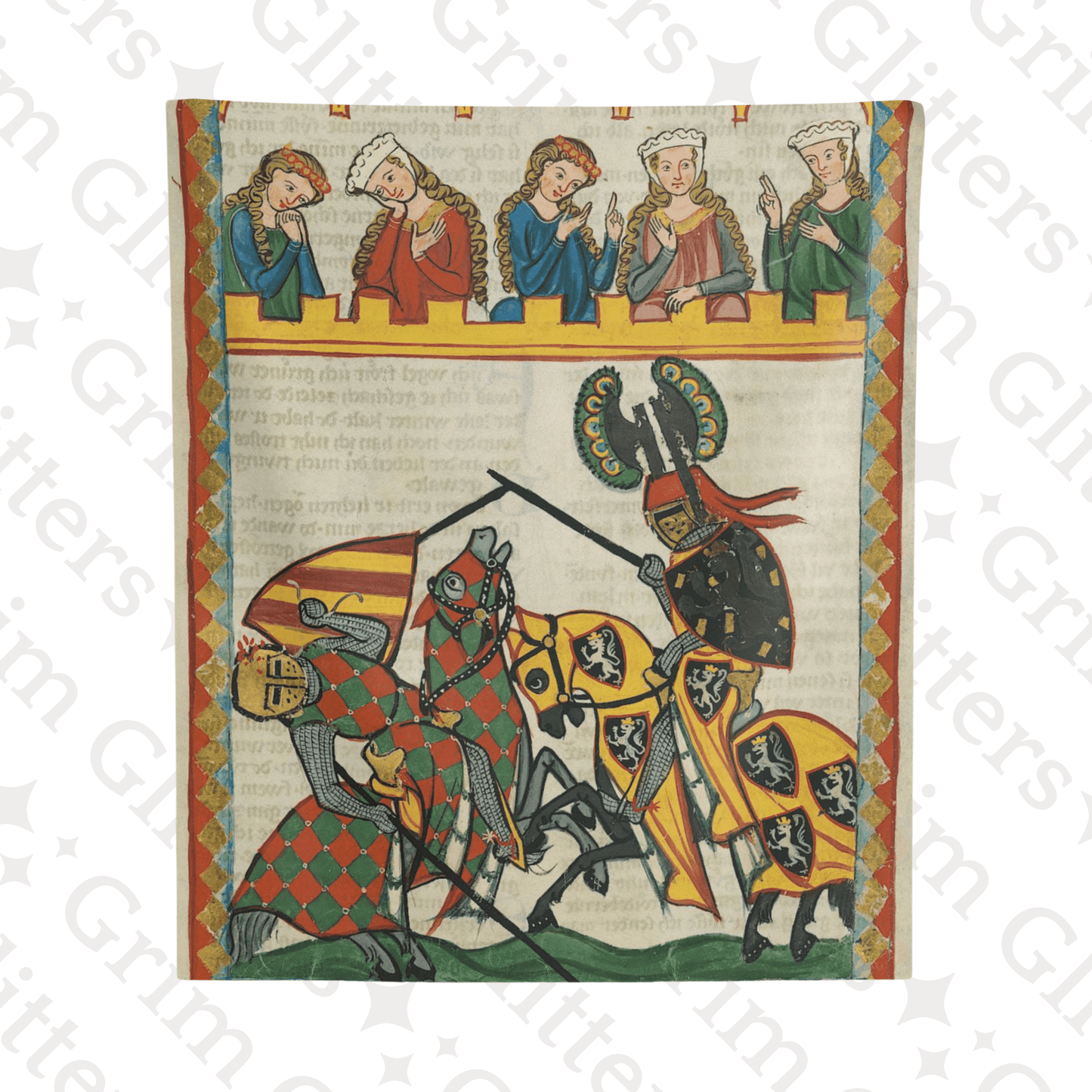 Step back into the chivalric age of the Holy Roman Empire with our Walther von Klingen Tapestry, inspired by the Codex Manesse. This detailed tapestry celebrates the legacy of Walther von Klingen, a knight and poet featured prominently in this medieval manuscript. Perfect for those with an appreciation for history, literature, and the art of the Middle Ages, this piece brings the grandeur of medieval Germany into your home.