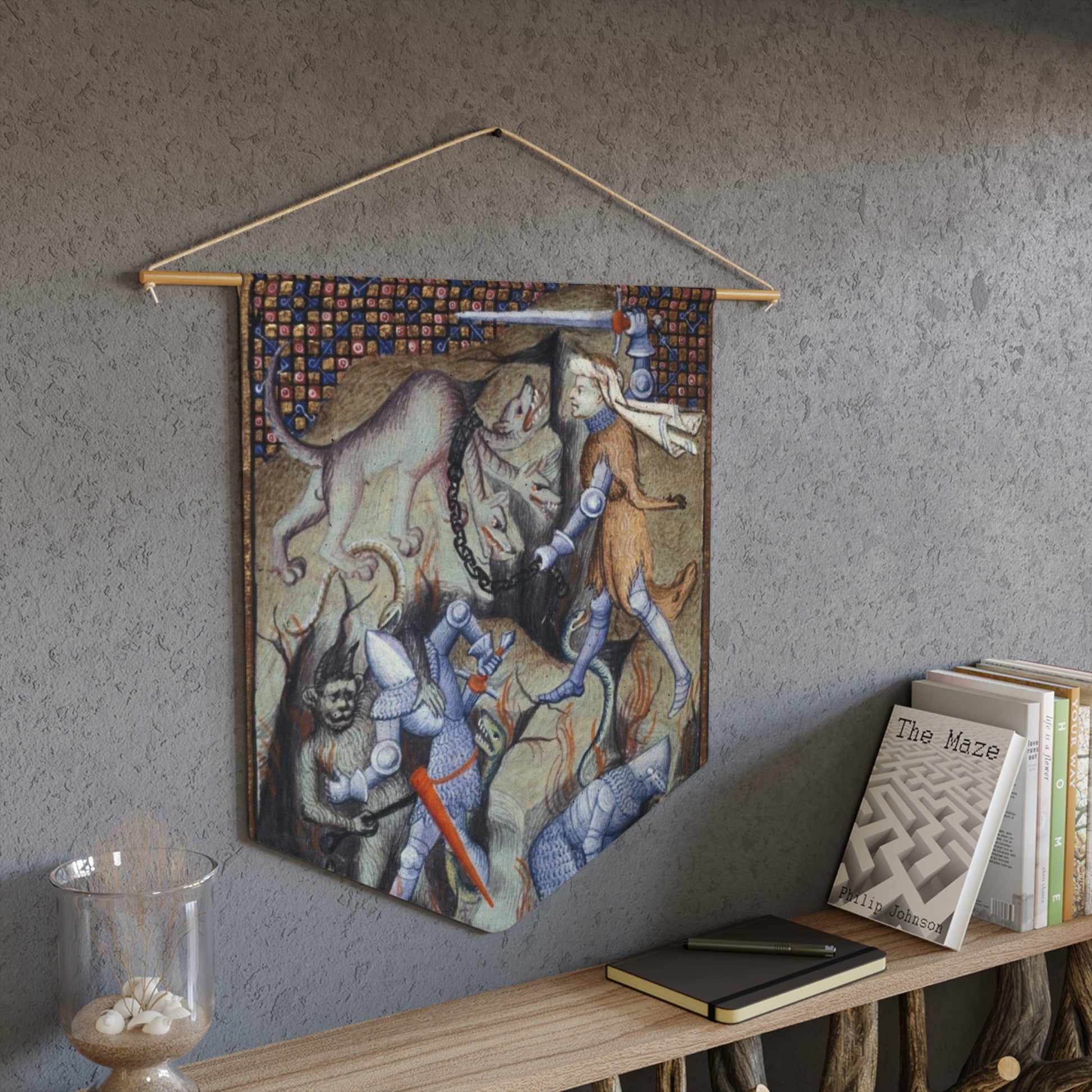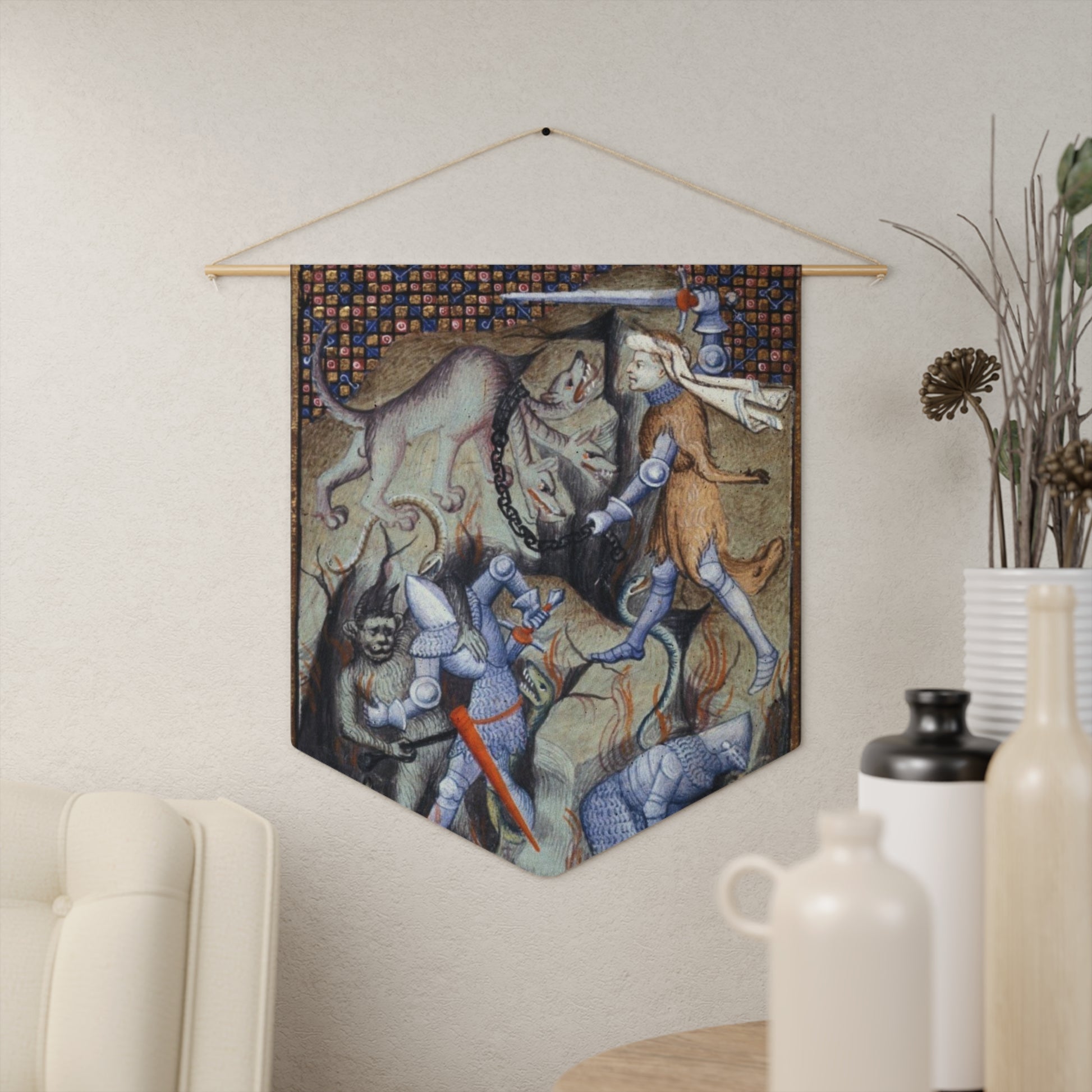 Hercules slaying Cerberus, and Theseus and Pirithous battling demons Pennant Banner - Book of the Queen Manuscript - Medieval French Art